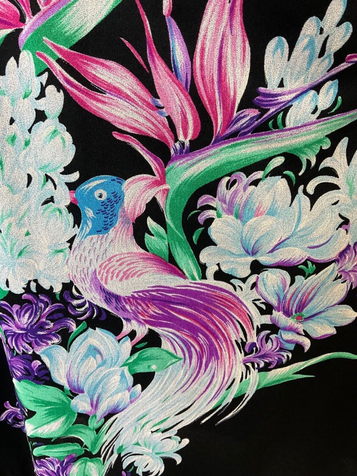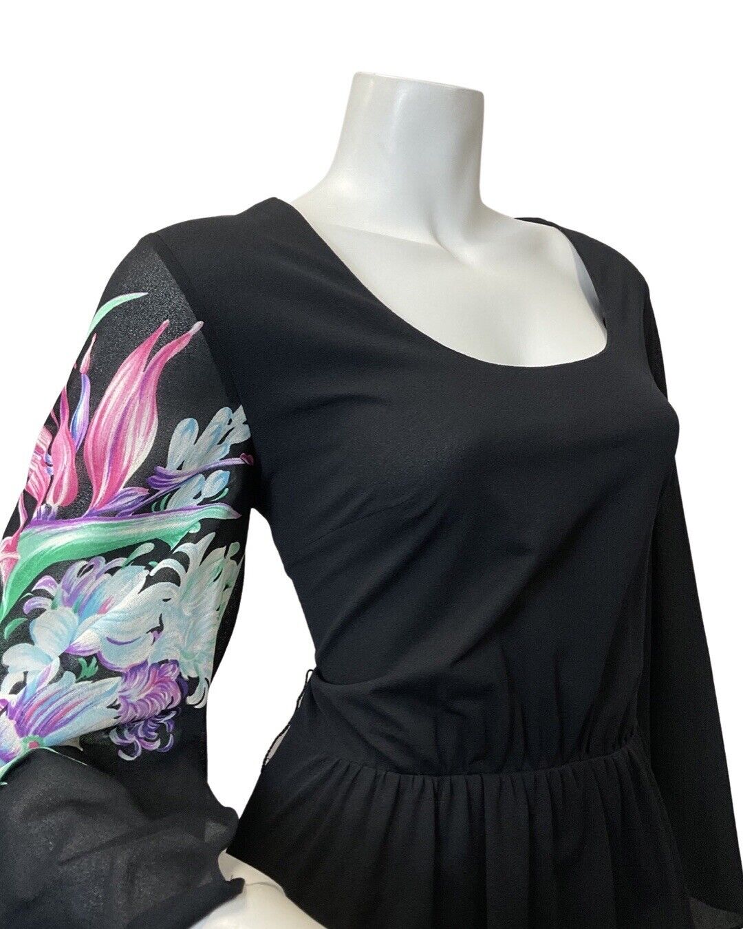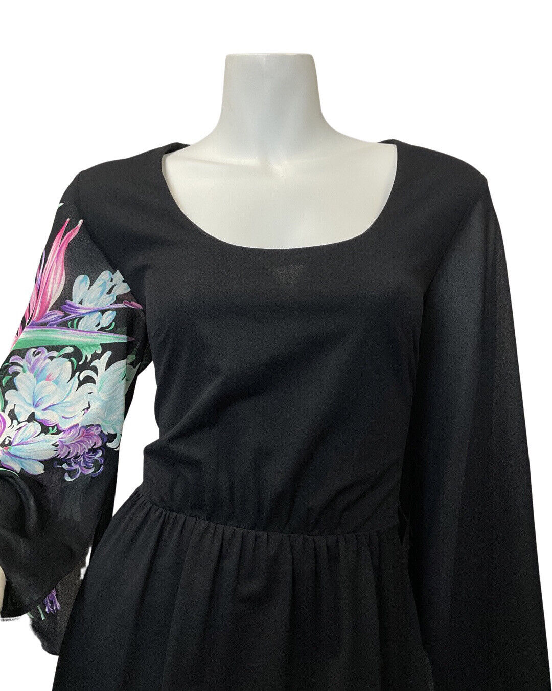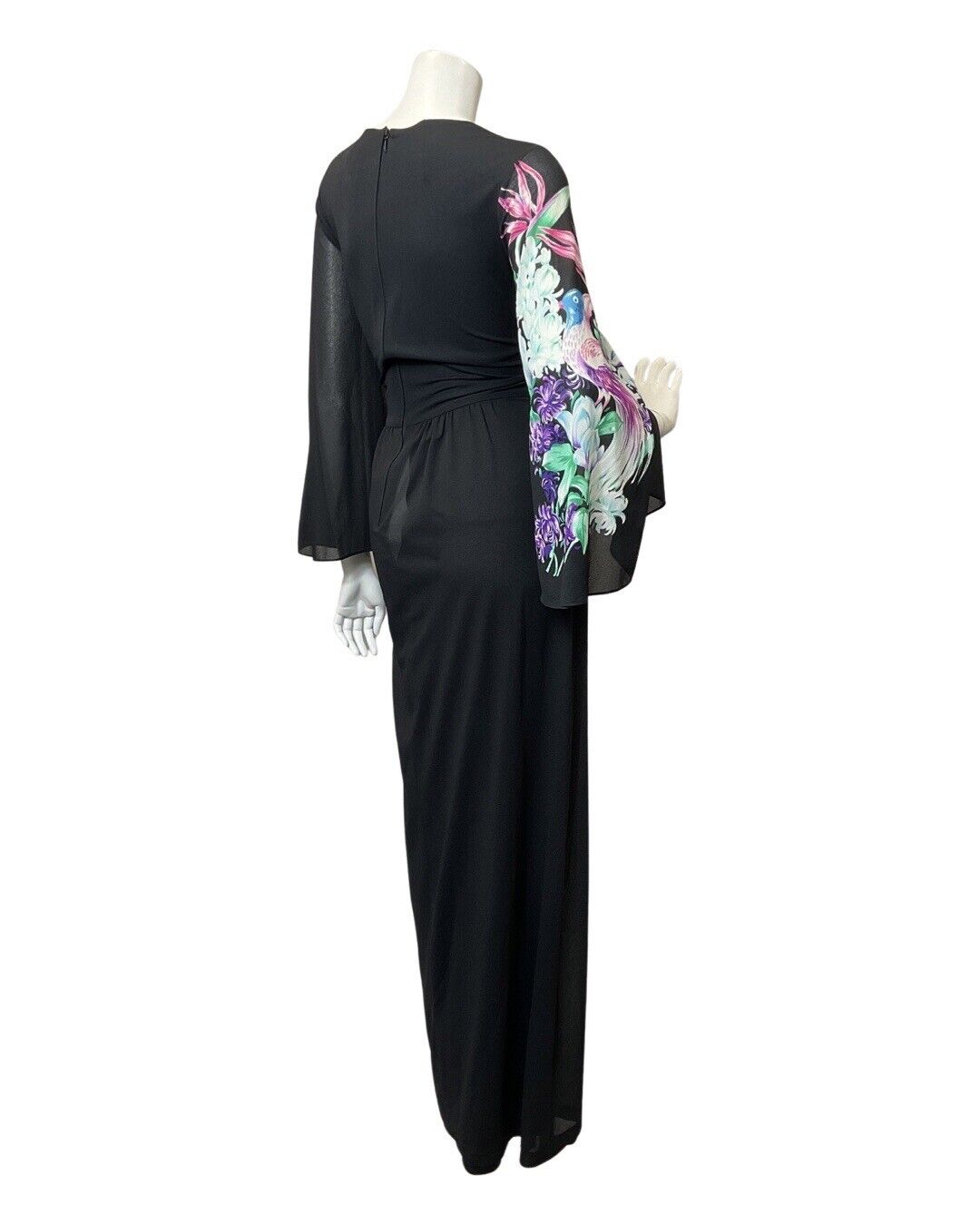 VINTAGE 60s 70s BLACK PURPLE GREEN FLORAL PARADISE BIRD SHEER MAXI DRESS 14