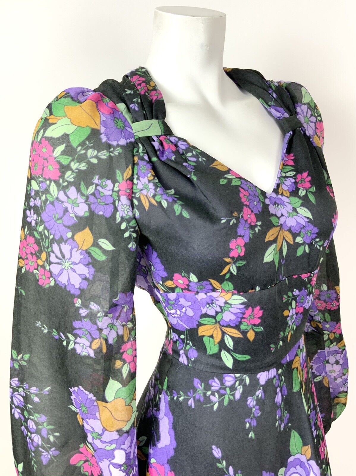 VINTAGE 60s 70s BLACK PURPLE PINK GREEN FLORAL SHEER FLOATY SWEETHEART DRESS 6 8