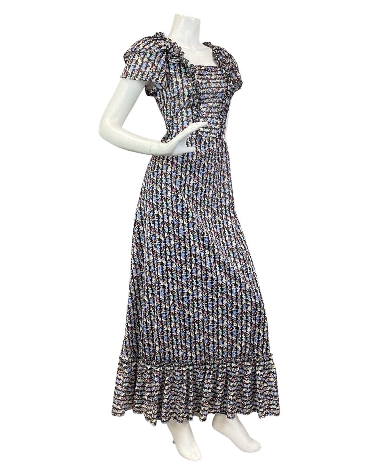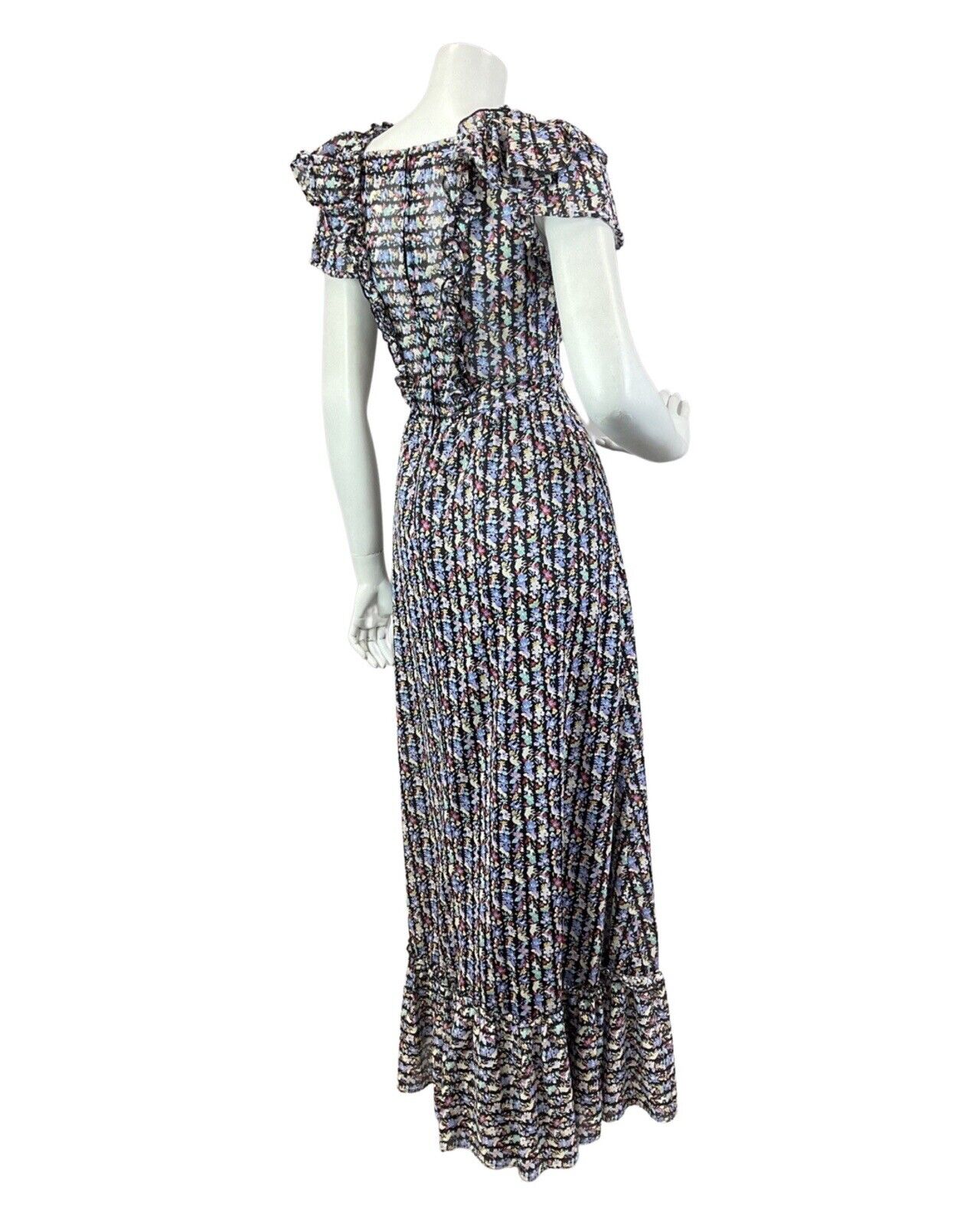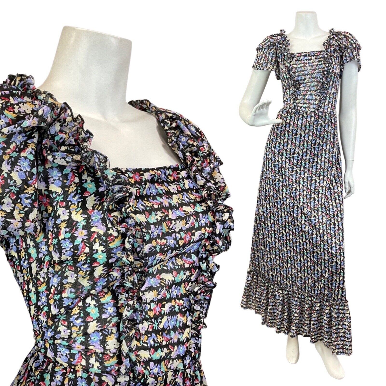 VINTAGE 60s 70s BLACK PURPLE WHITE FLORAL DITSY STRIPED BOHO MAXI DRESS 8 10