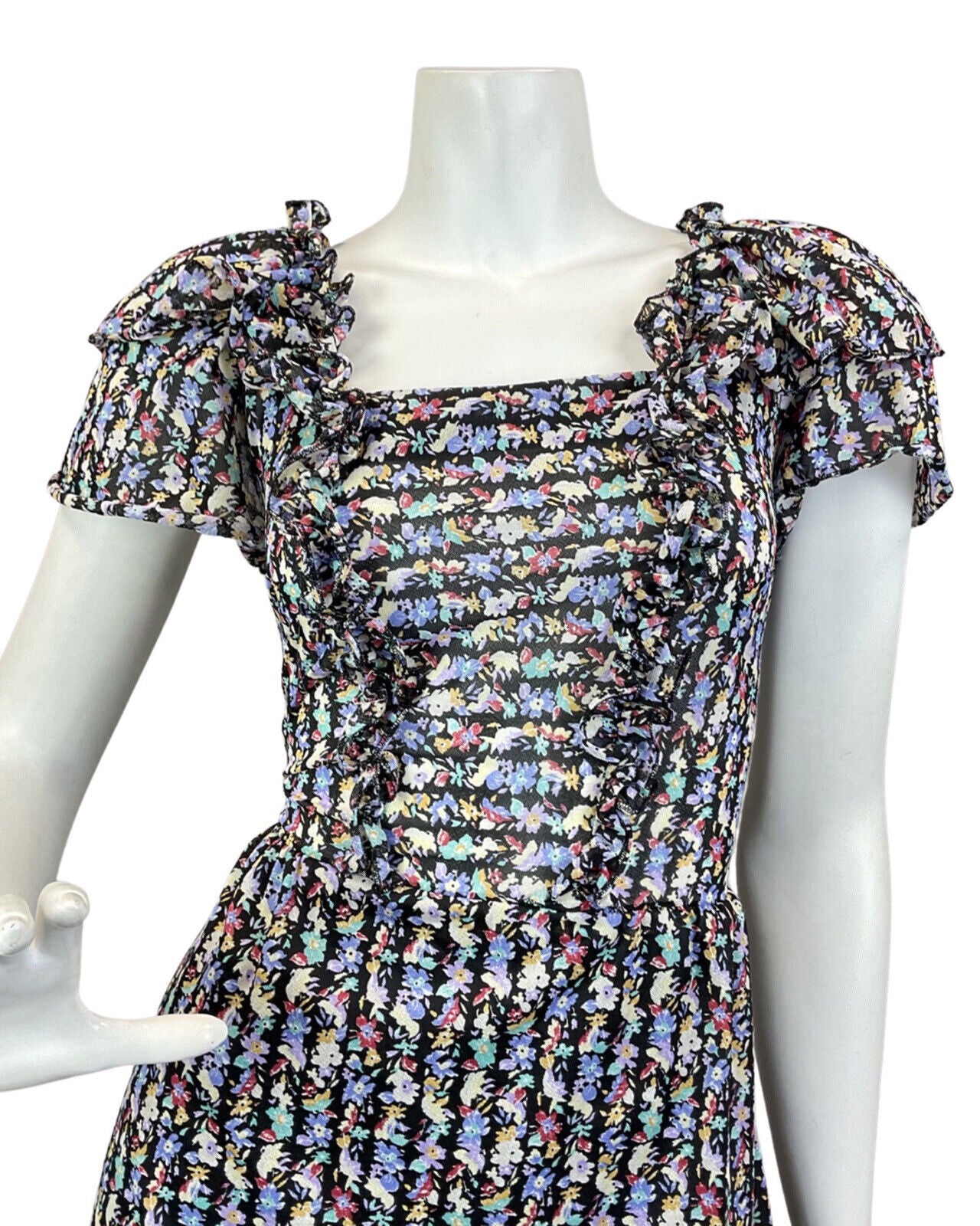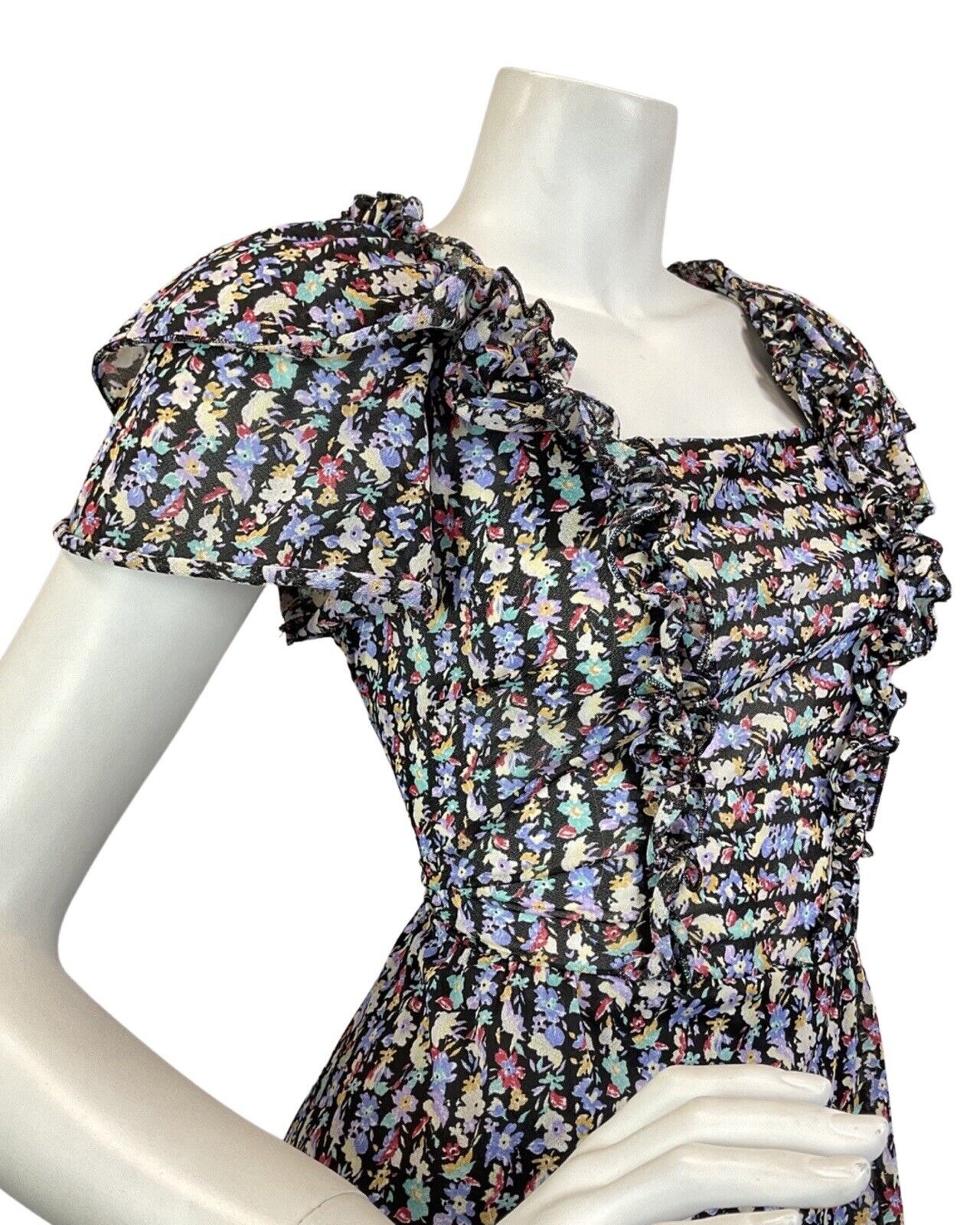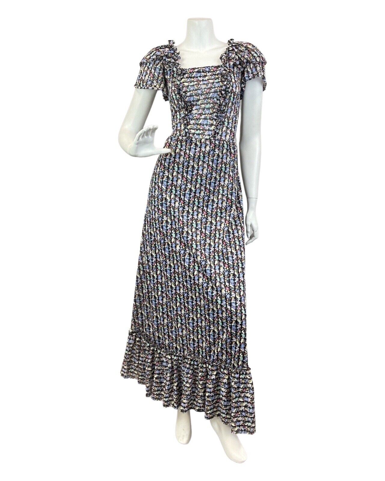 VINTAGE 60s 70s BLACK PURPLE WHITE FLORAL DITSY STRIPED BOHO MAXI DRESS 8 10