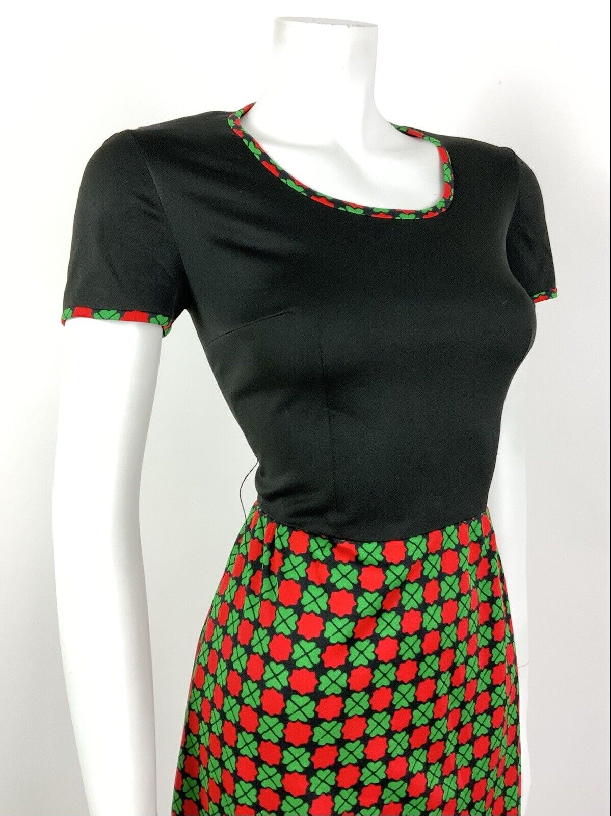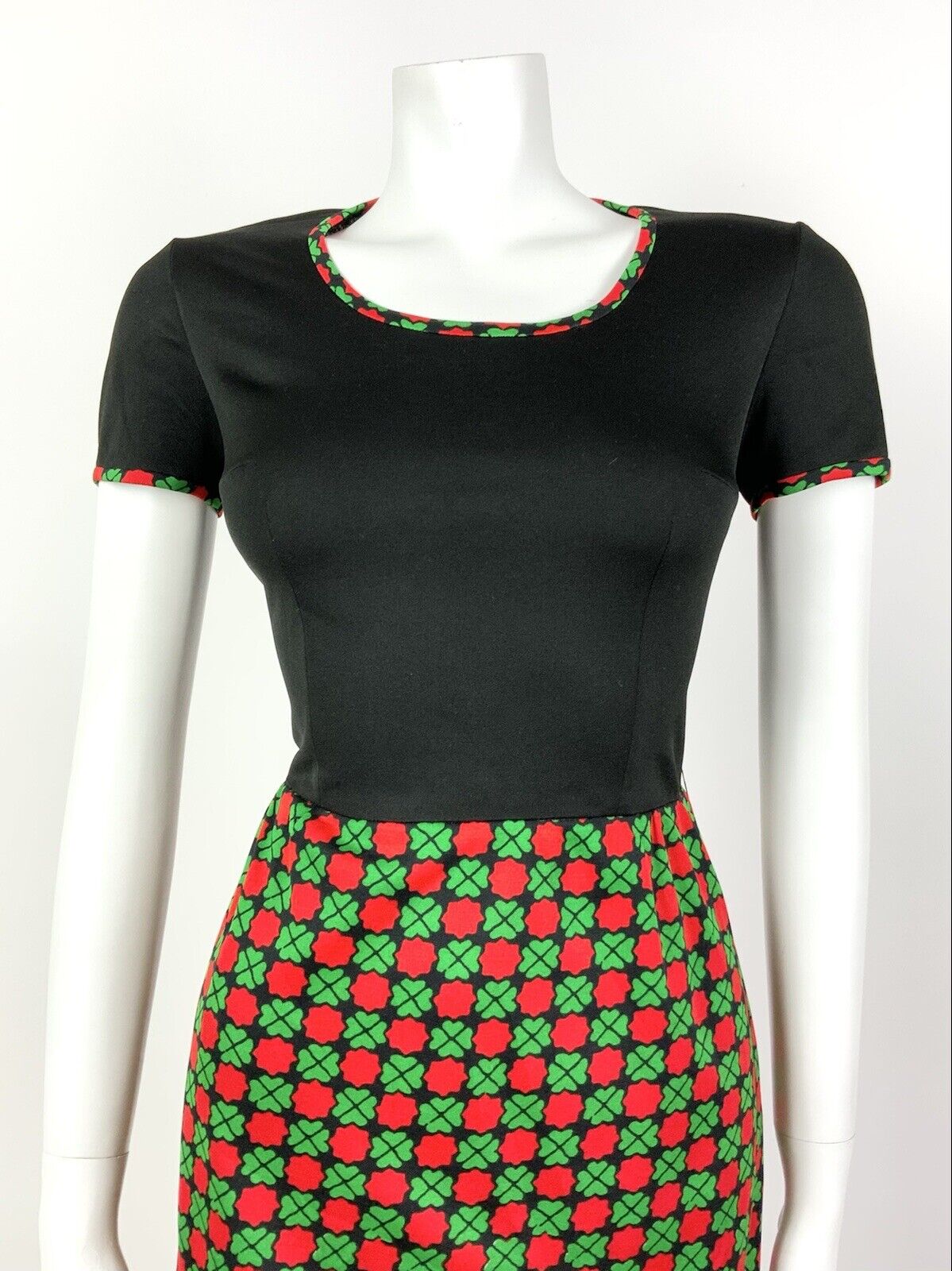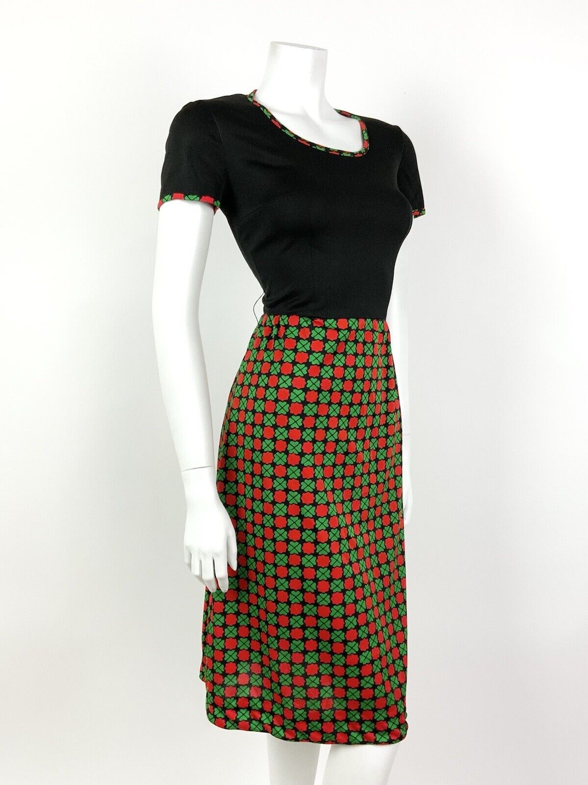 VINTAGE 60s 70s BLACK RED GREEN FLORAL CHECKERBOARD MOD DRESS 10
