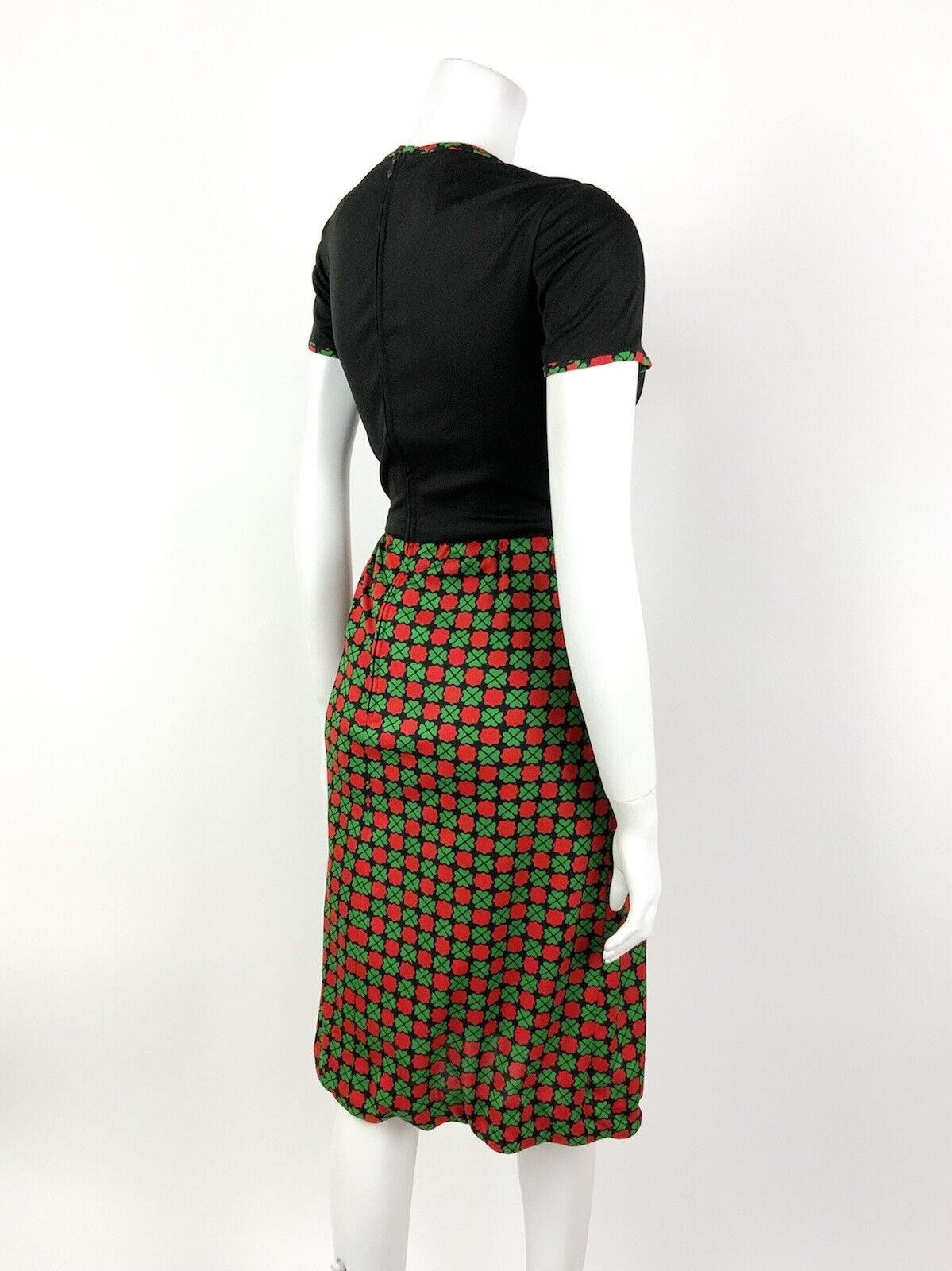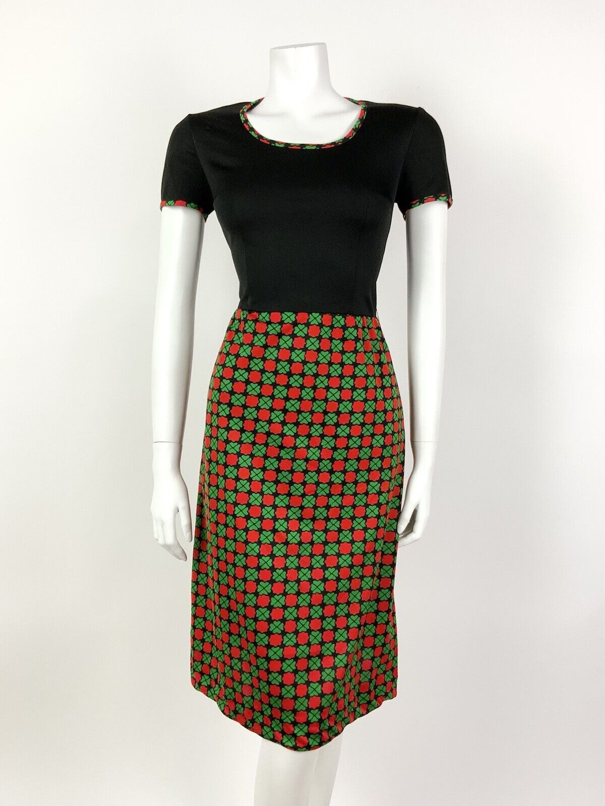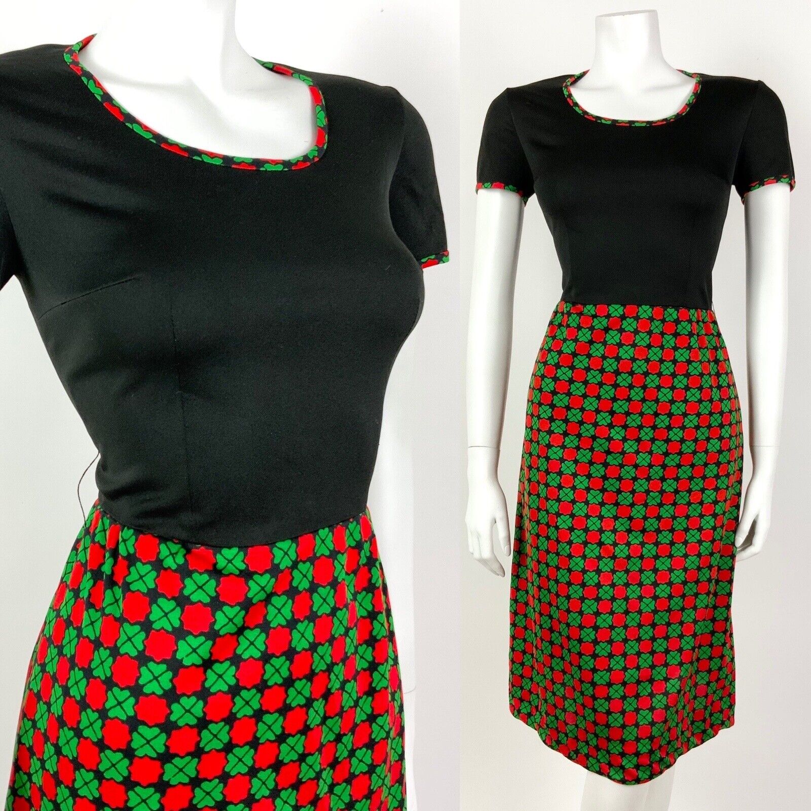 VINTAGE 60s 70s BLACK RED GREEN FLORAL CHECKERBOARD MOD DRESS 10