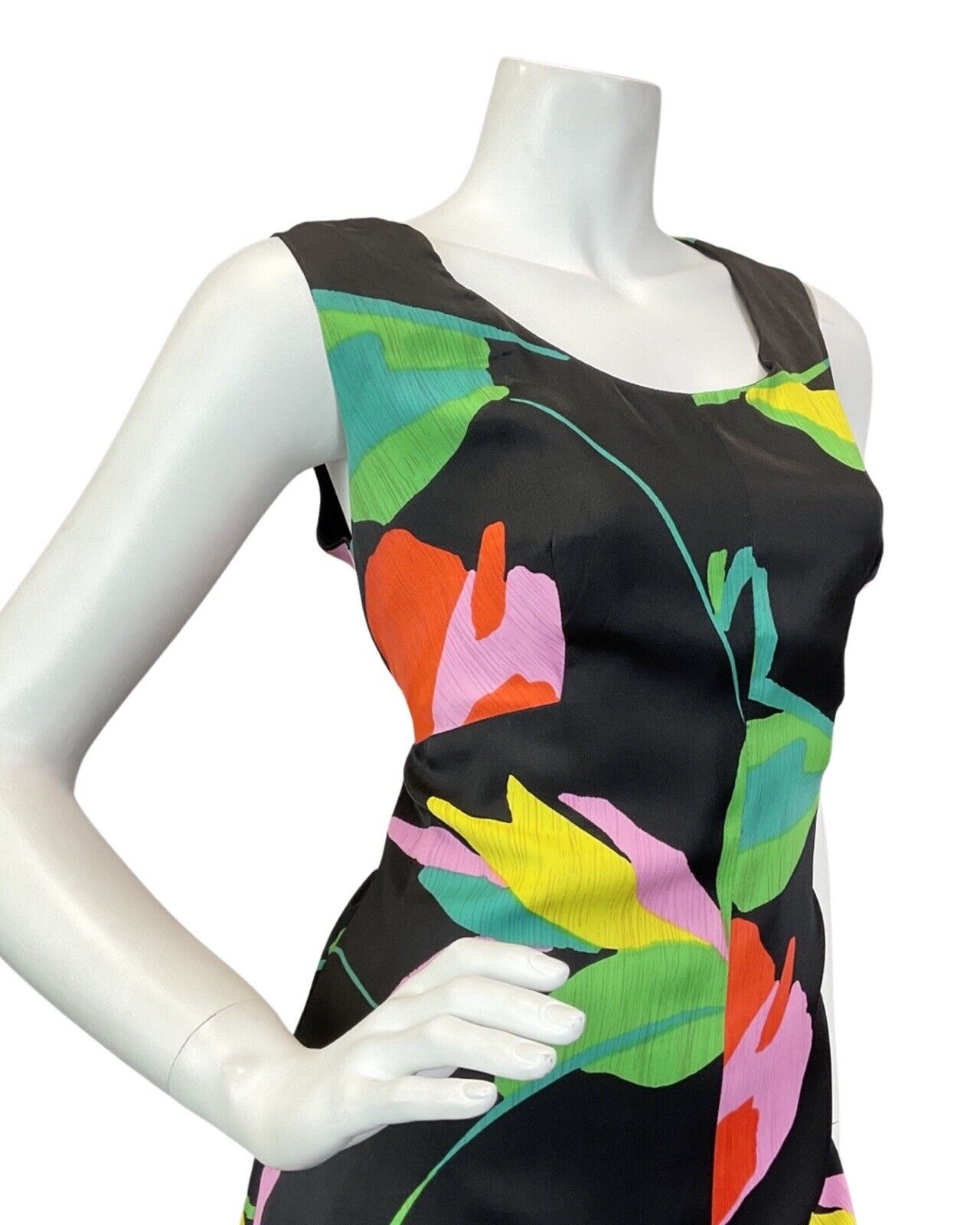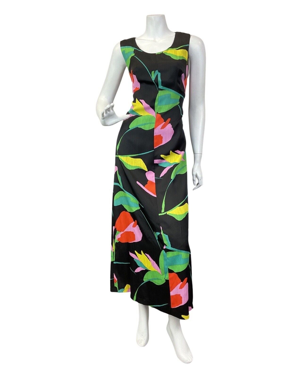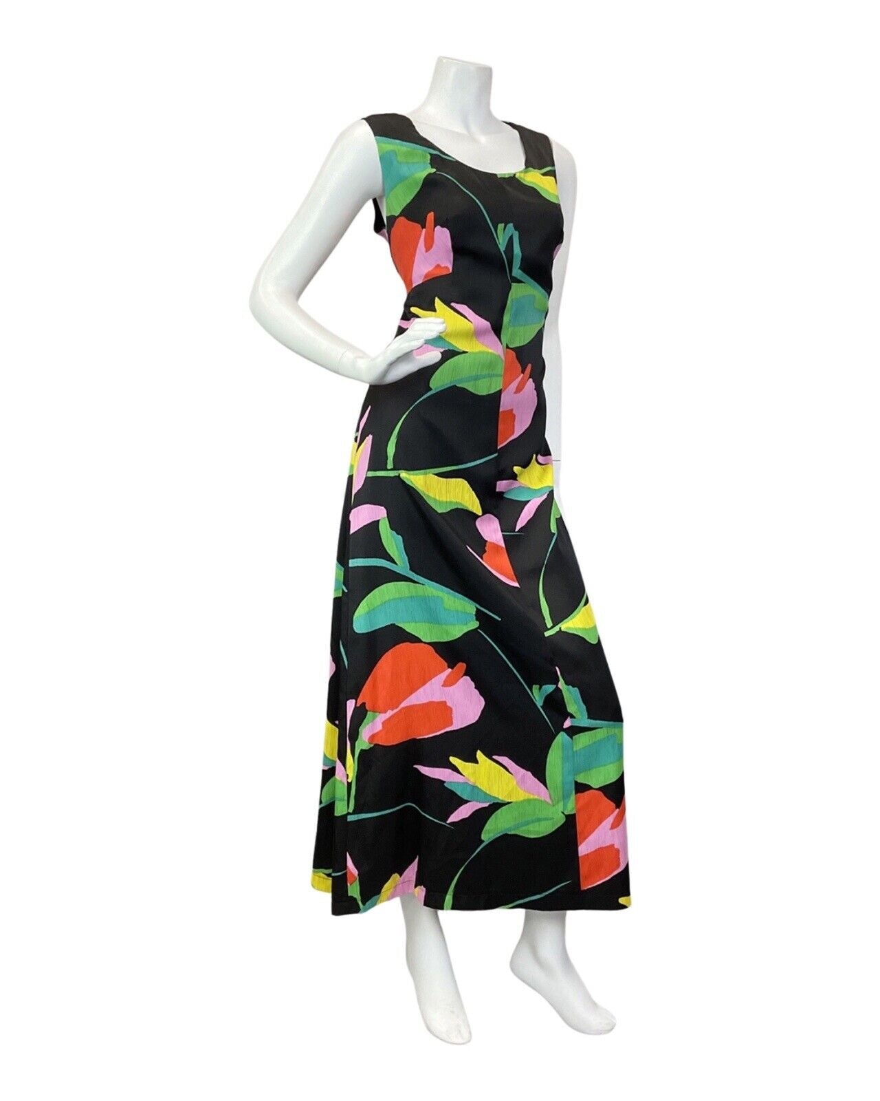 VINTAGE 60s 70s BLACK RED GREEN FLORAL LEAFY SLEEVELESS MOD MAXI DRESS 10 12