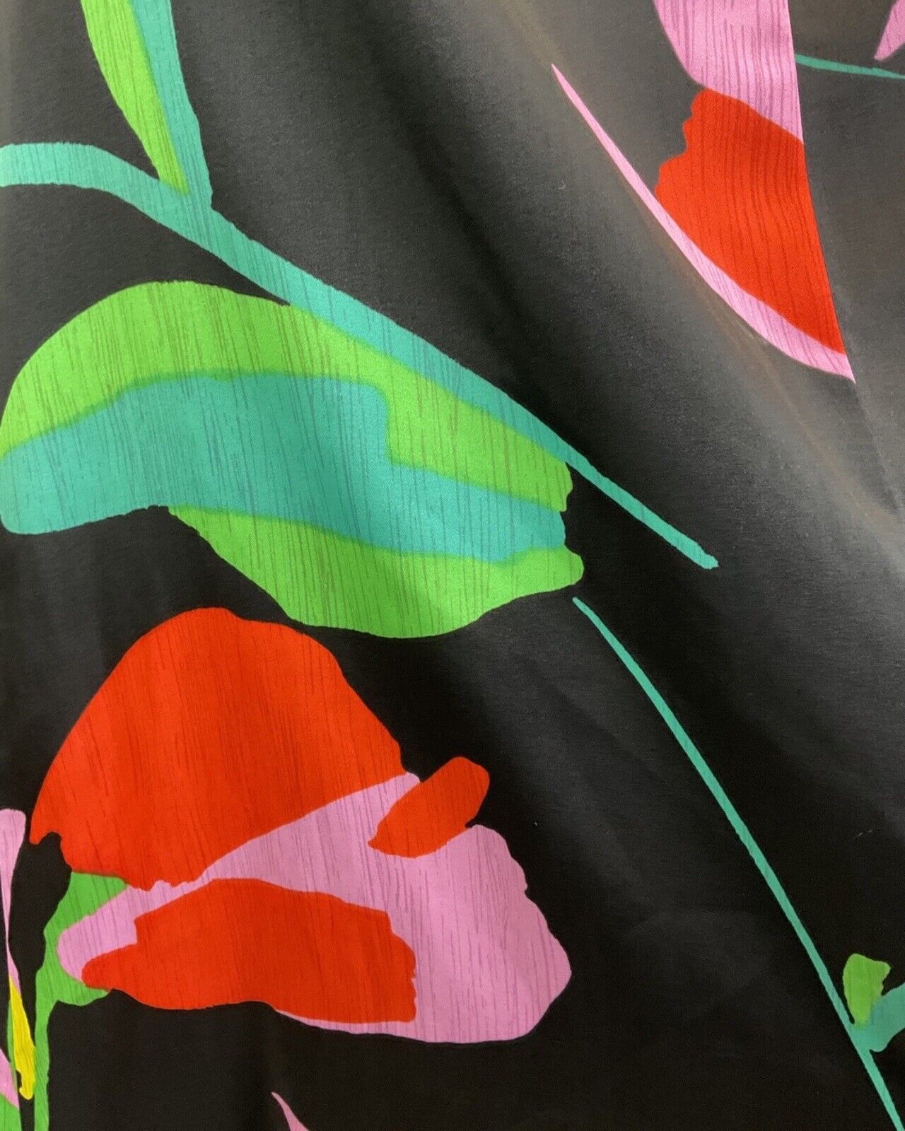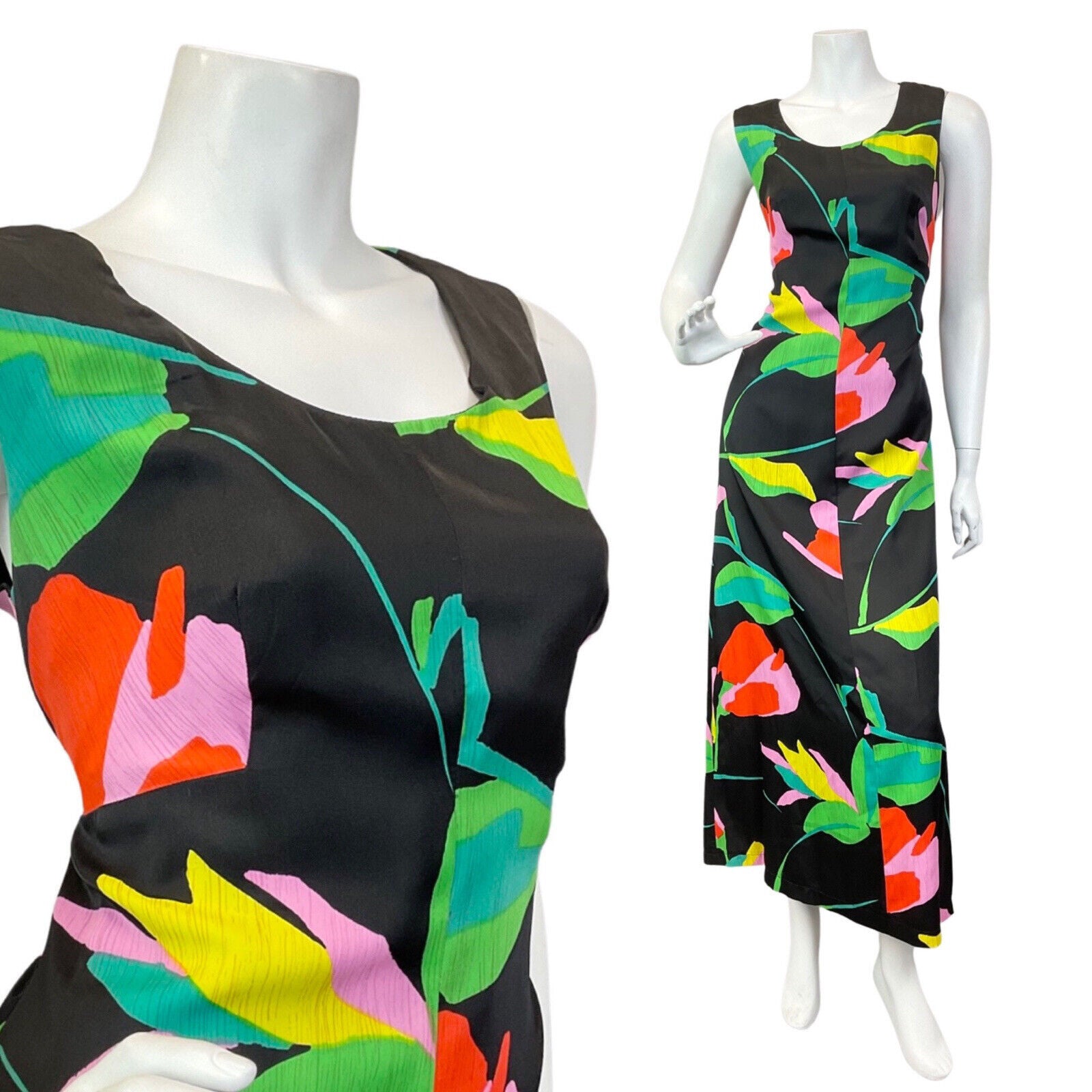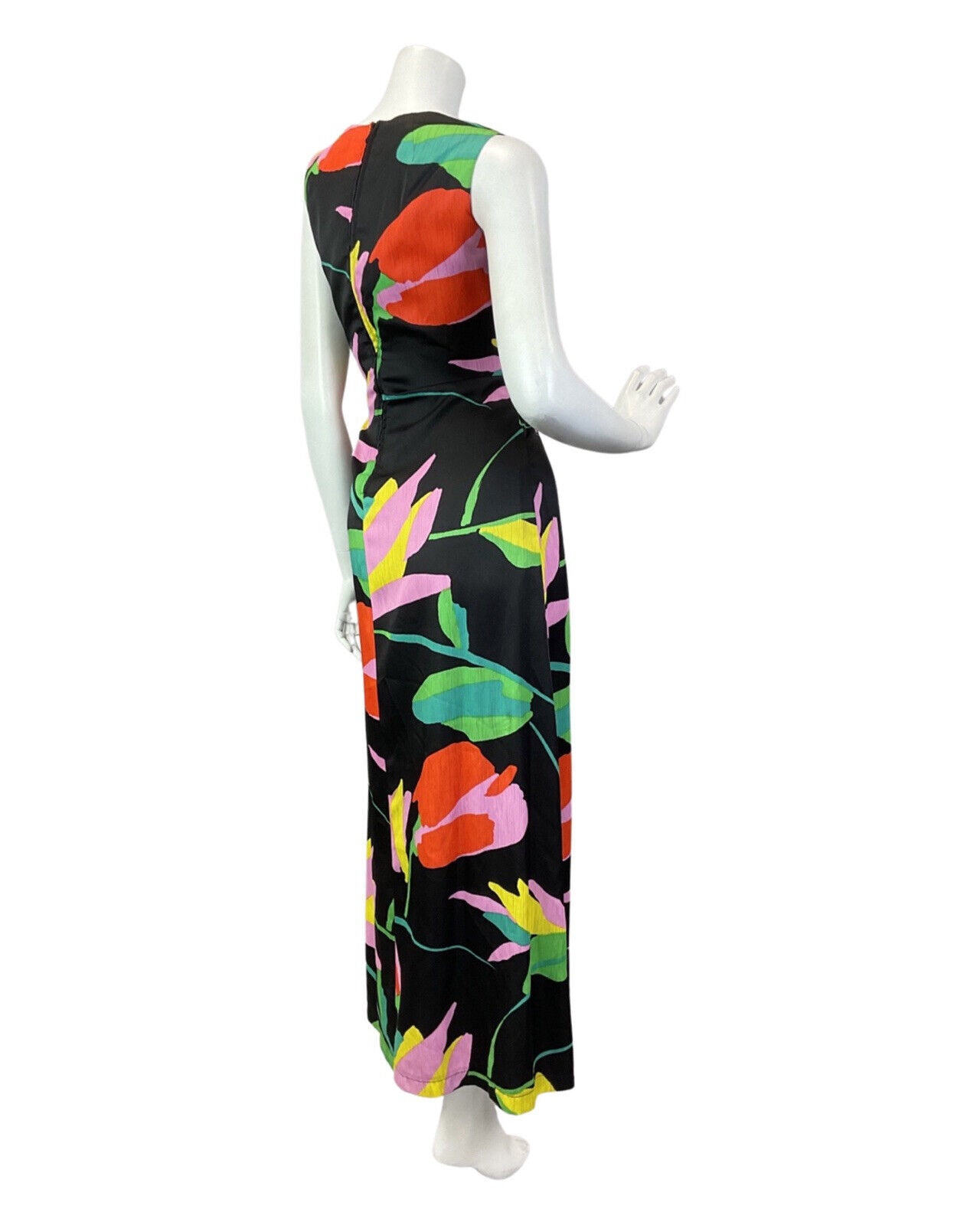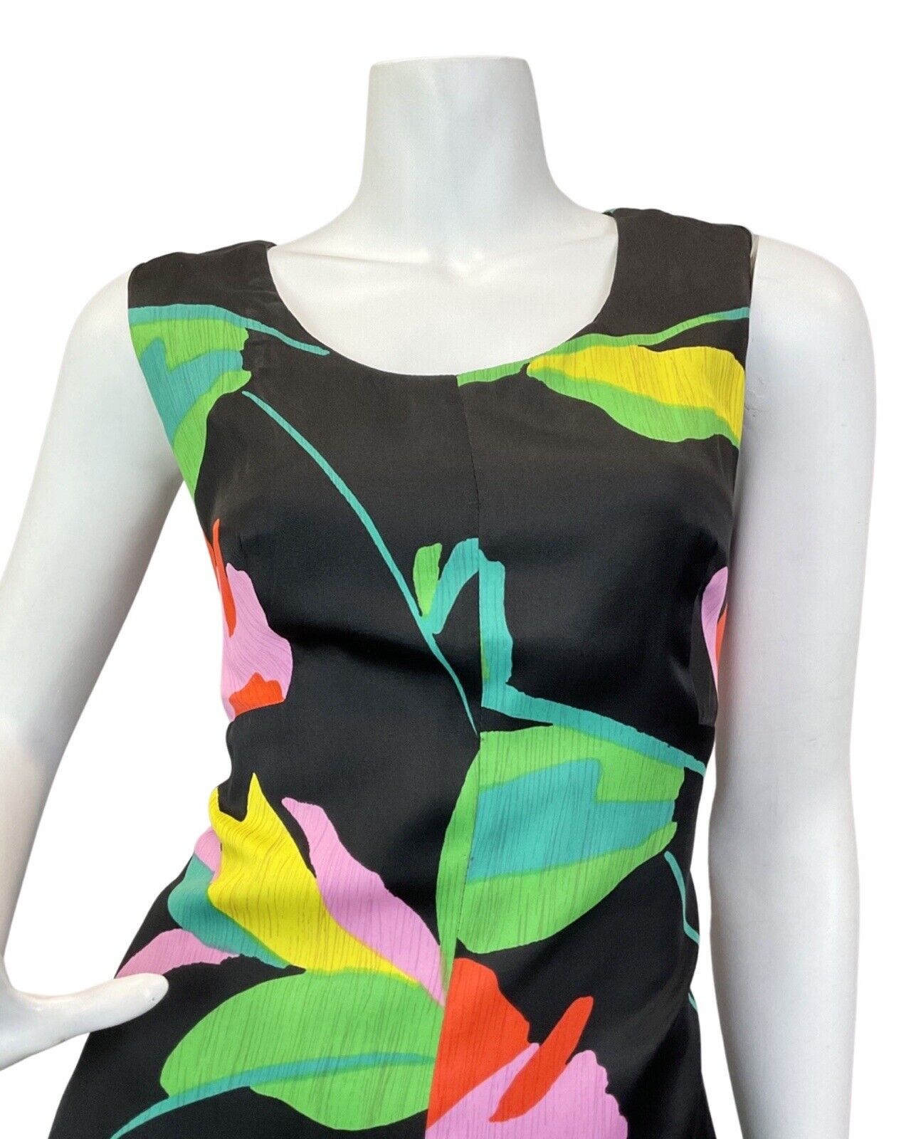 VINTAGE 60s 70s BLACK RED GREEN FLORAL LEAFY SLEEVELESS MOD MAXI DRESS 10 12