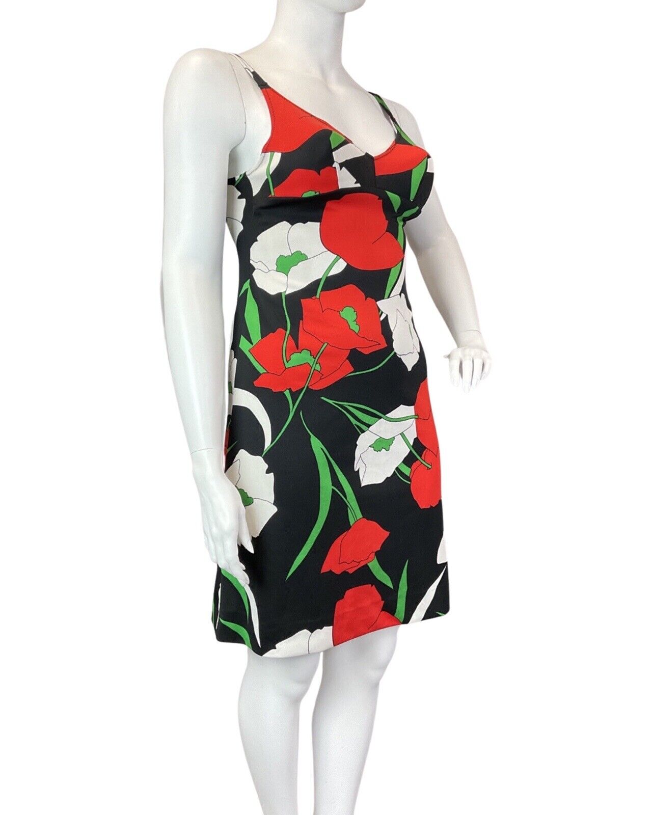 VINTAGE 60s 70s BLACK RED GREEN POPPY FLOWER STRAPPY SUN-DRESS 14