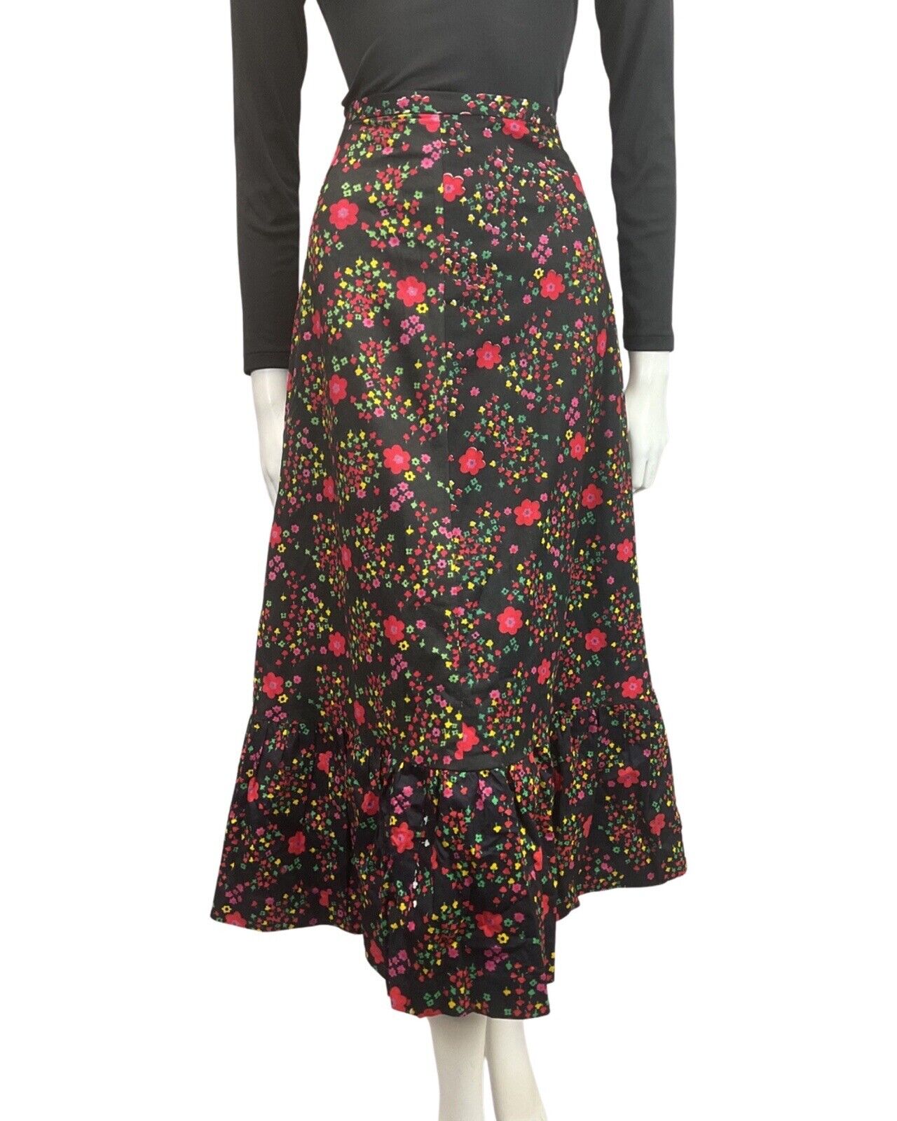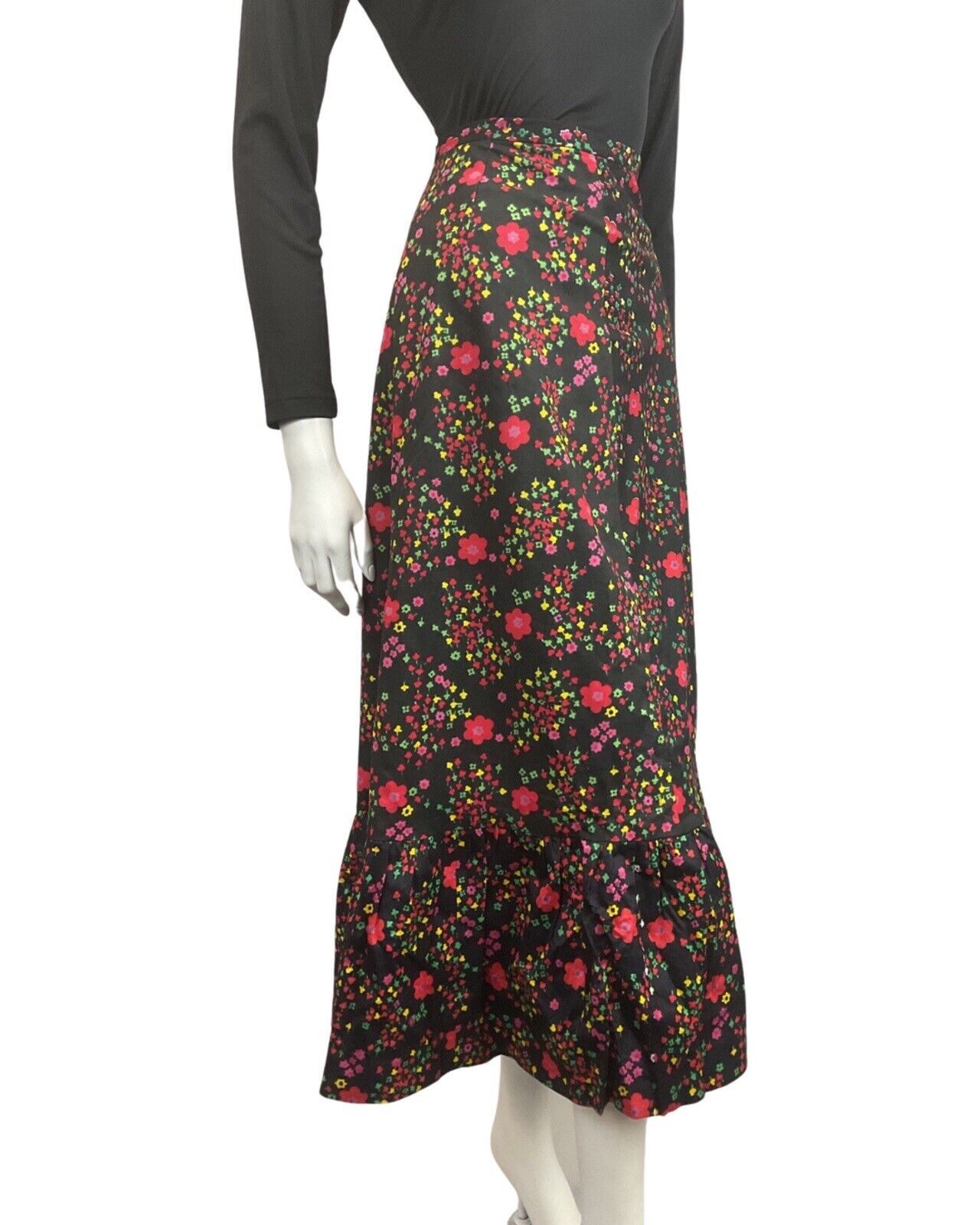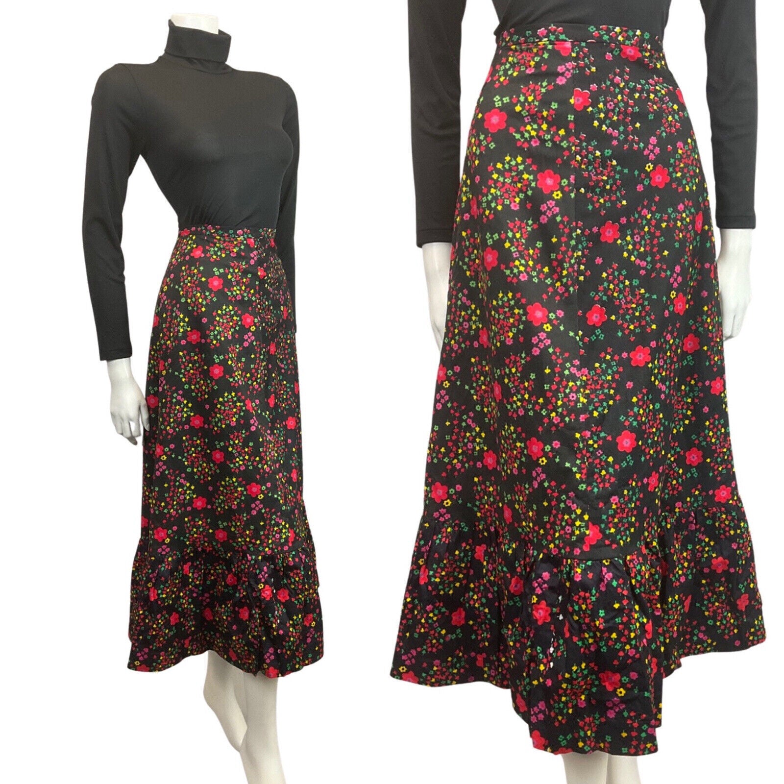 VINTAGE 60s 70s BLACK RED PINK GREEN FLORAL DAISY MOD BOHO MAXI SKIRT 8
