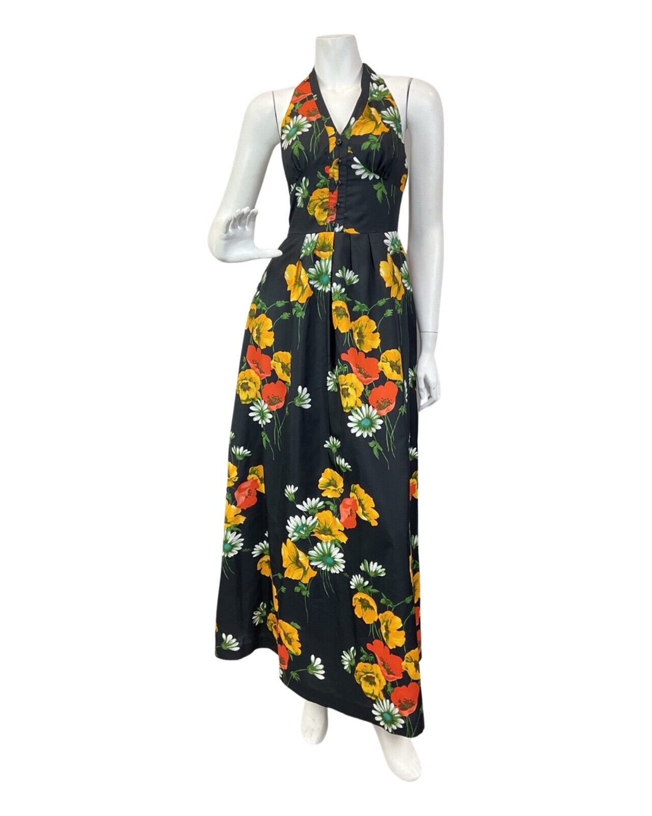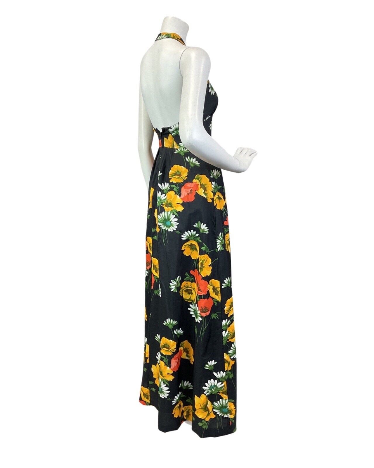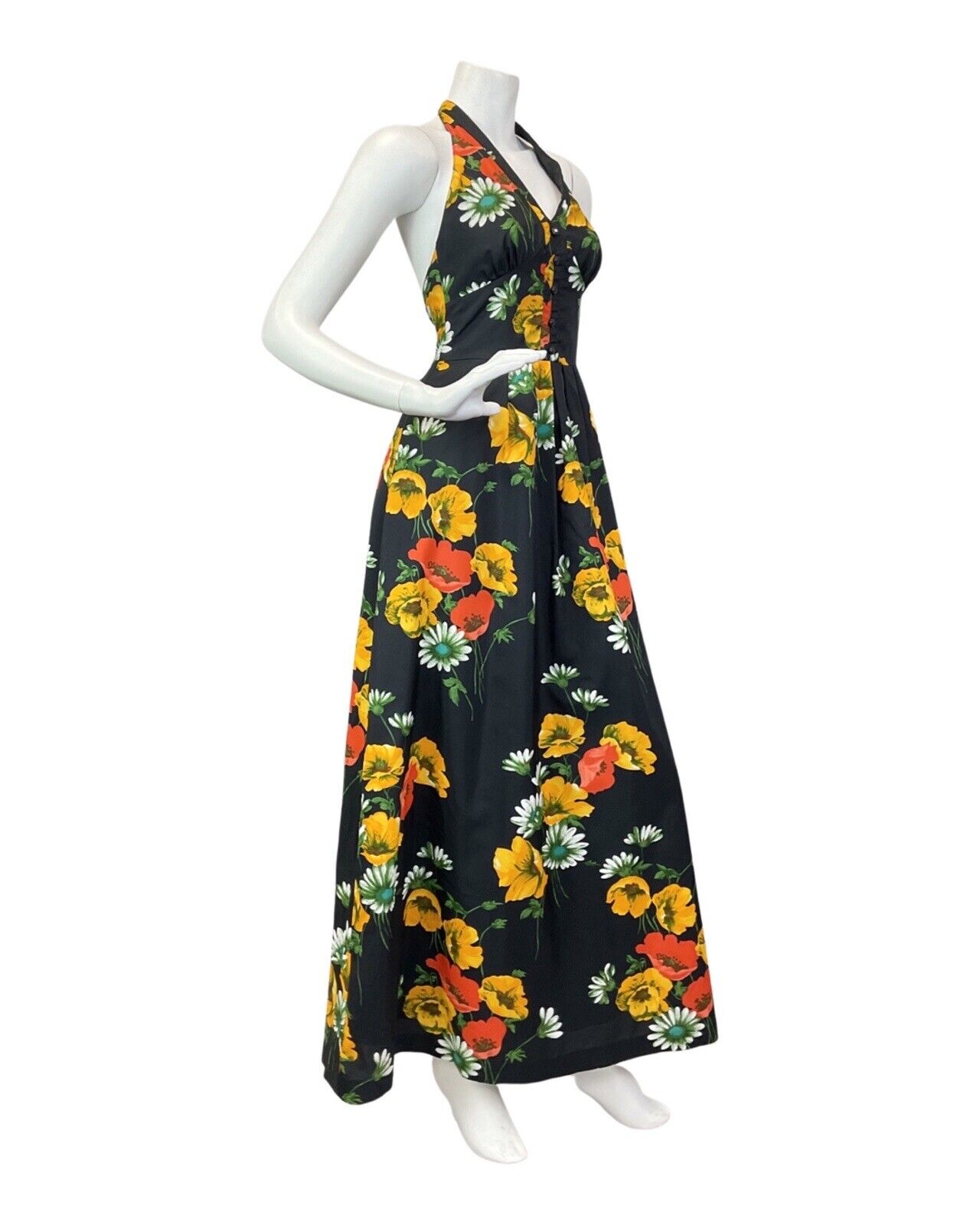 VINTAGE 60s 70s BLACK RED YELLOW POPPY DAISY FLOWER HALTER MAXI DRESS 4
