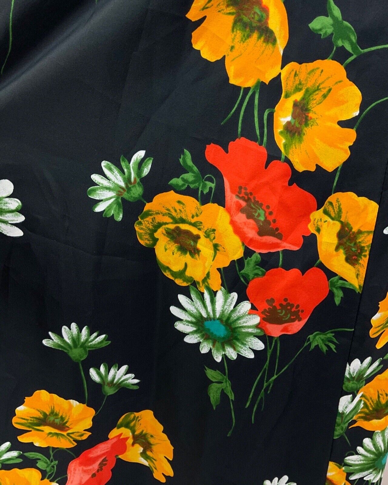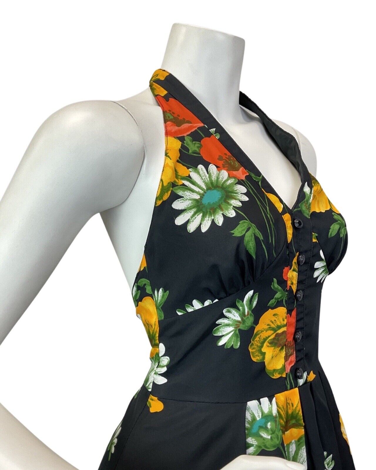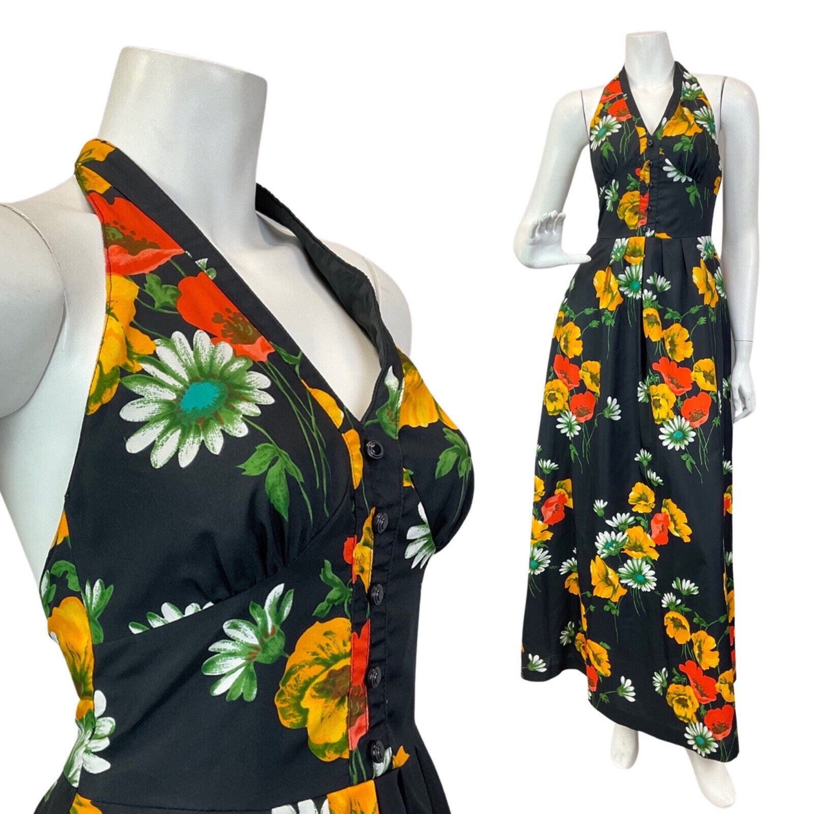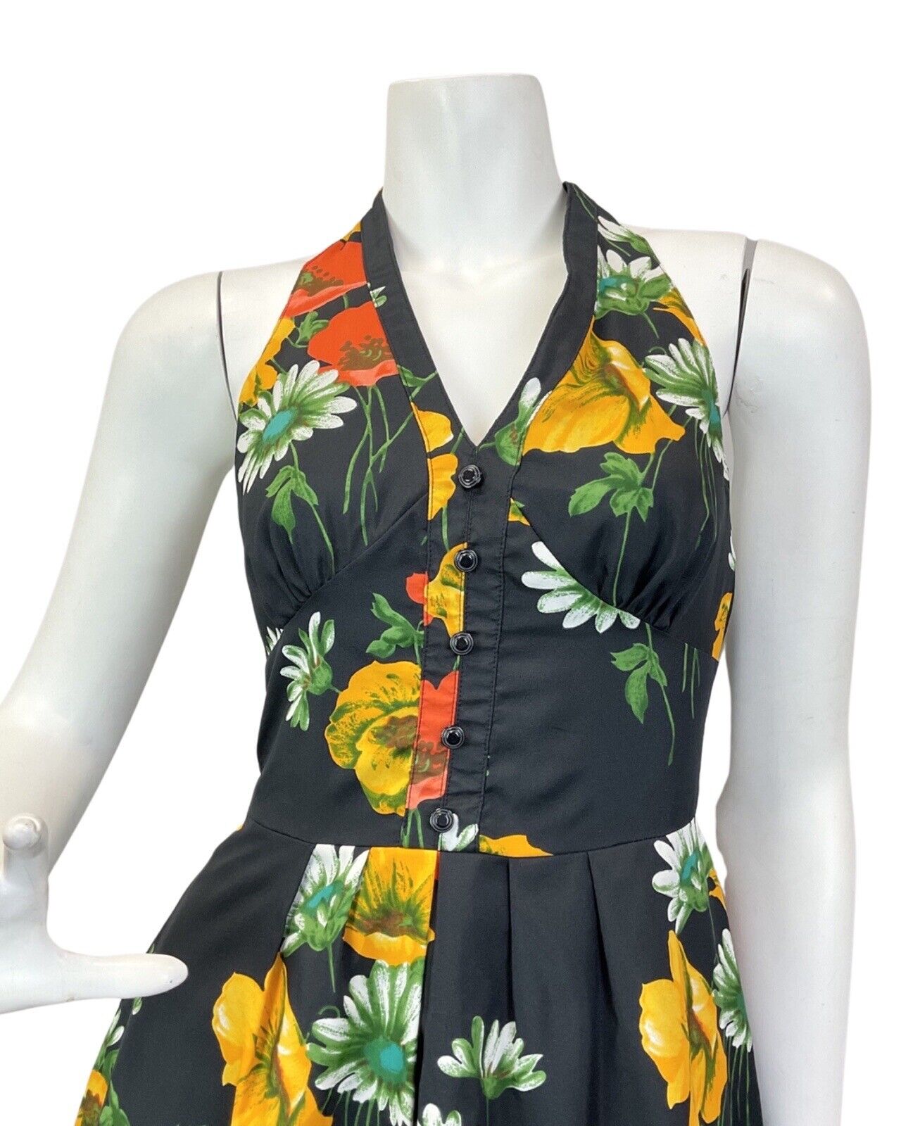 VINTAGE 60s 70s BLACK RED YELLOW POPPY DAISY FLOWER HALTER MAXI DRESS 4