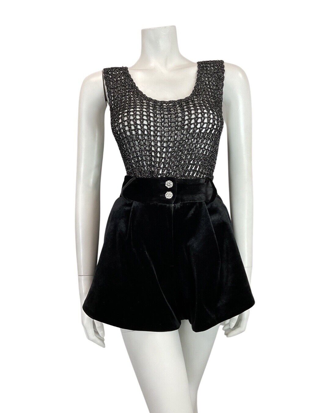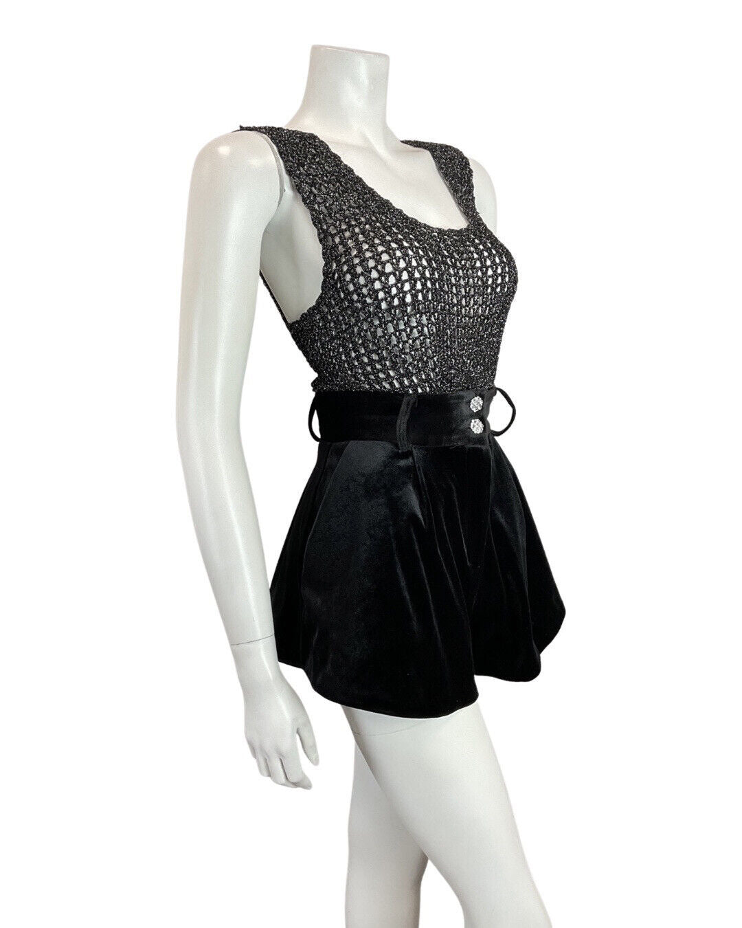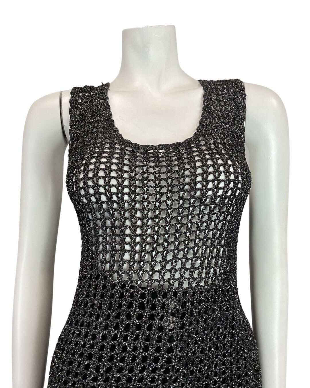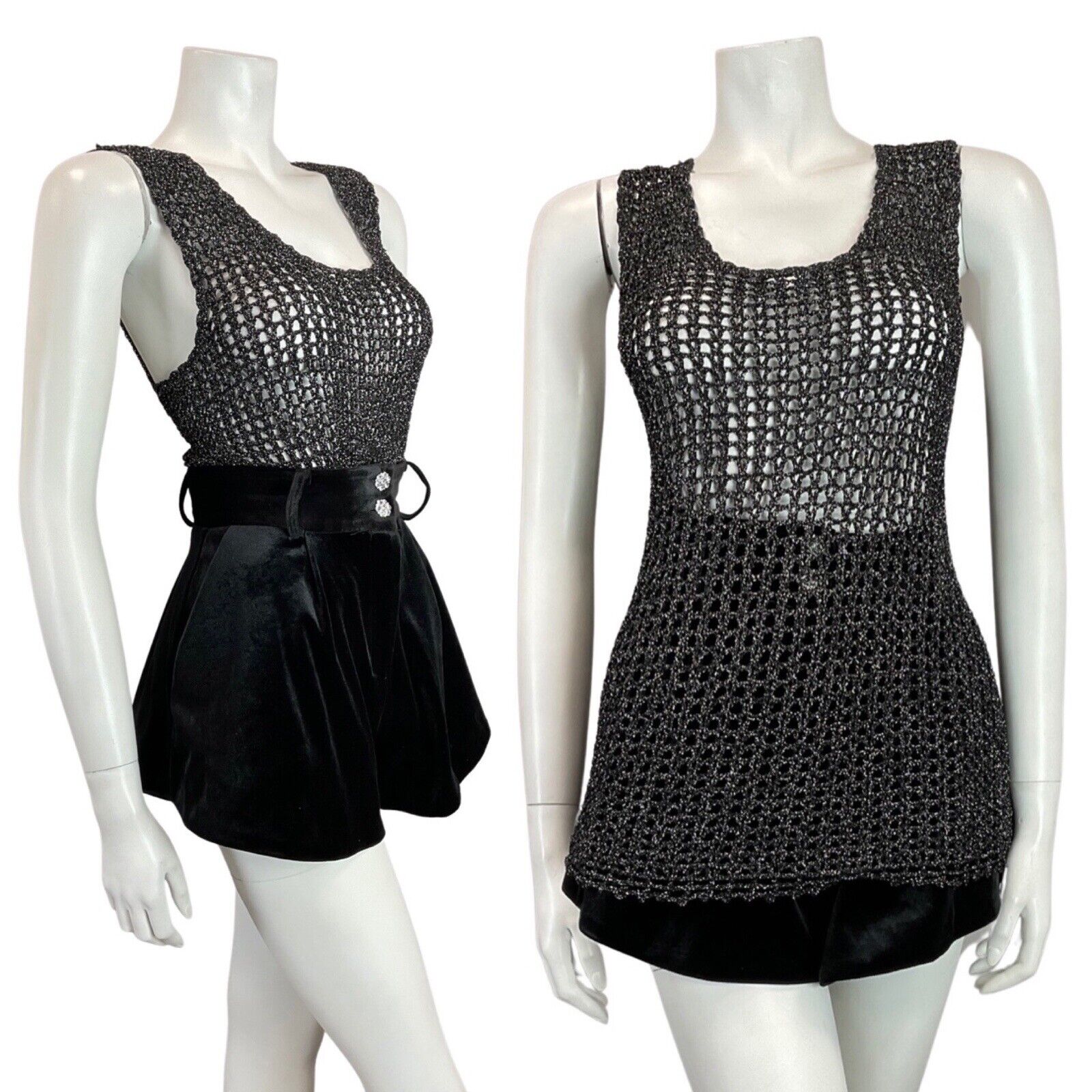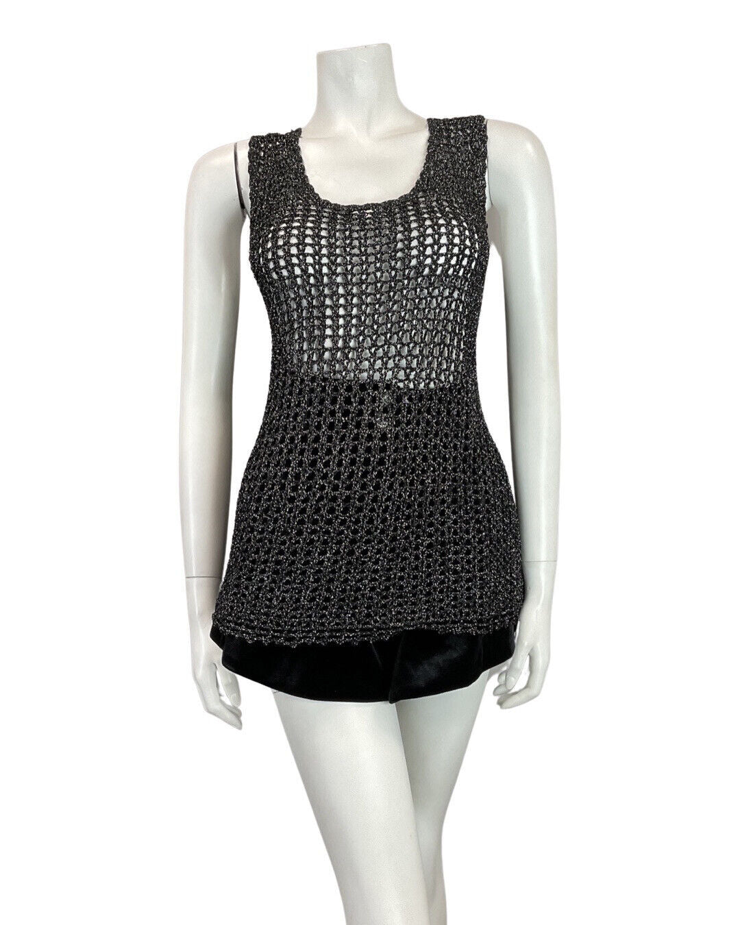 VINTAGE 60s 70s BLACK SILVER CROCHETED KNITTED DISCO PARTY VEST TOP 10 12