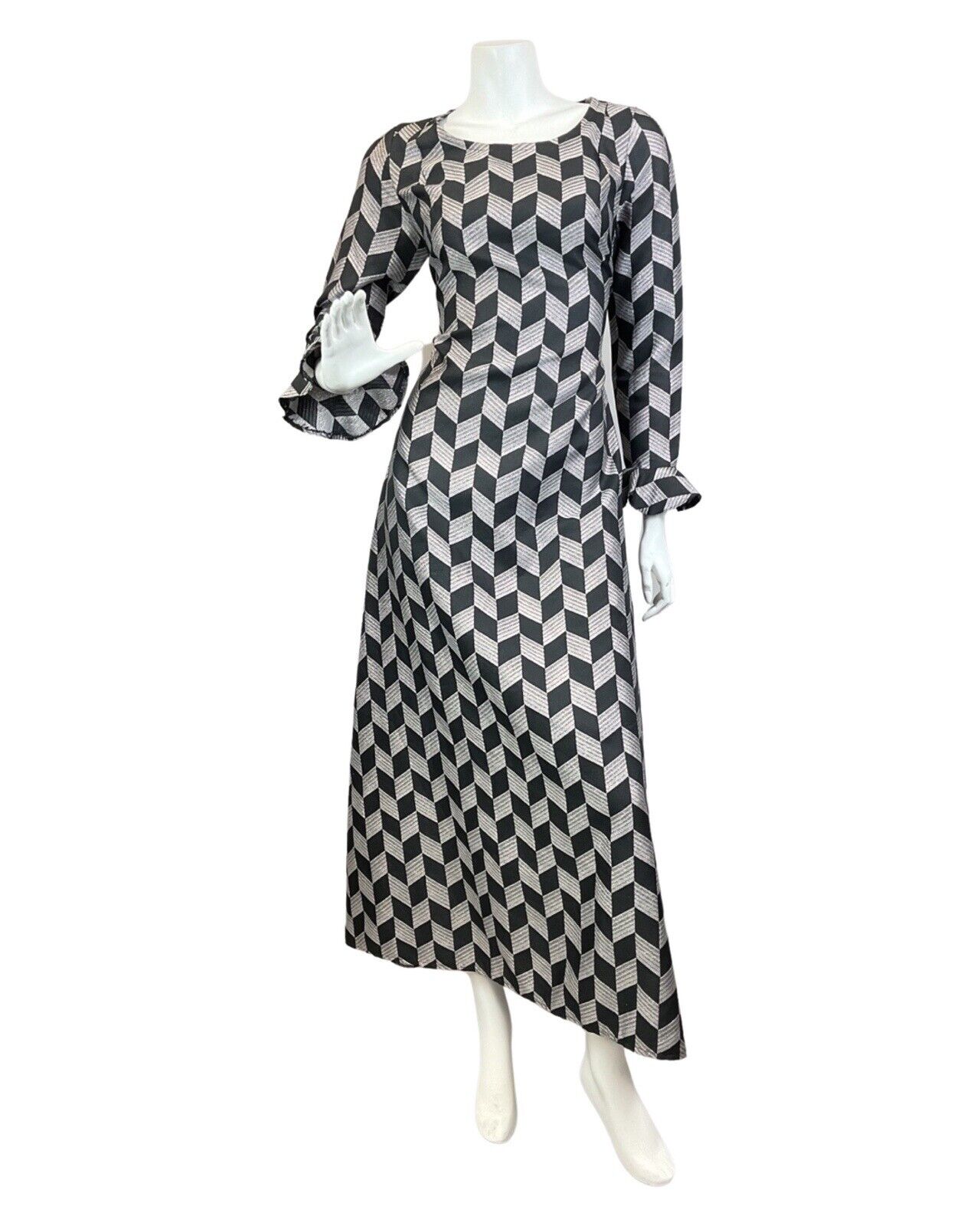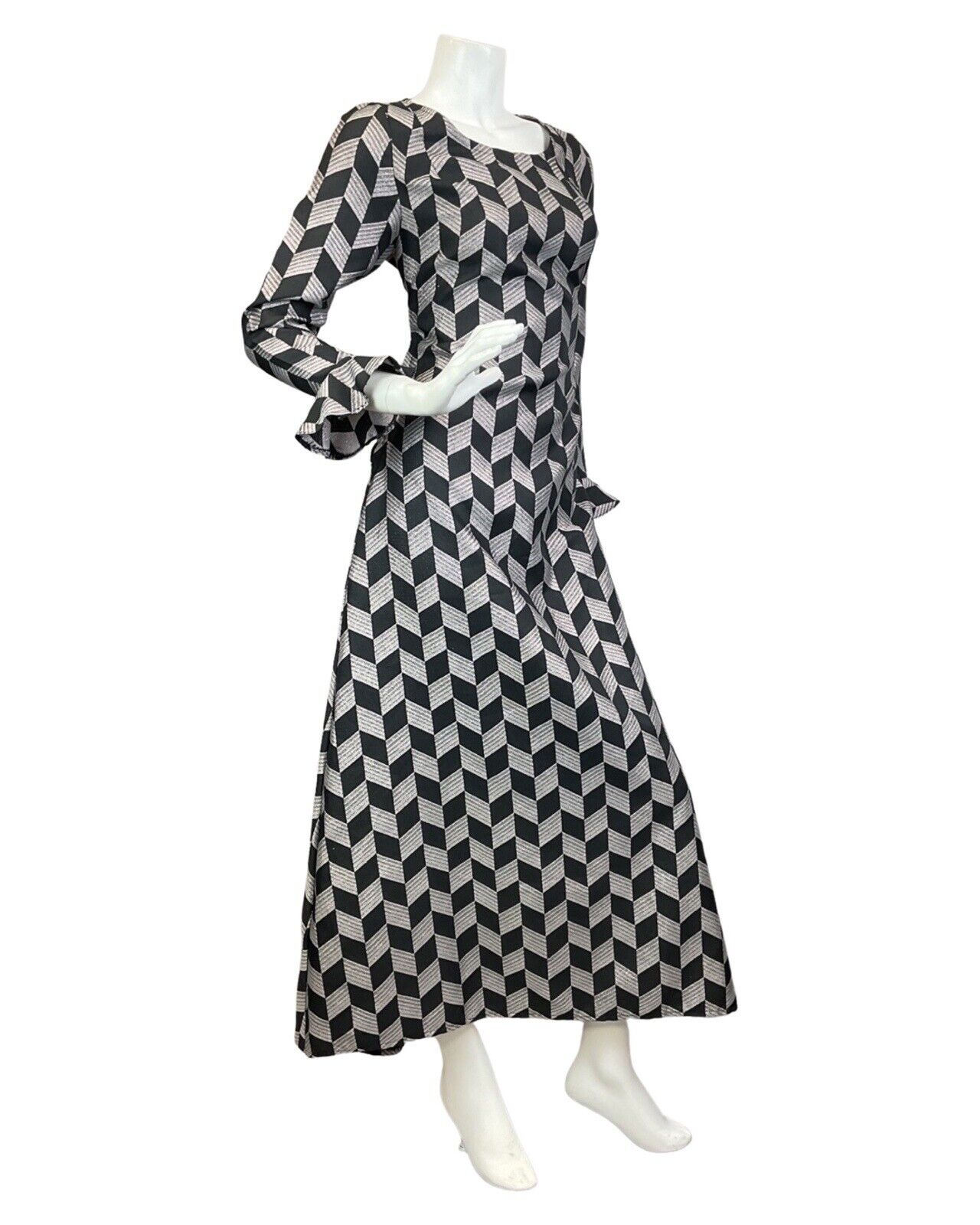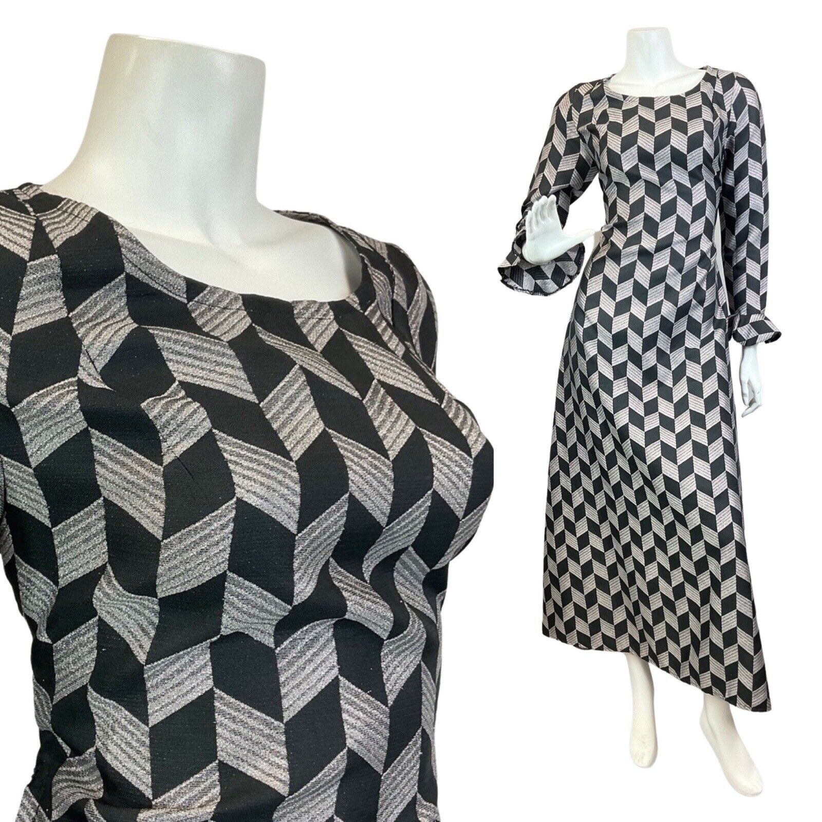 VINTAGE 60s 70s BLACK SILVER LUREX CHEVRON MOD DISCO STUDIO 54 MAXI DRESS 12
