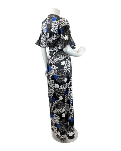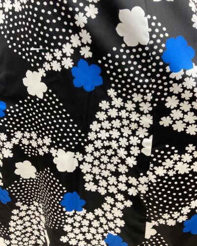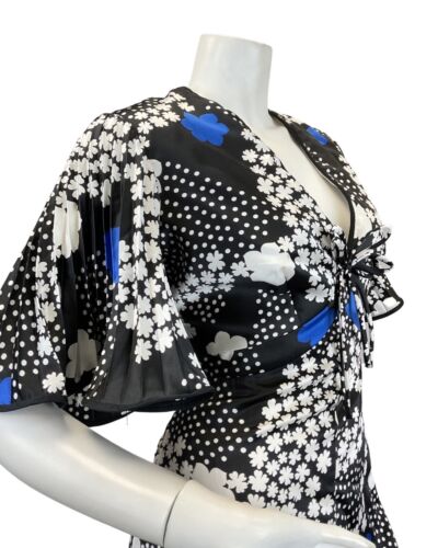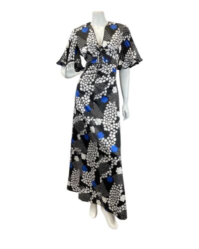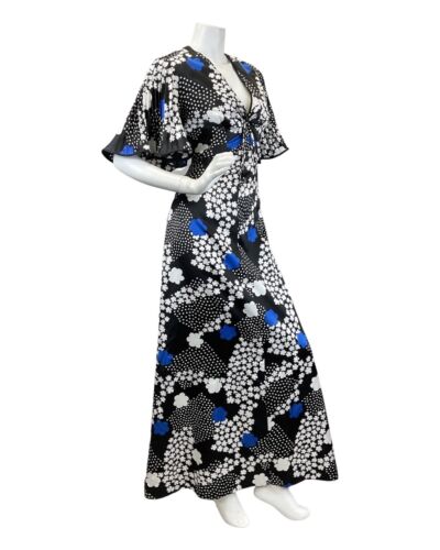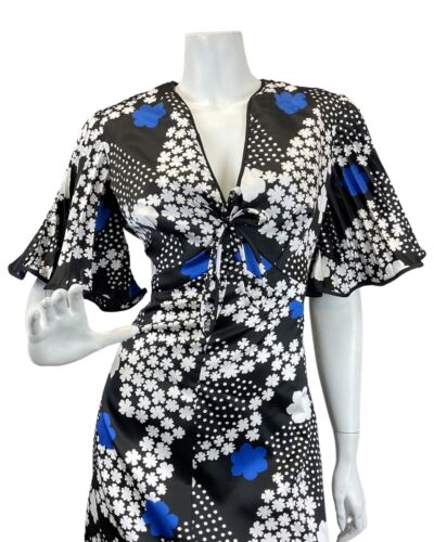 This is bold vintage maxi dress made from a shiny black polyester fabric with no stretch and no additional lining.Featuring a v-shaped neckline with a bow-detailing at the centre of the waist, pointed underbust cut with a flared maxi skirt, zip fastening down the back, and short pleated sleeves.Covering the fabric is a bold daisy flower pattern in white and blue.This fab dress is designed to be worn fitted to the body, which will be reflected in the recommended size.This dress would best fit: 14please check your measurements against the ones provided below,Bust: 40"Waist: 32"Hips: 41"Length: 58"PLEASE NOTE: This garment has been measured flat and doubled for bust (armpit to armpit), waist and hip measurements, we measure the length down the back of the dress, measurements may differ slightly due to dress styles and fabrics. We ignore any existing size labels as vintage brands differed so much. Items shown on our mannequin may be clipped to fit.This garment is true vintage so please be aware there may be some signs of wear as expected from a garment of this age. We do not list stains to area likes linings that are hidden or things that can barely be seen without close inspection. These can include pin holes, small marks, light piling. We hand pick our items to make sure they are in great condition and fully wearable and we reject anything of poor condition. The majority of our items are 40-70 years old. If you think we've missed something significant please get in touch, we are only human and we lose transaction fees on returns so we don't skip things on purpose.CHECK OUT OUR OTHER ITEMS, WE LIST EVERY WEEK!