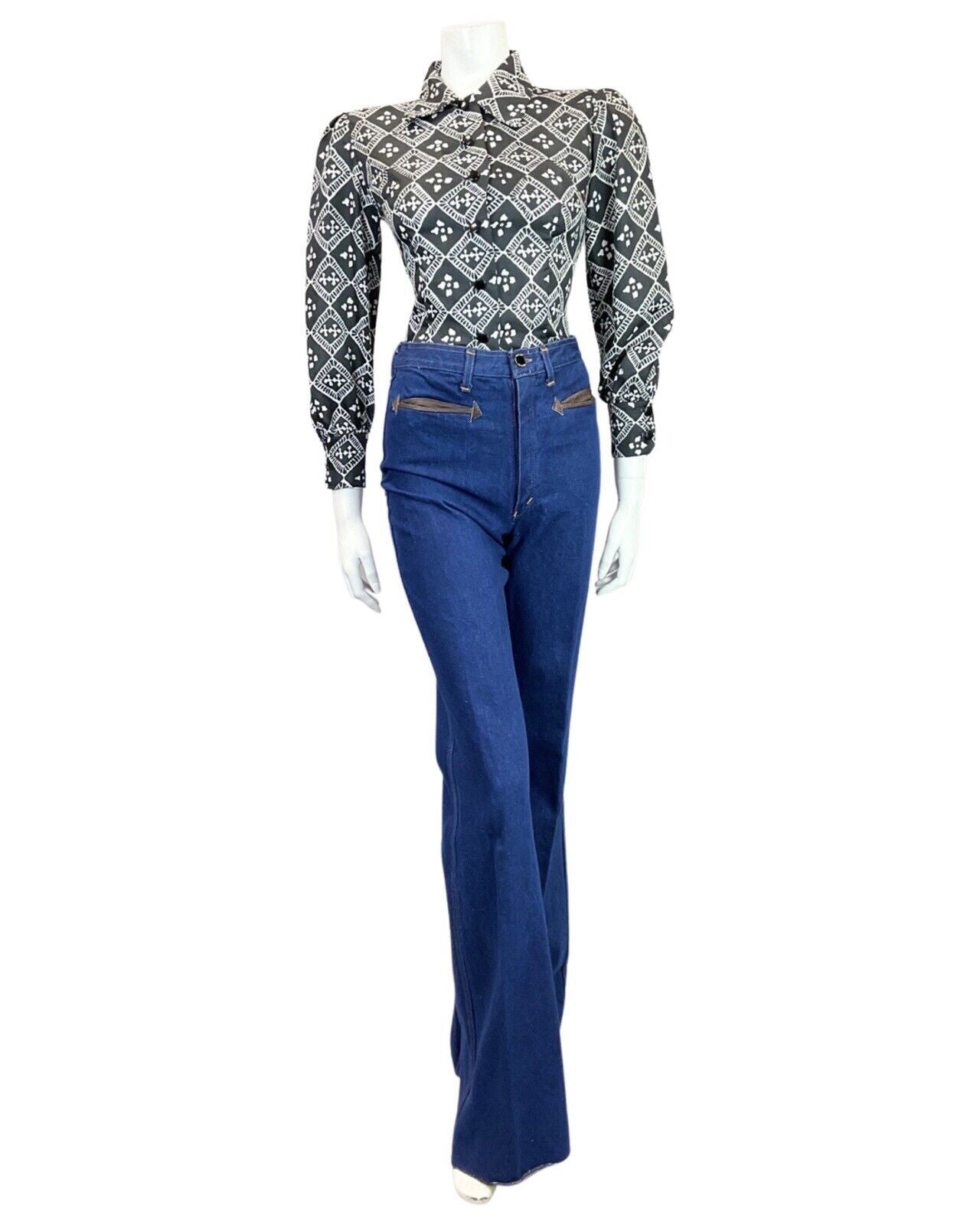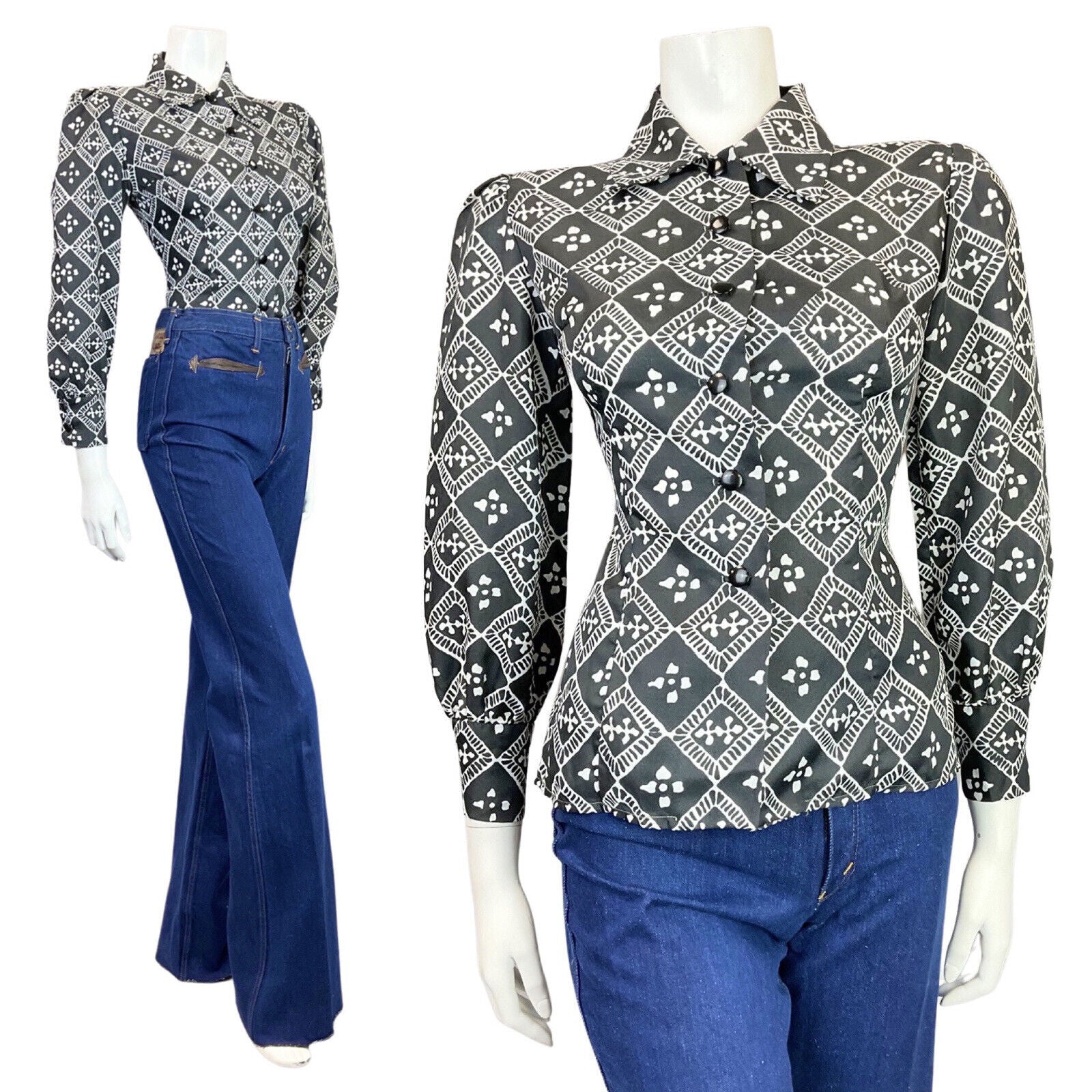 VINTAGE 60s 70s BLACK WHITE CHECKERBOARD GEOMETRIC MOD BLOUSE SHIRT 8 10