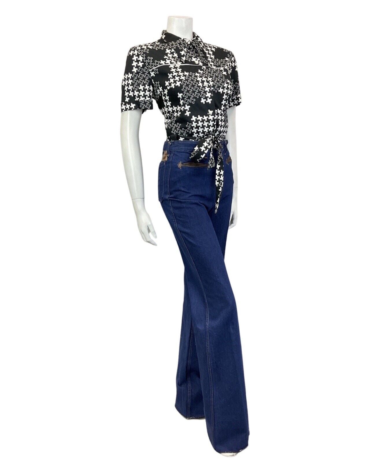 VINTAGE 60s 70s BLACK WHITE GEOMETRIC MOD BELTED DAGGER COLLAR SHIRT 12 14
