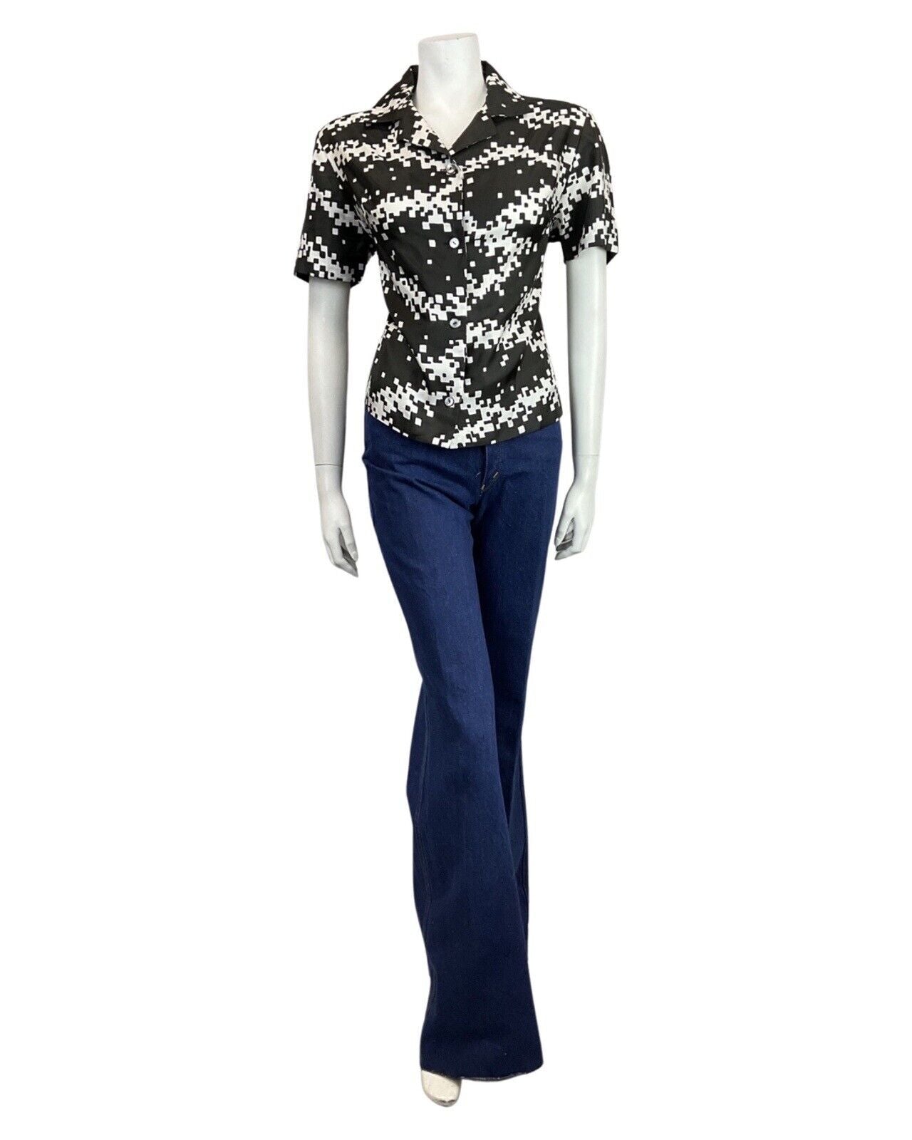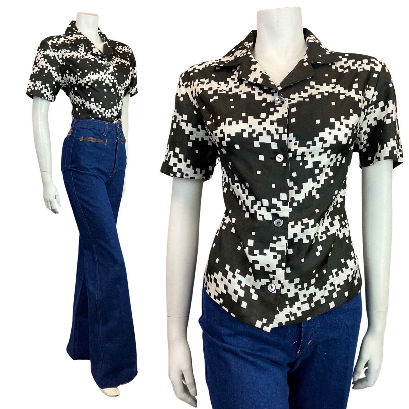 VINTAGE 60s 70s BLACK WHITE GEOMETRIC PIXEL MOD SHORT SLEEVE MOD SHIRT 14 16