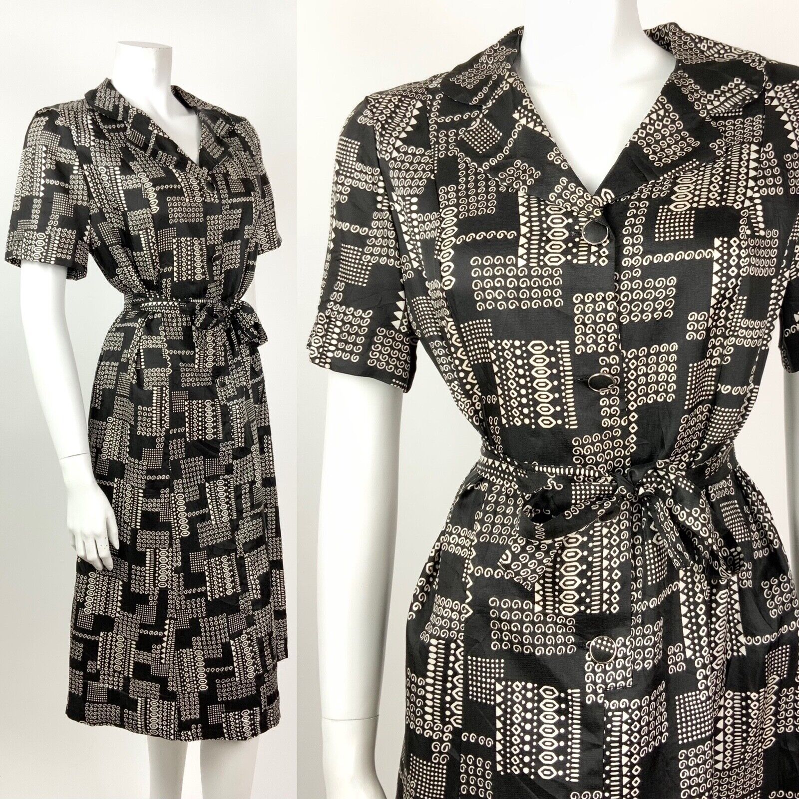 VINTAGE 60s 70s BLACK WHITE GEOMETRIC SWIRL DOTTY BELTED SHIRT DRESS 14 16