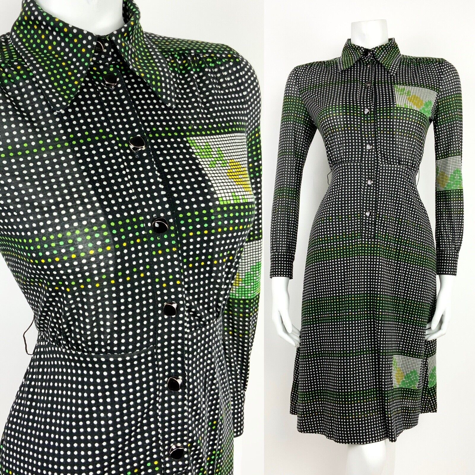 VINTAGE 60s 70s BLACK WHITE GREEN YELLOW GEOMETRIC DOTTY SHIRT DRESS 8 10