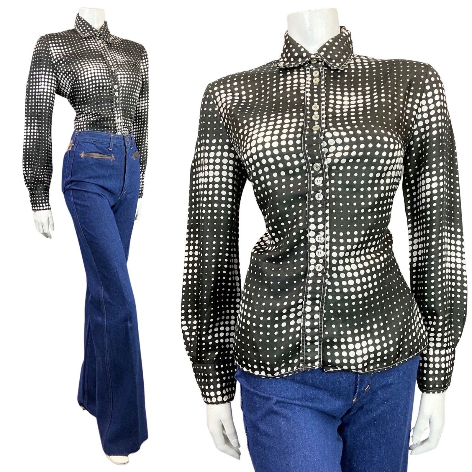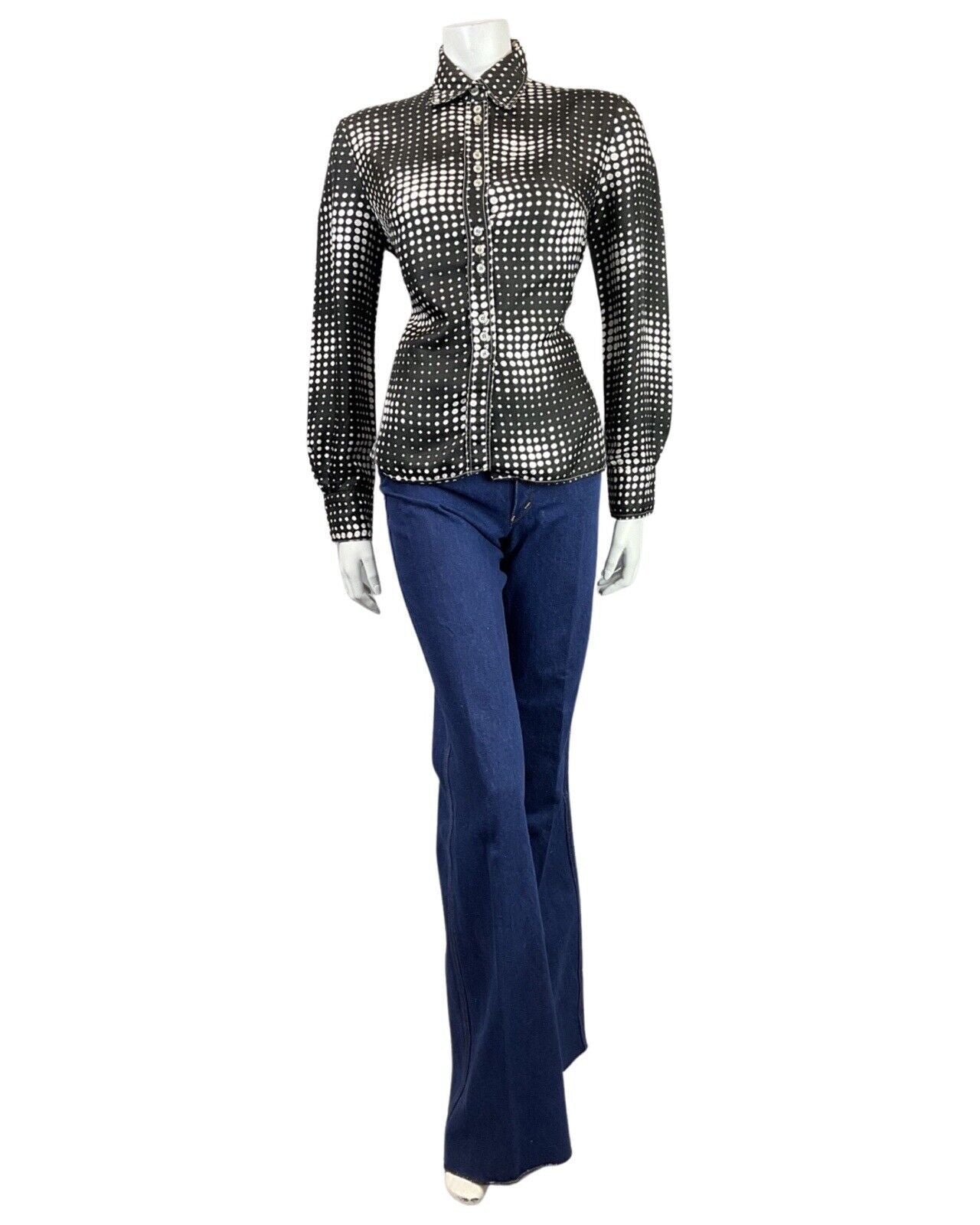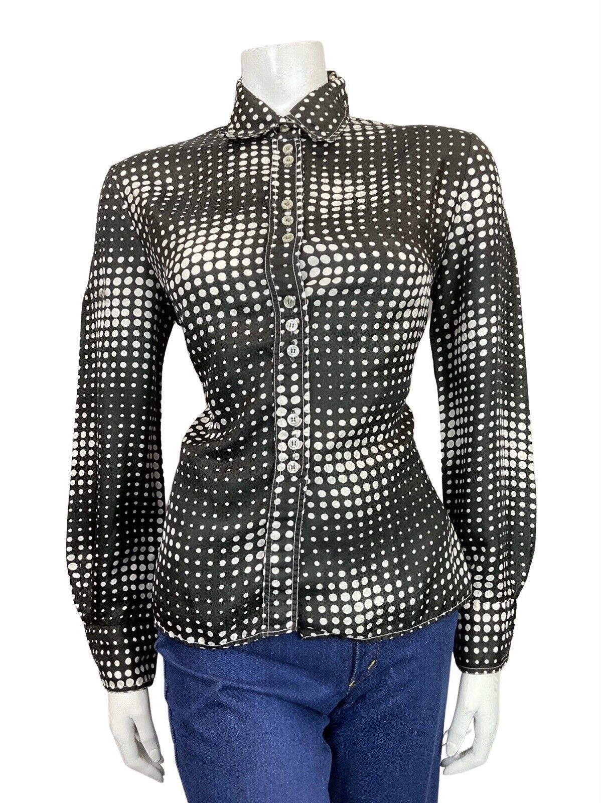 VINTAGE 60s 70s BLACK WHITE OP-ART HALFTONE DOTTY MOD SHIRT BLOUSE 14 16
