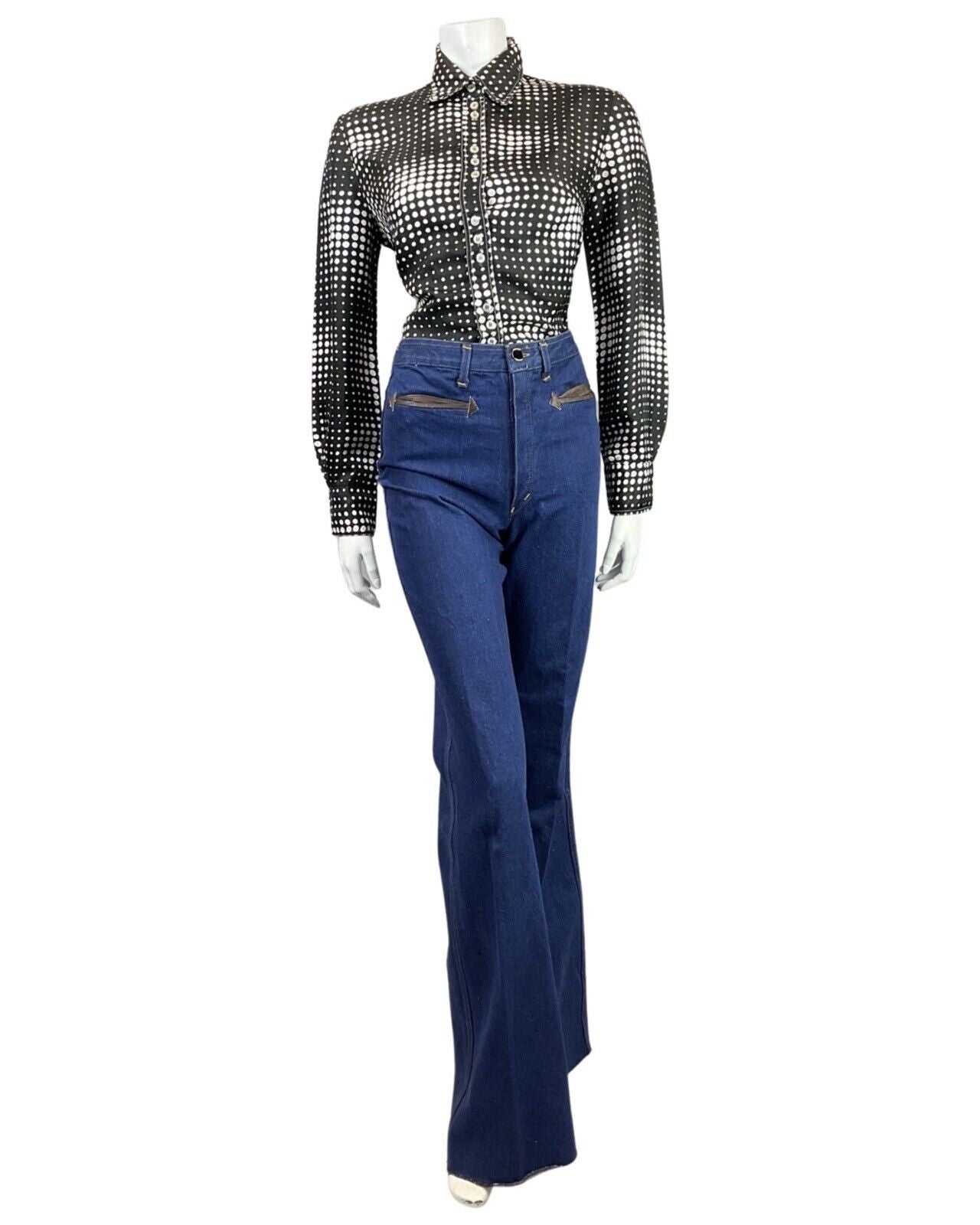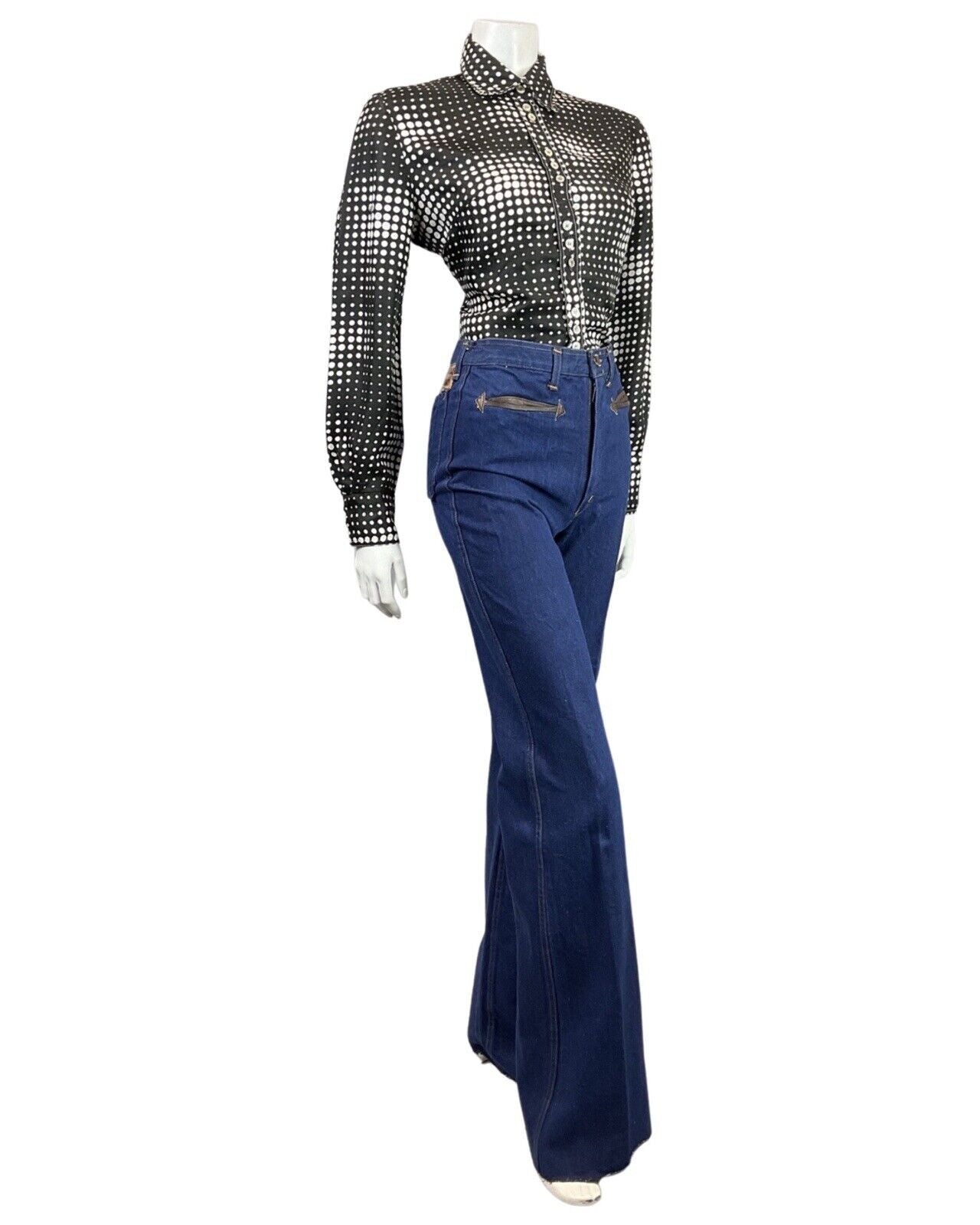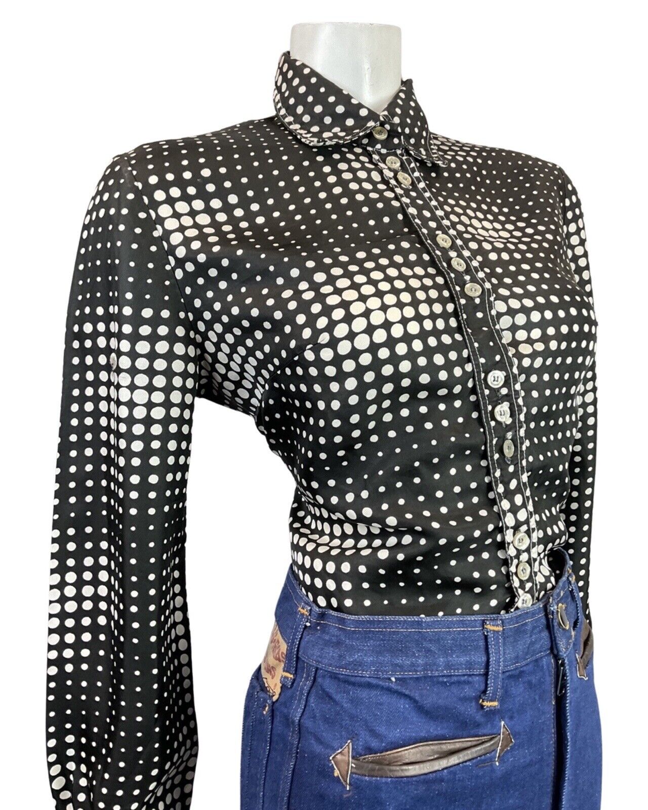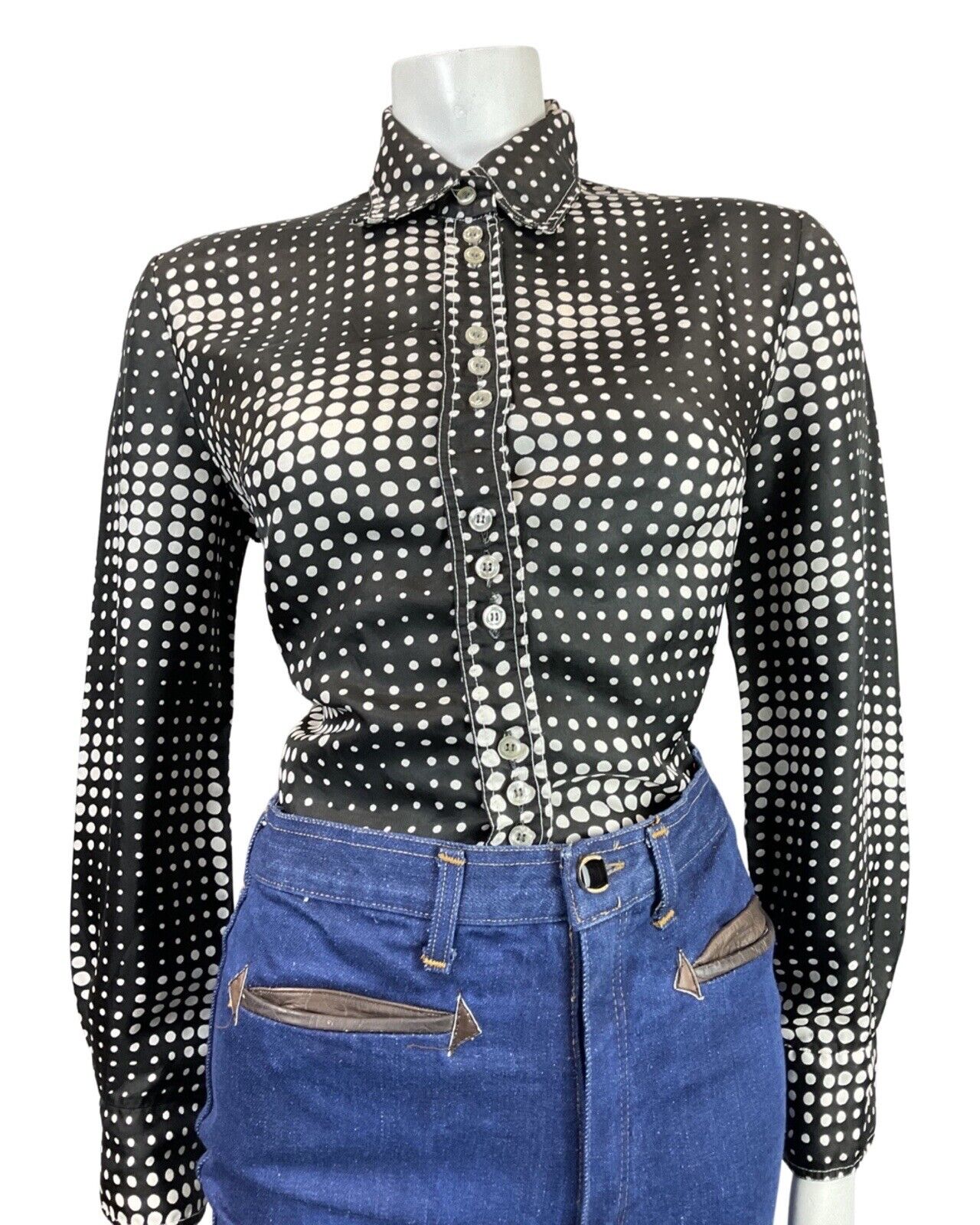 VINTAGE 60s 70s BLACK WHITE OP-ART HALFTONE DOTTY MOD SHIRT BLOUSE 14 16