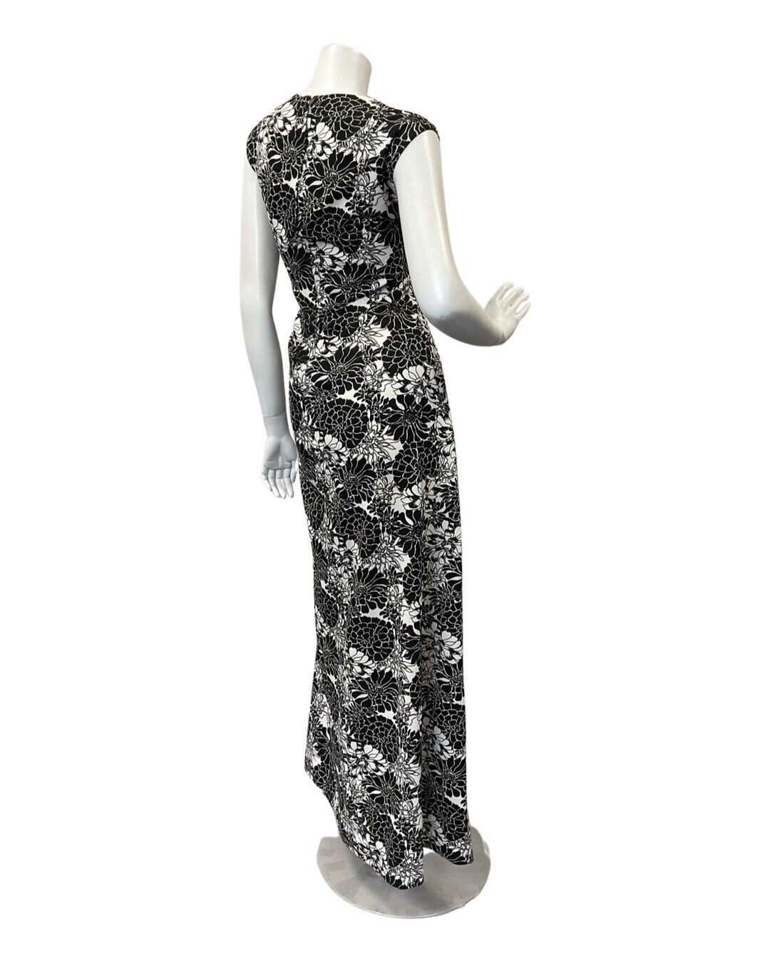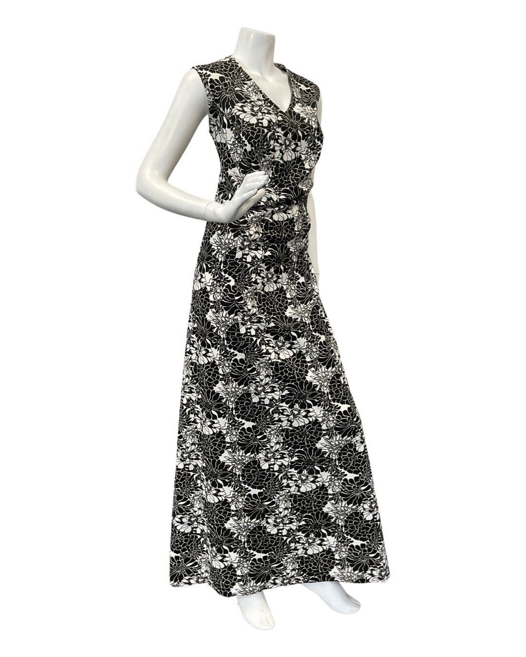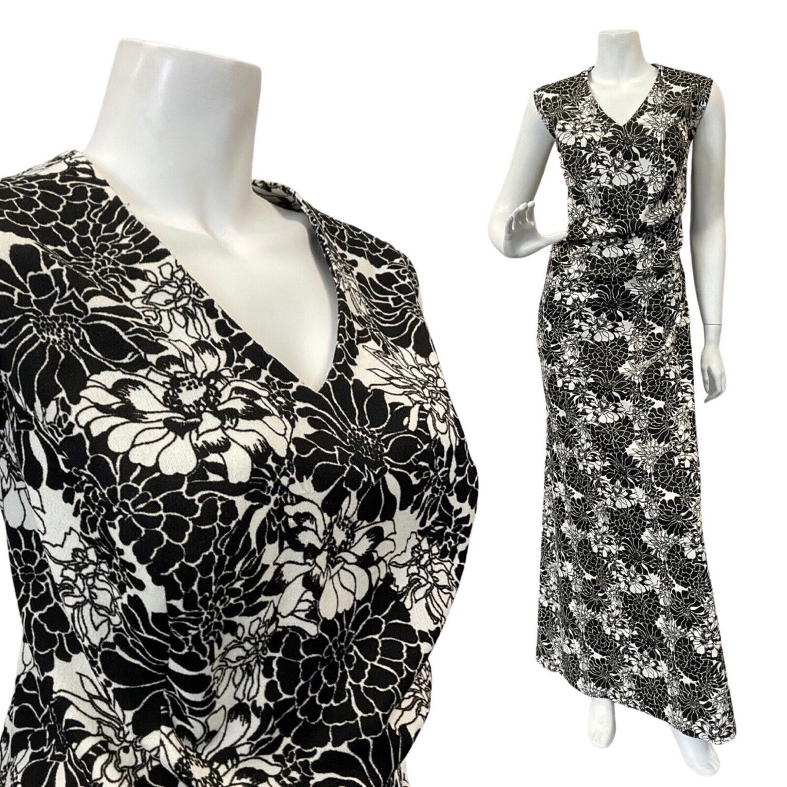 VINTAGE 60s 70s BLACK WHITE PSYCHEDELIC FLORAL SLEEVELESS MAXI DRESS 16 18