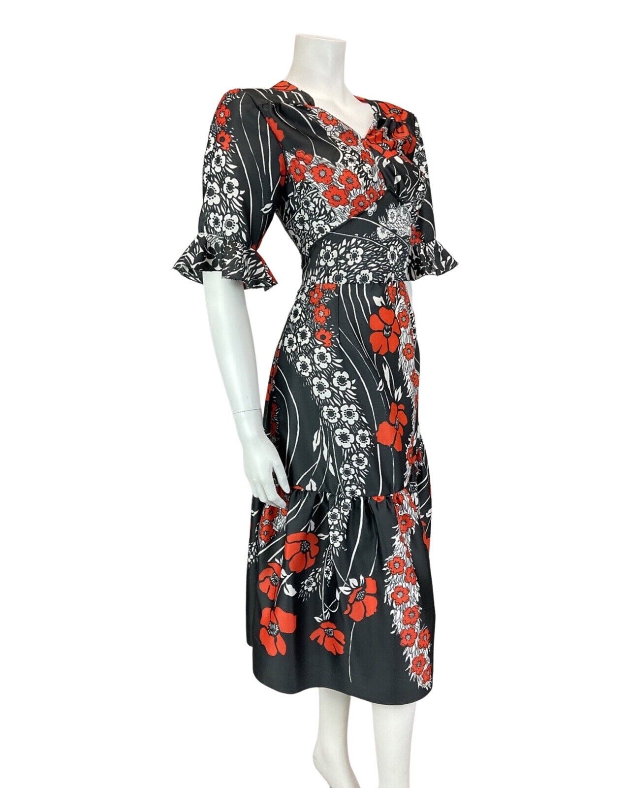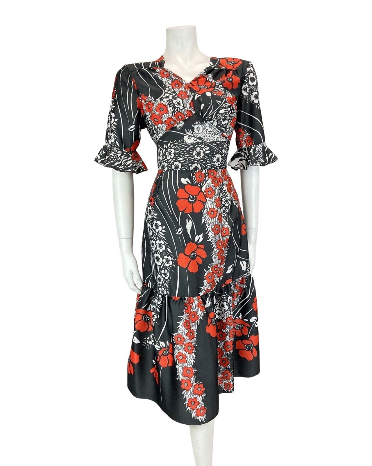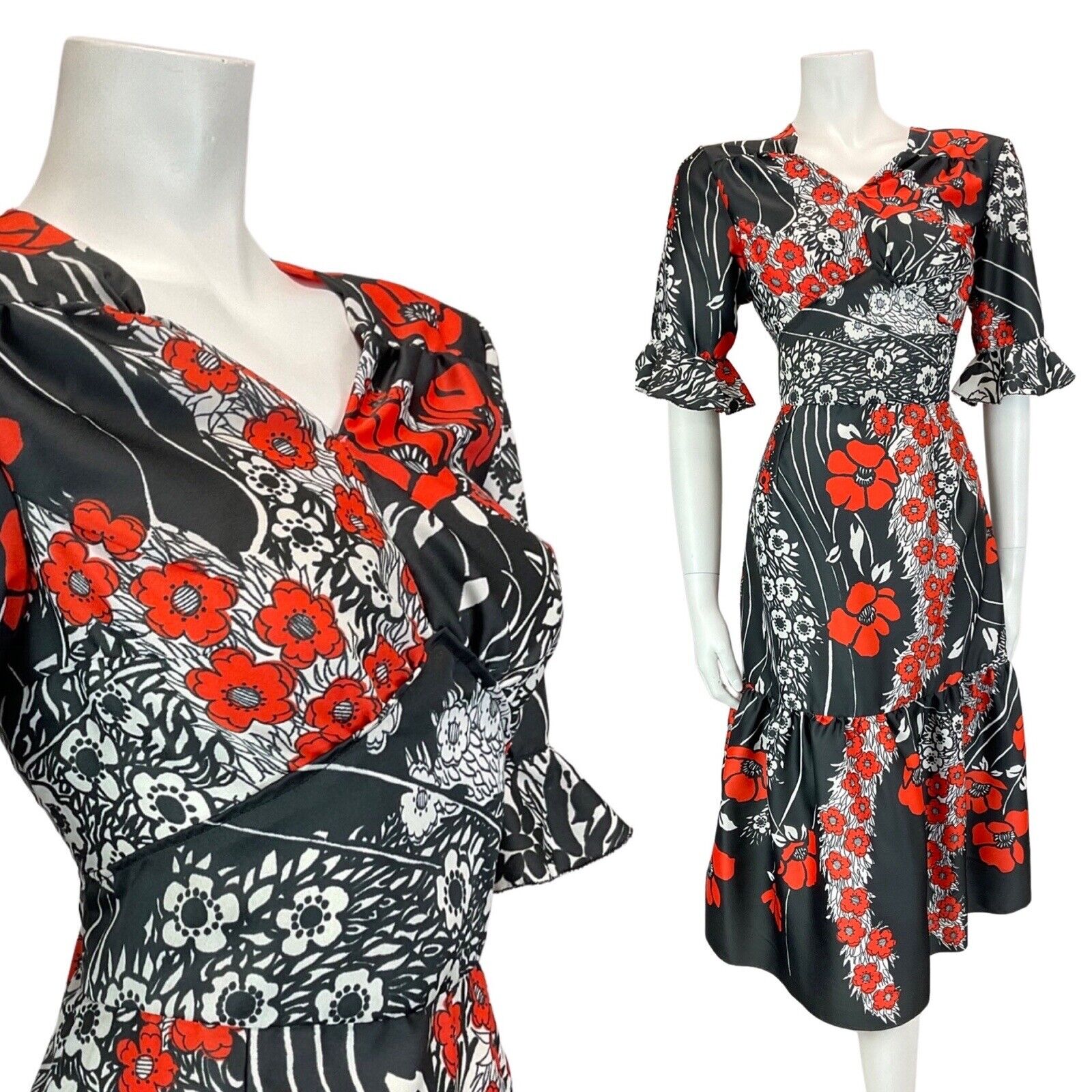 VINTAGE 60s 70s BLACK WHITE RED PSYCHEDELIC FLORAL RUFFLED SWING DRESS 10