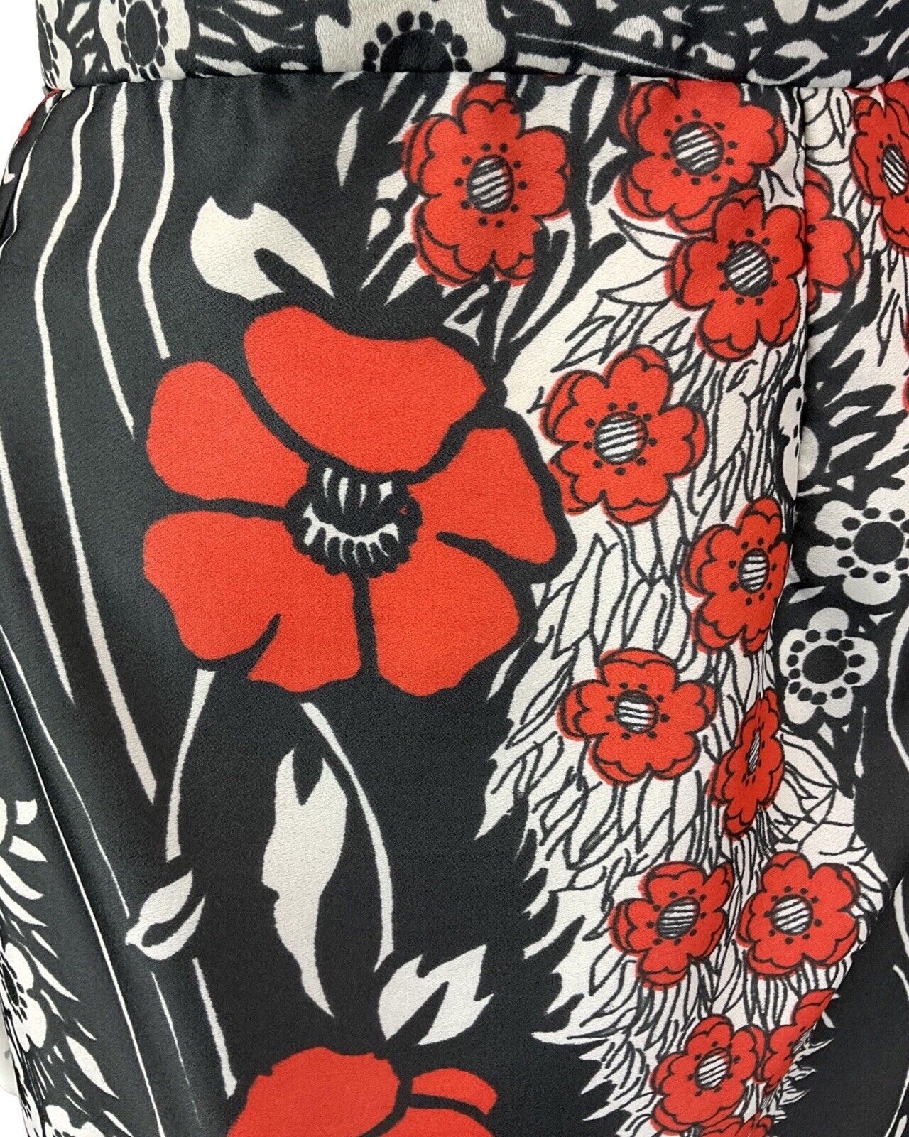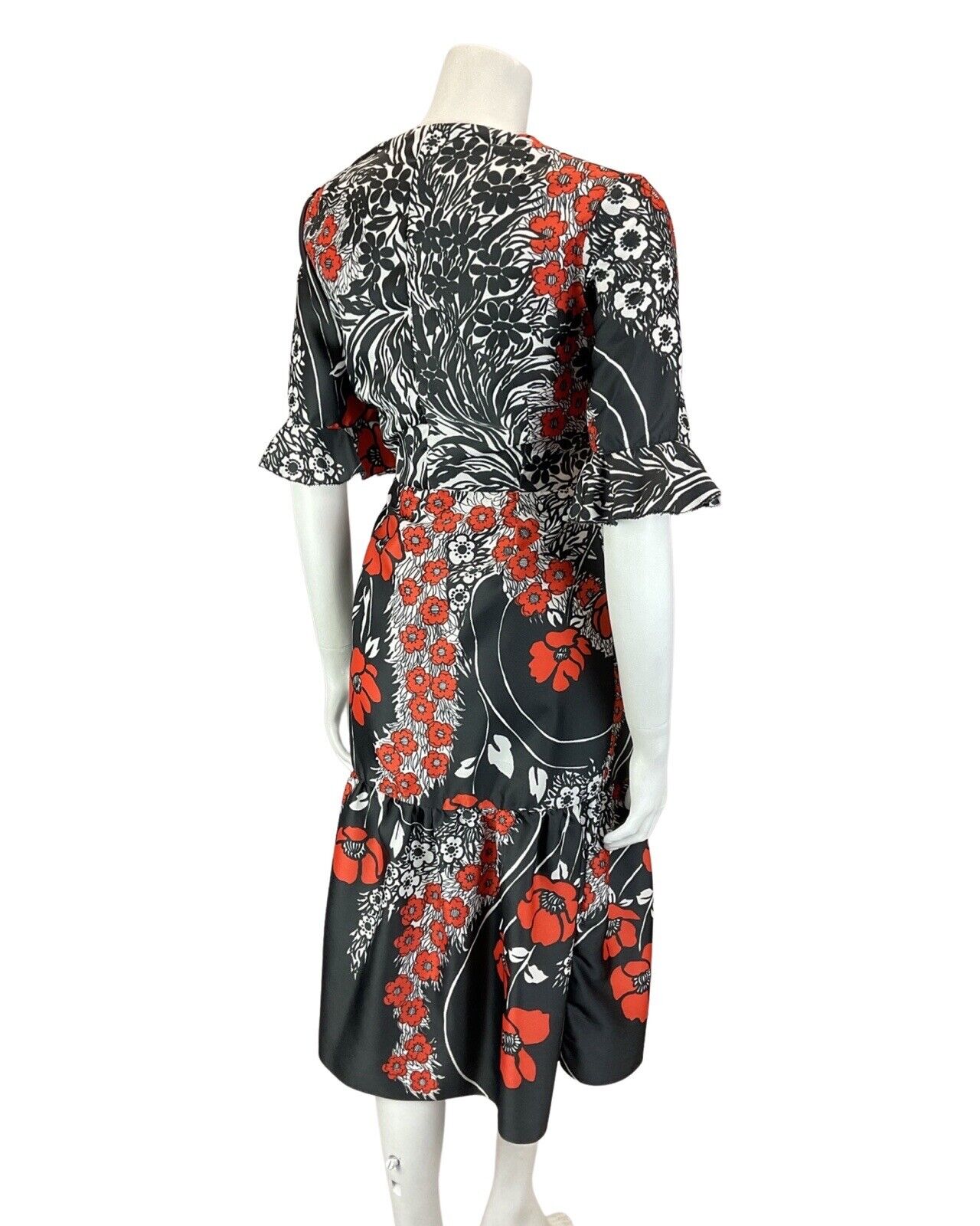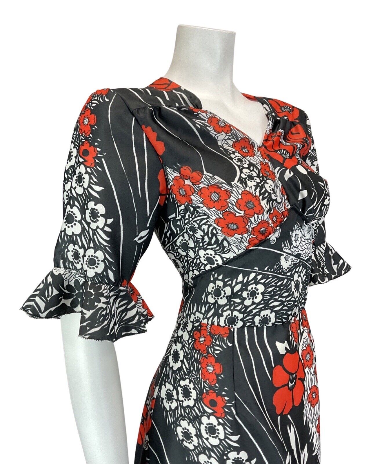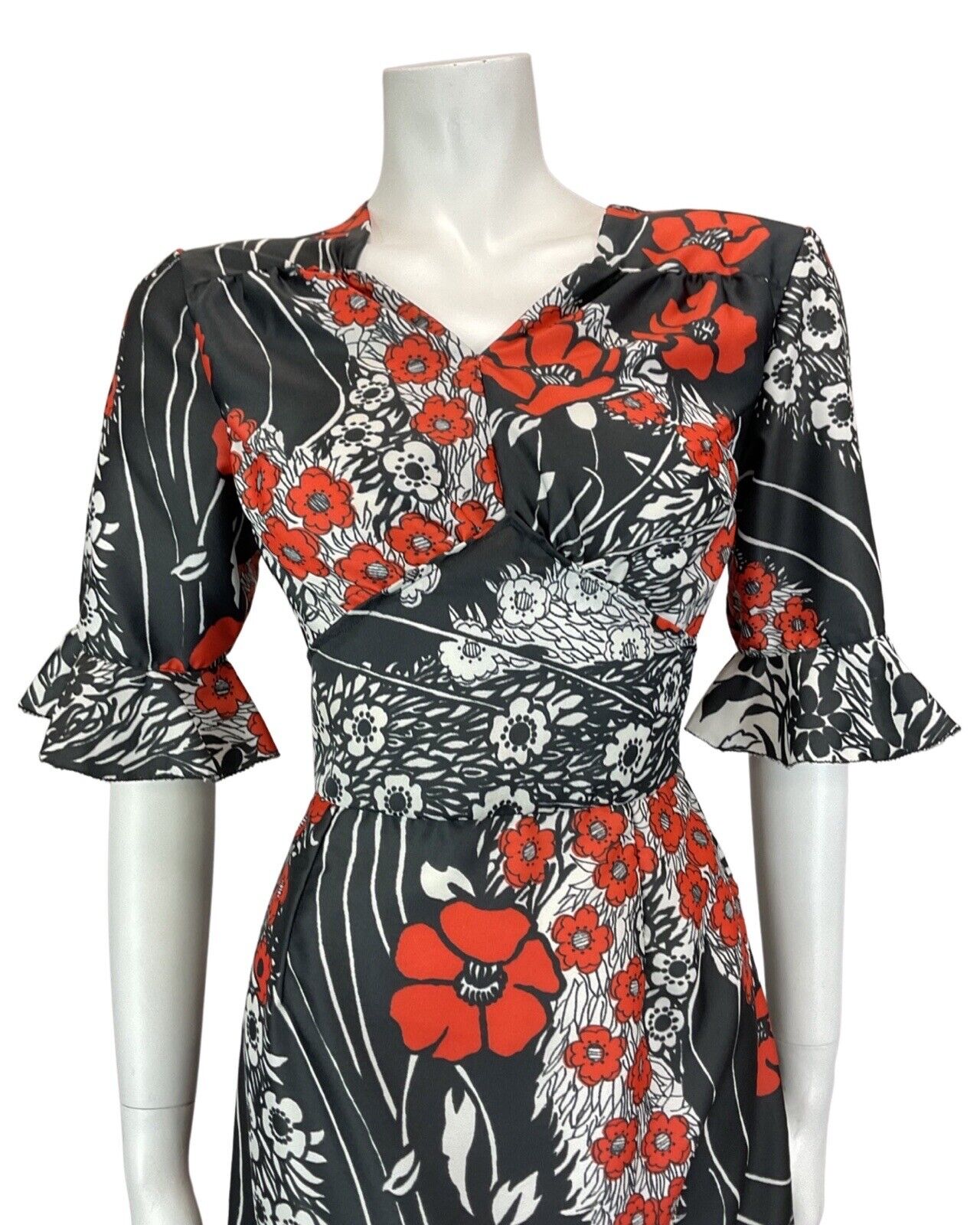 VINTAGE 60s 70s BLACK WHITE RED PSYCHEDELIC FLORAL RUFFLED SWING DRESS 10
