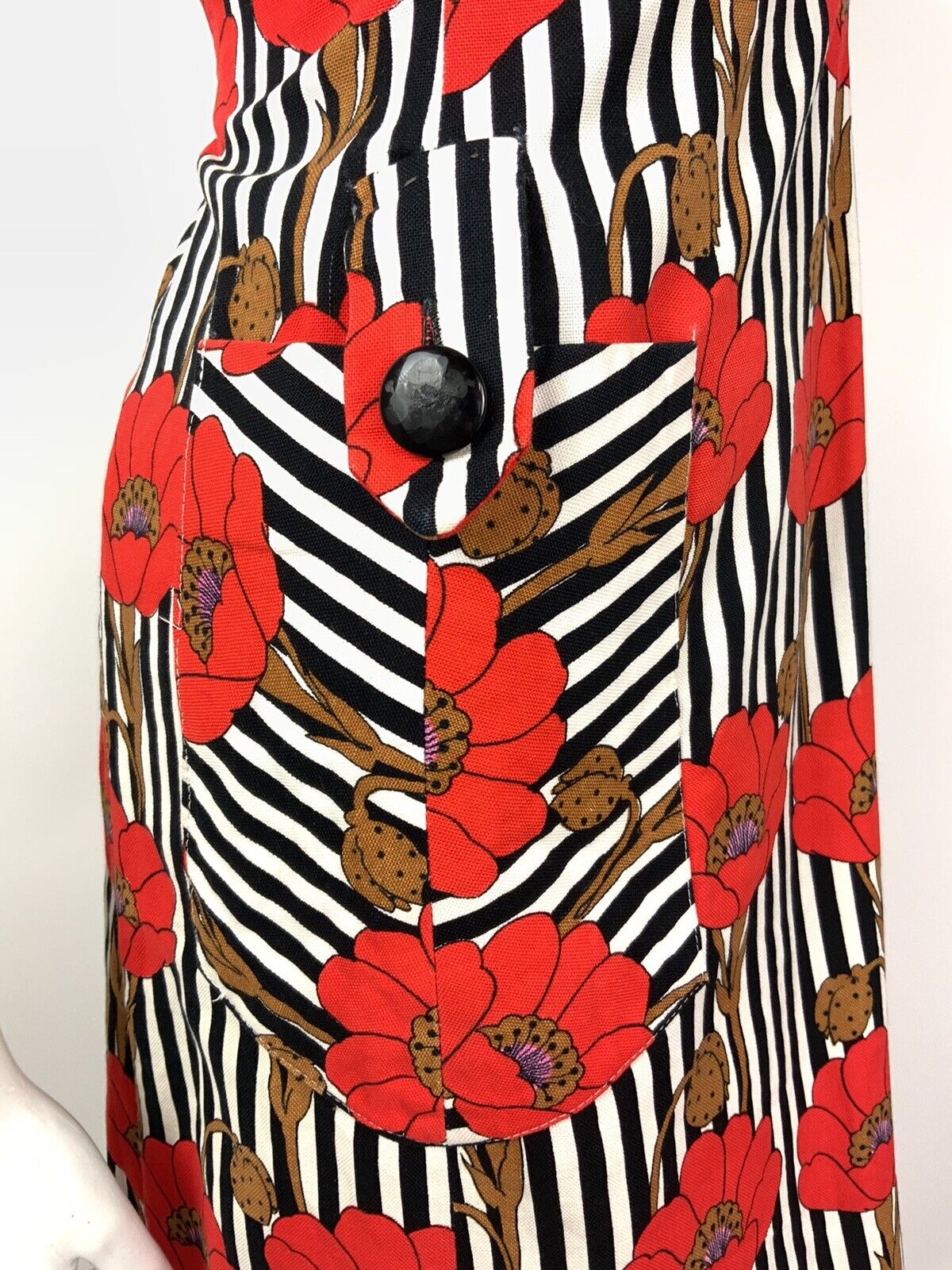 VINTAGE 60s 70s BLACK WHITE RED STRIPED FLORAL POPPY SLEEVELESS DRESS 10 12