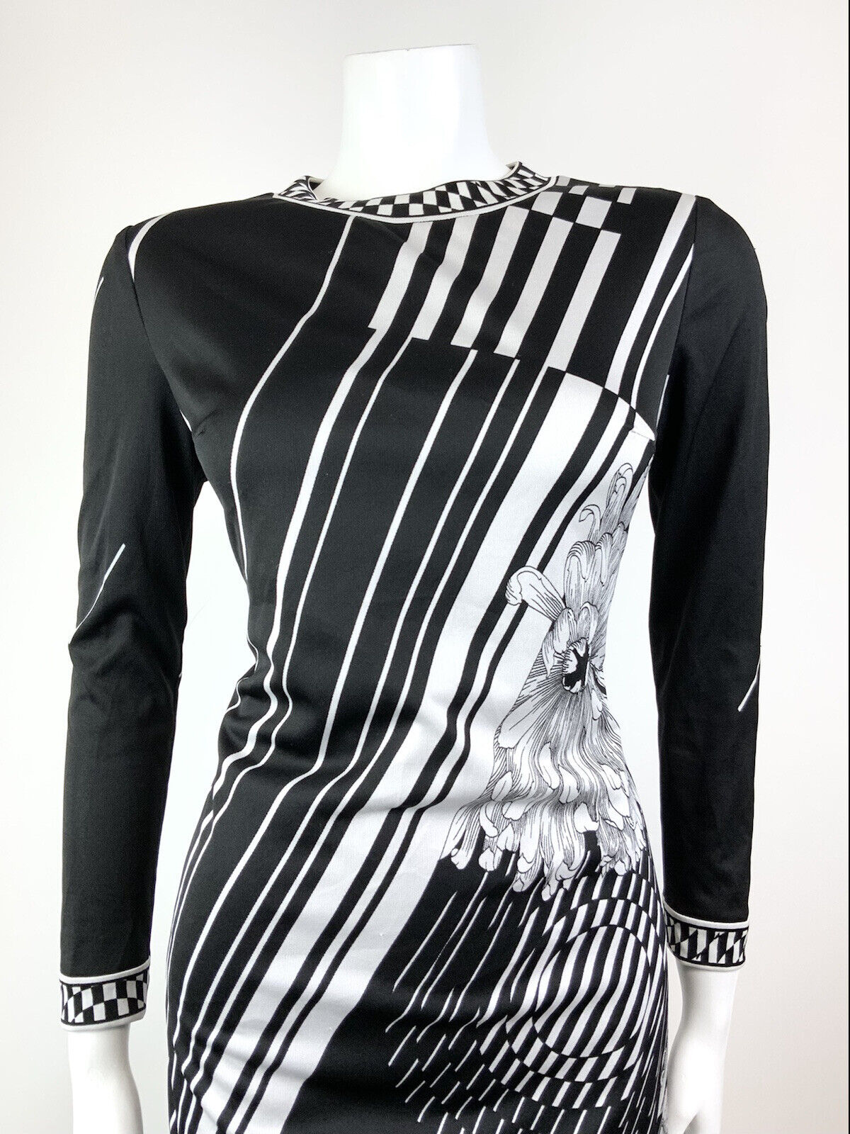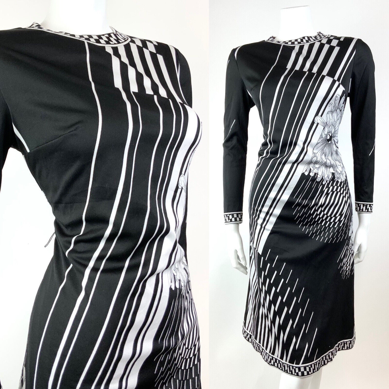 VINTAGE 60s 70s BLACK WHITE STRIPED FLORAL OP-ART FITTED KNEE-LENGTH DRESS 12 14