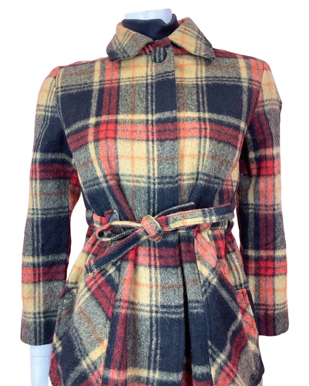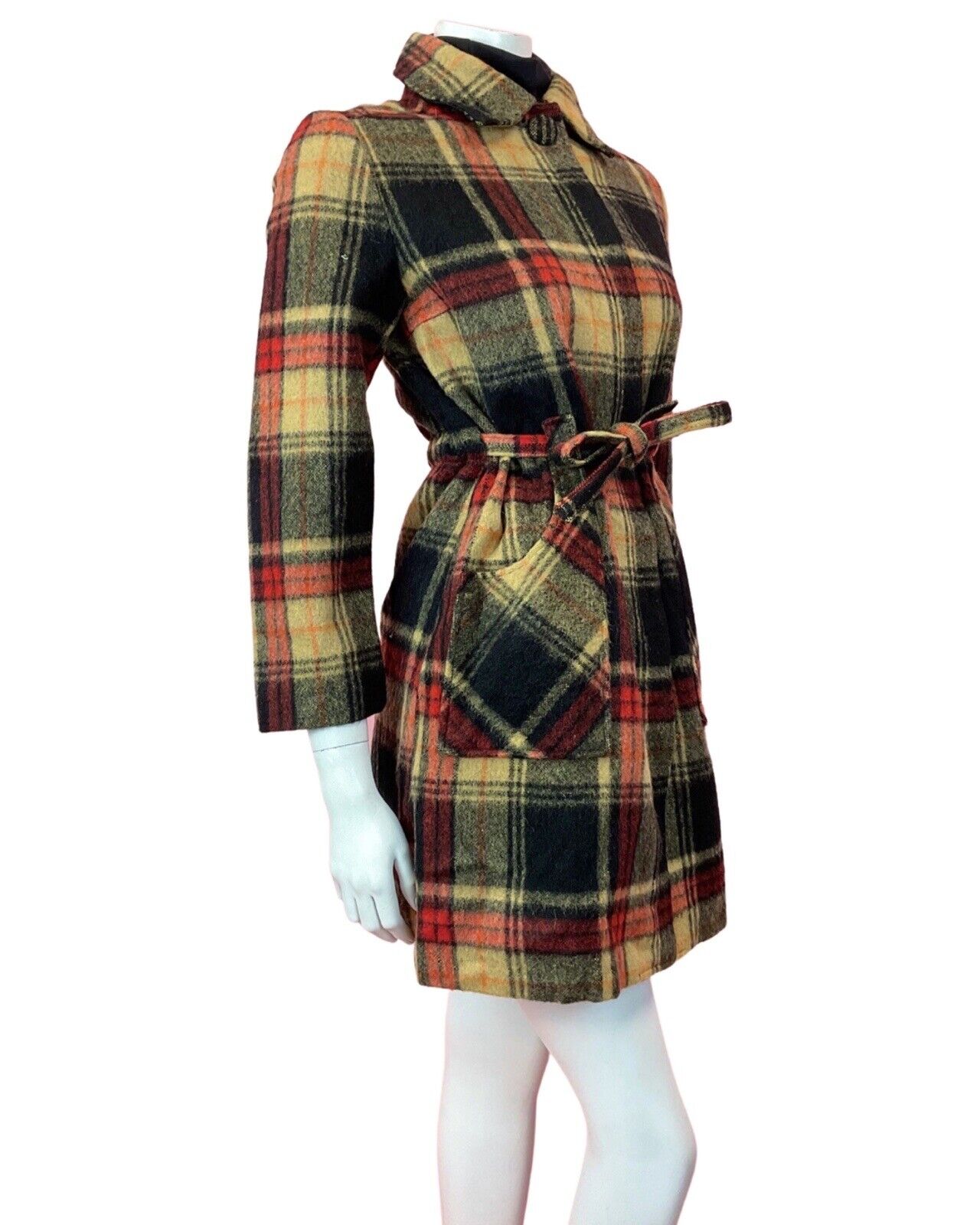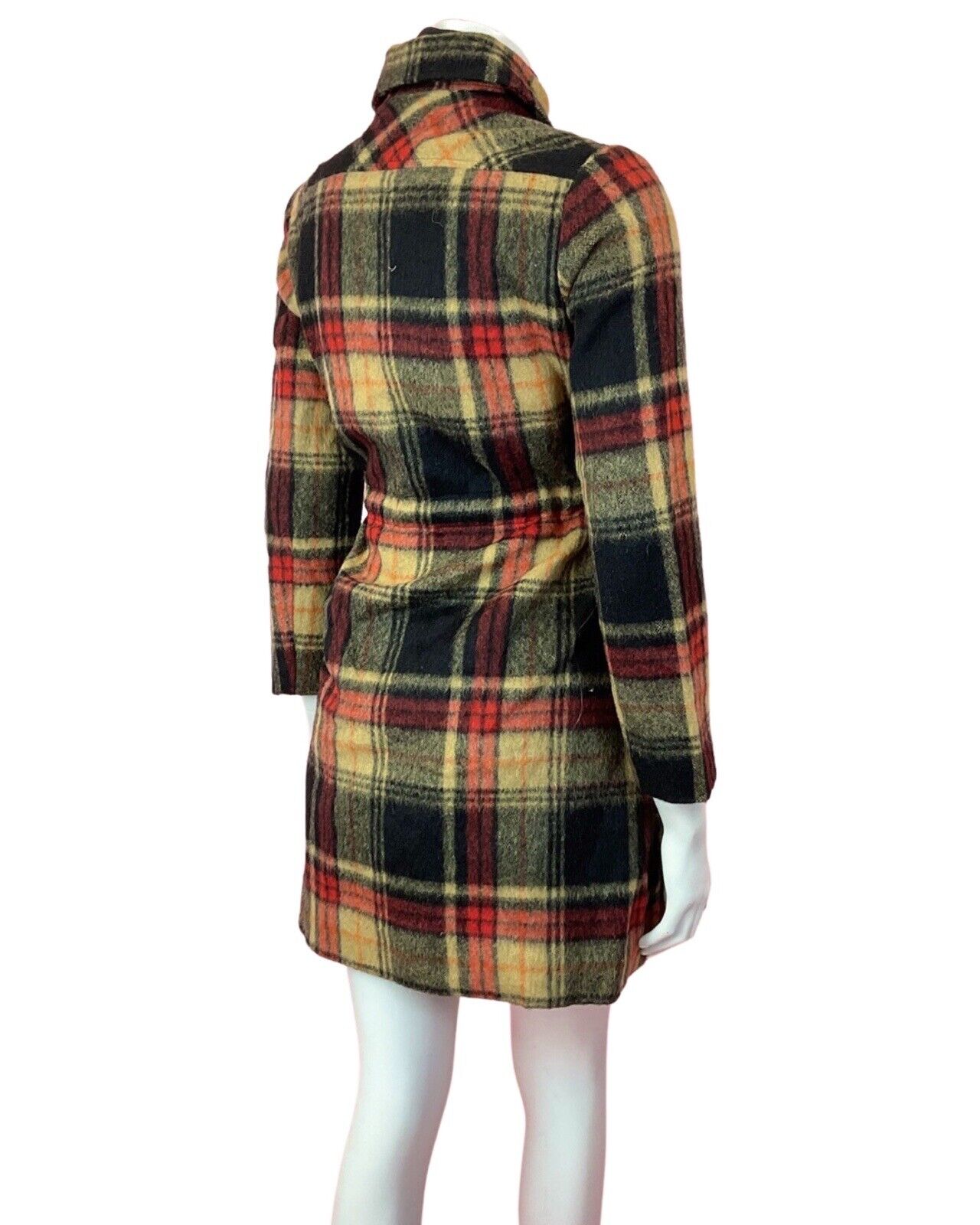 VINTAGE 60s 70s BLACK YELLOW RED PLAID CHECKED MOD WOOL COAT 10 12