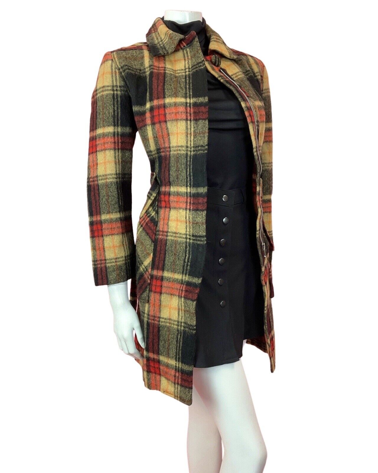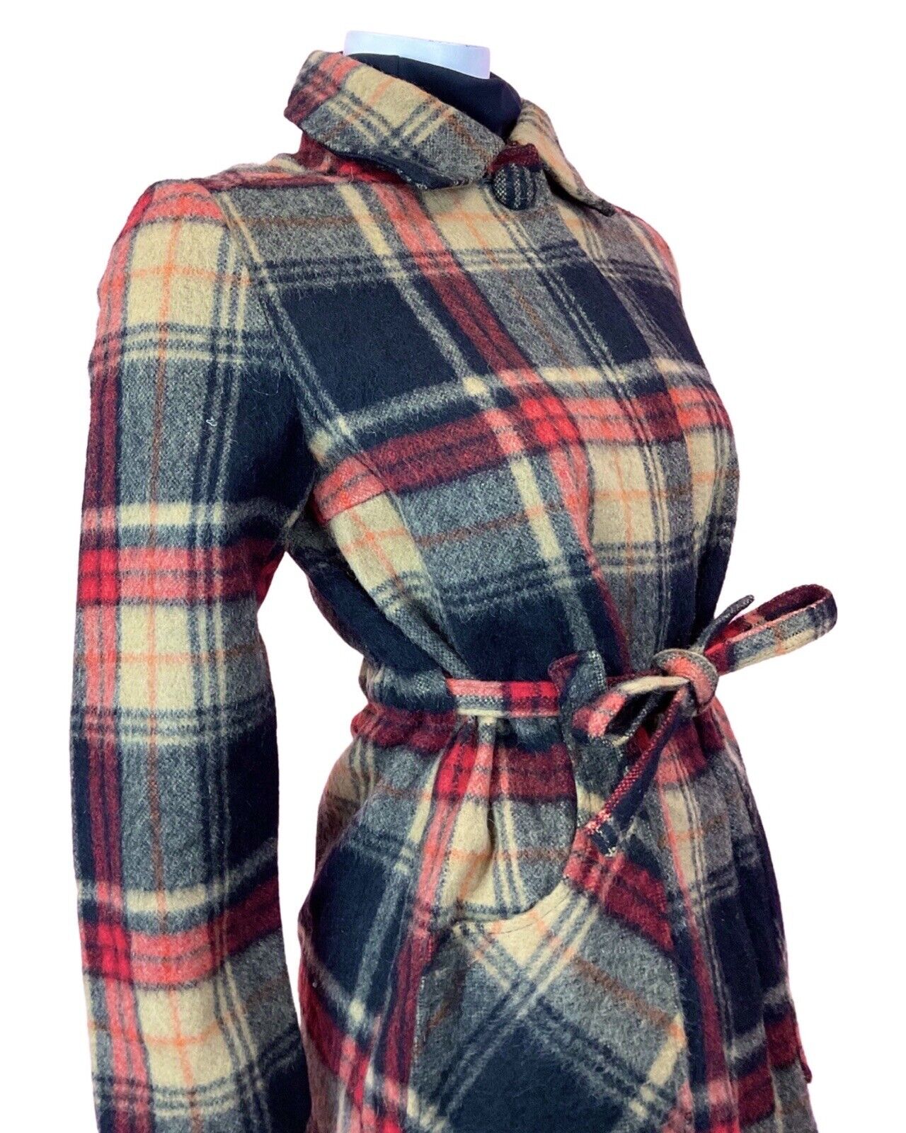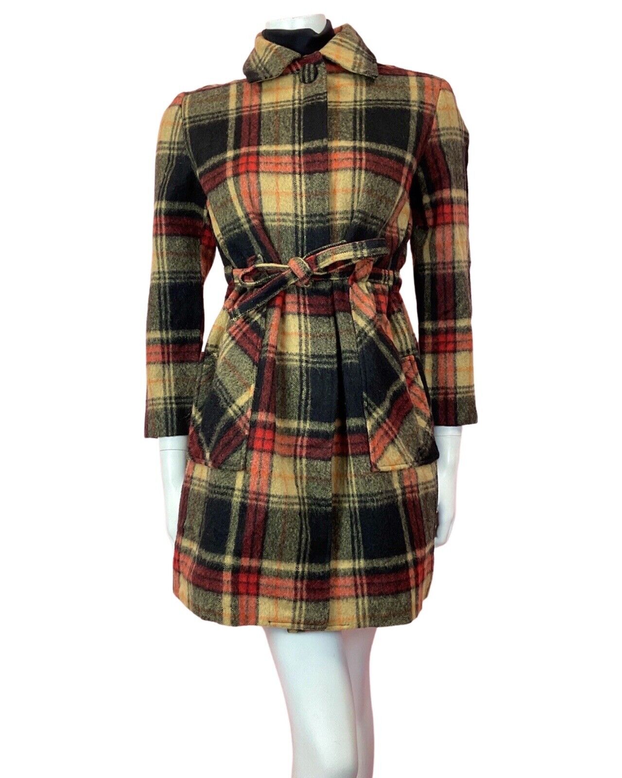 VINTAGE 60s 70s BLACK YELLOW RED PLAID CHECKED MOD WOOL COAT 10 12