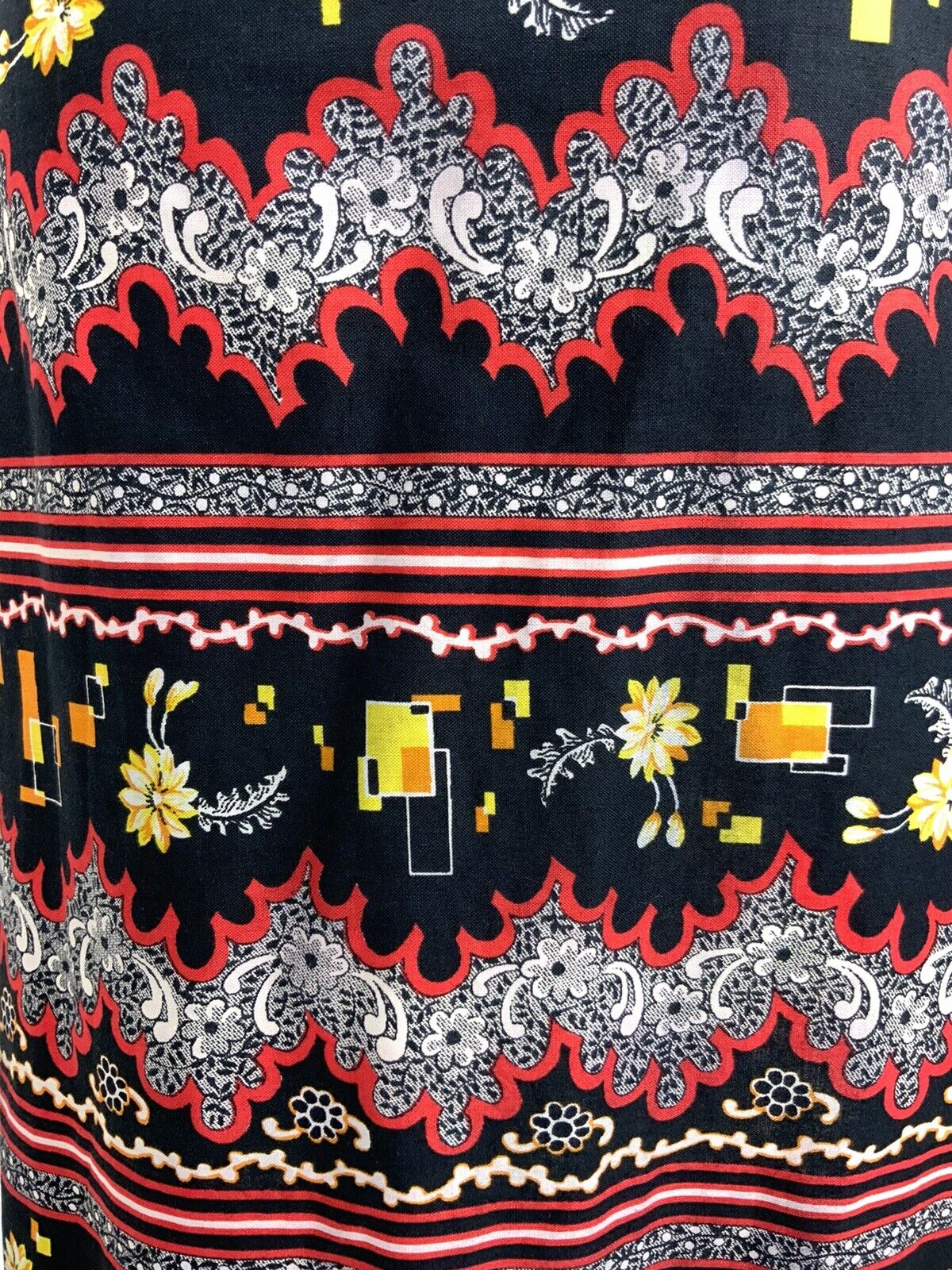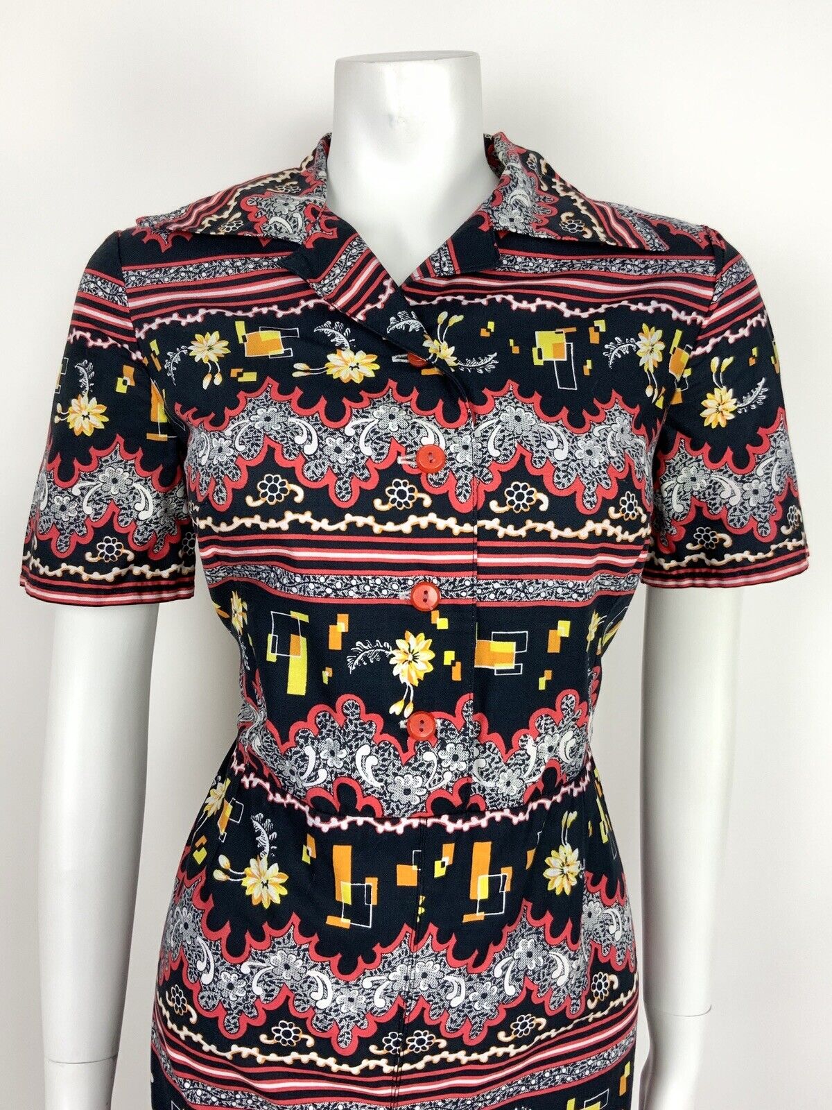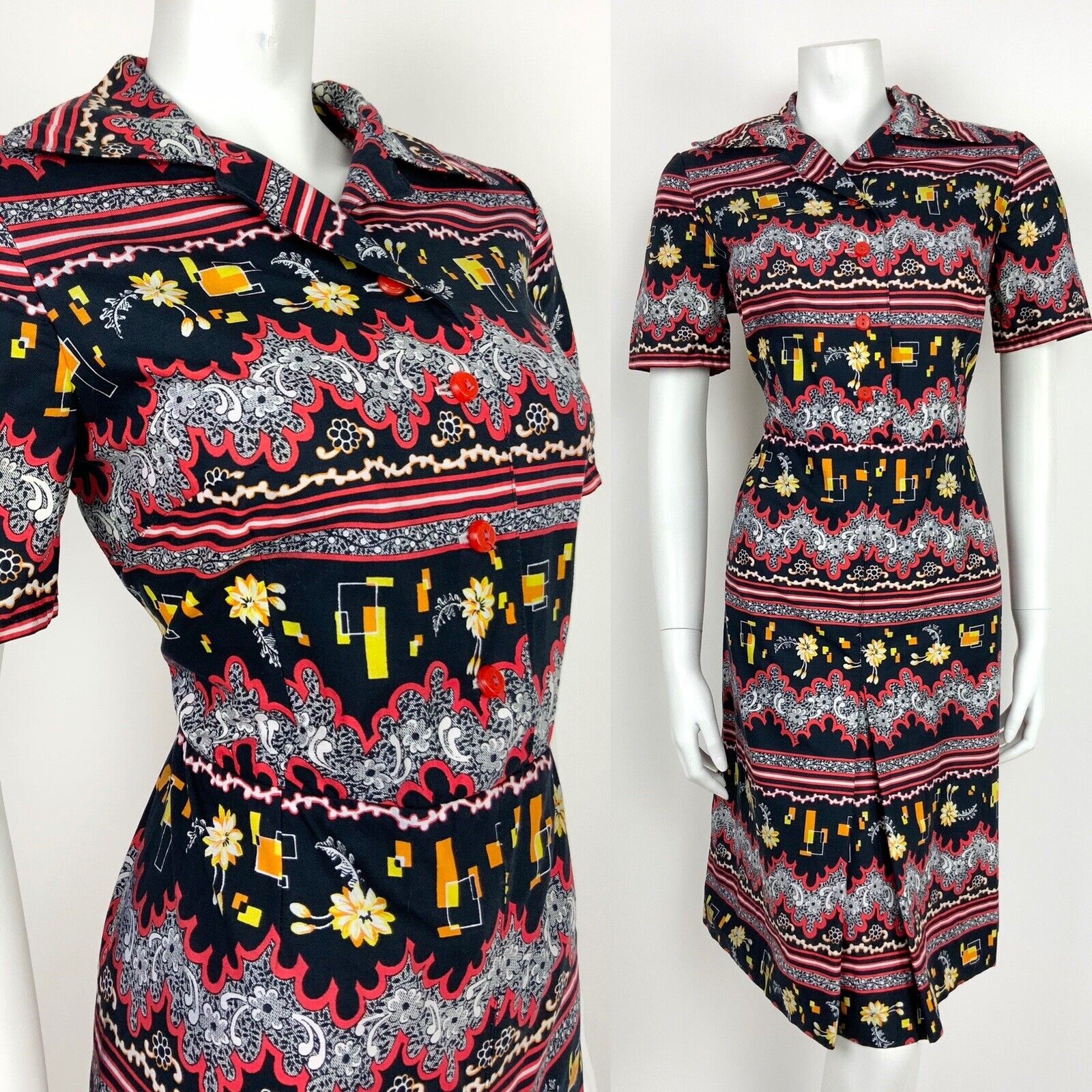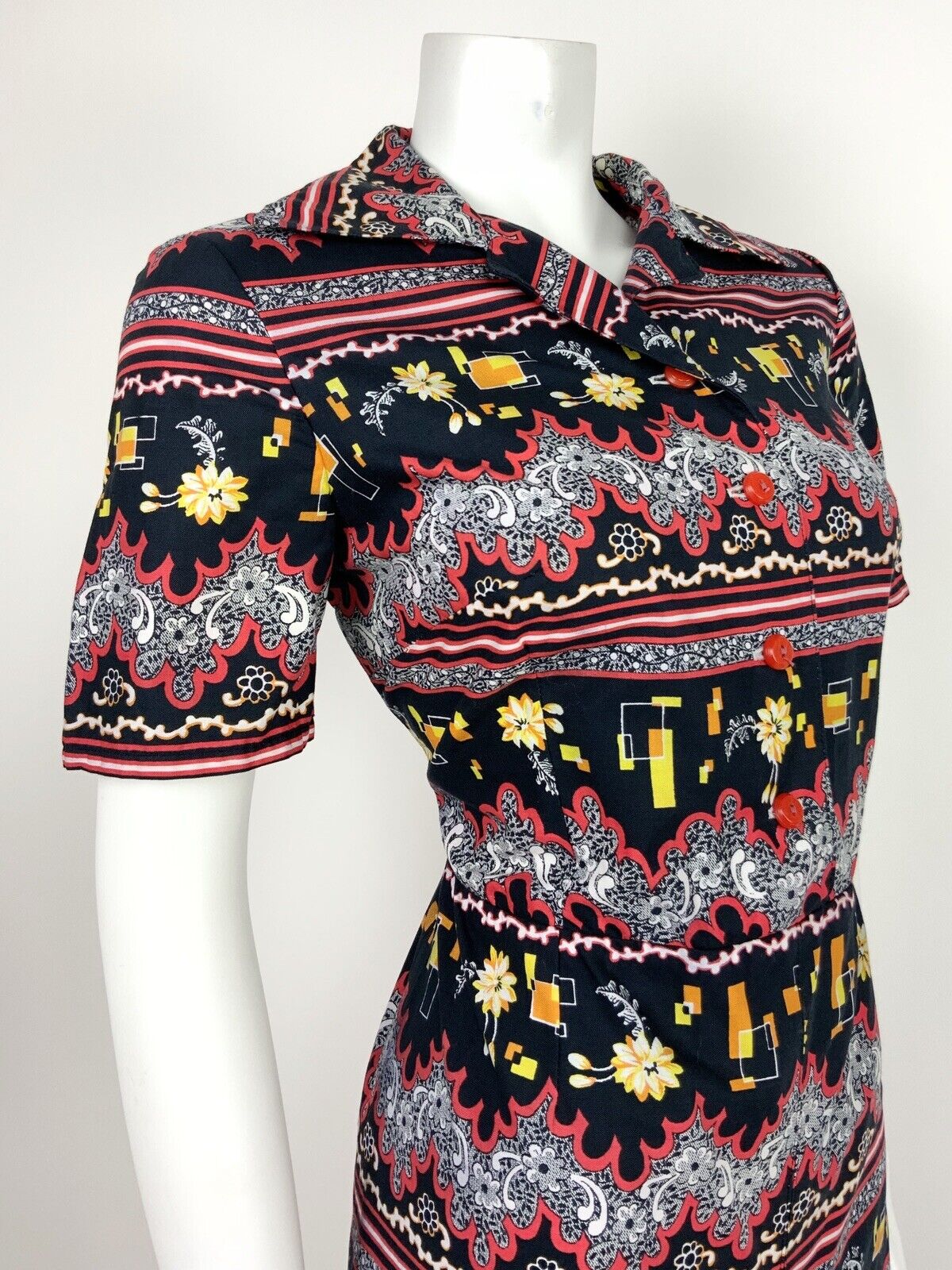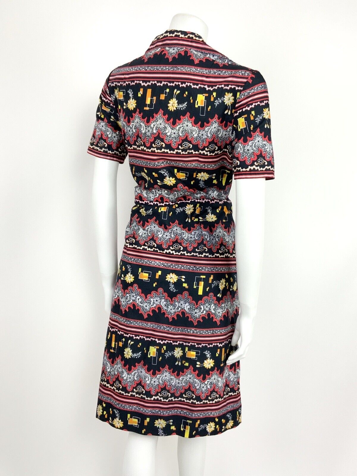 VINTAGE 60s 70s BLACK YELLOW WHITE RED GEOMETRIC FLORAL STRIPE SHIRT DRESS 12 14