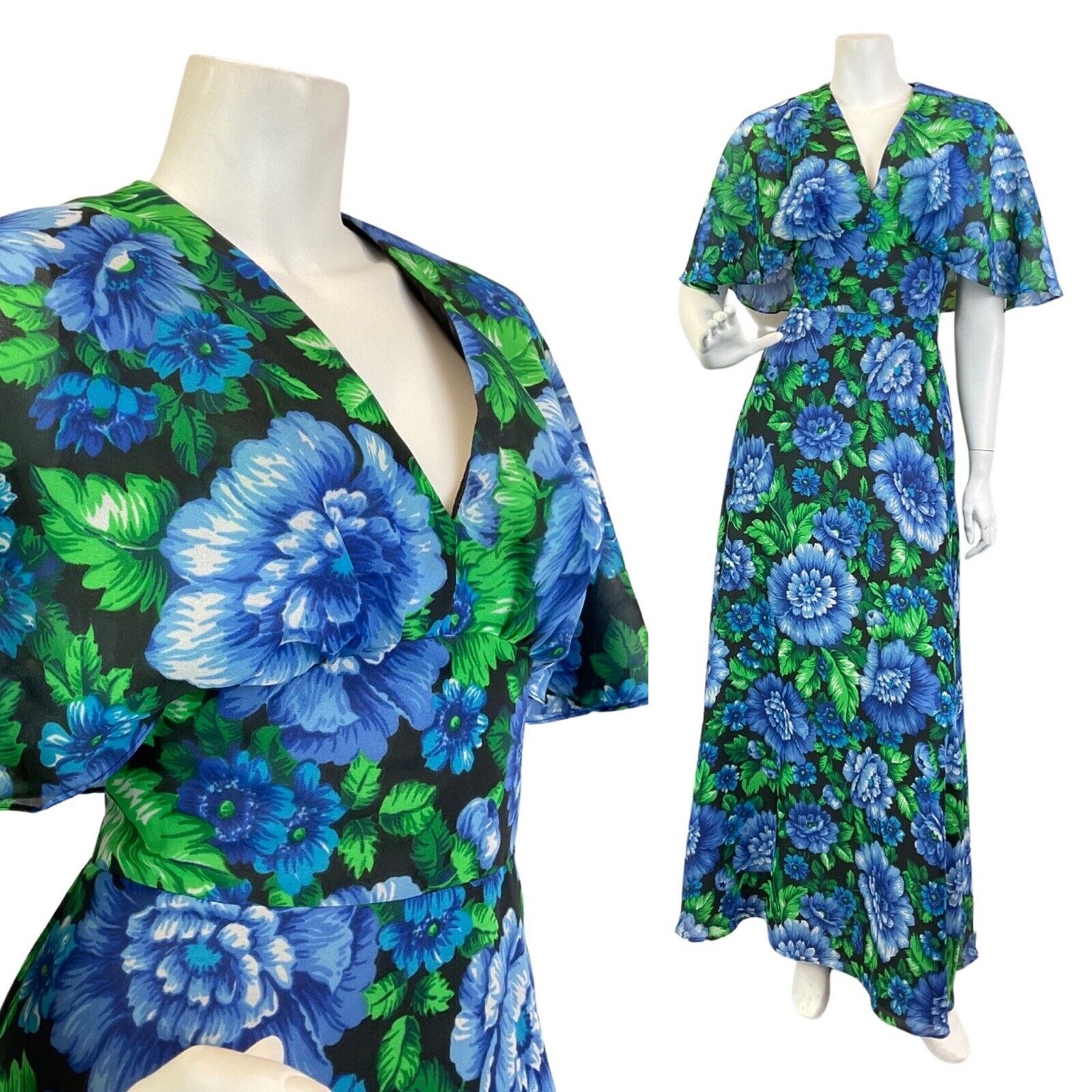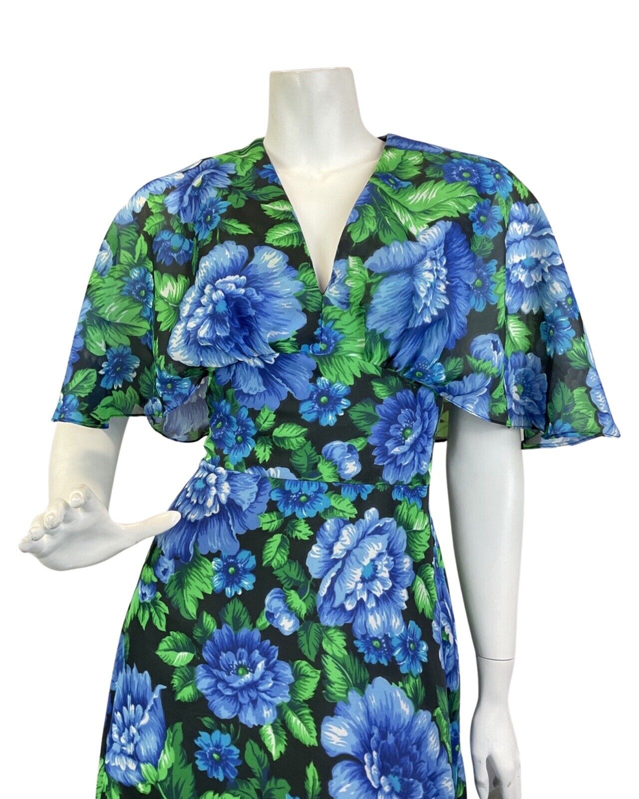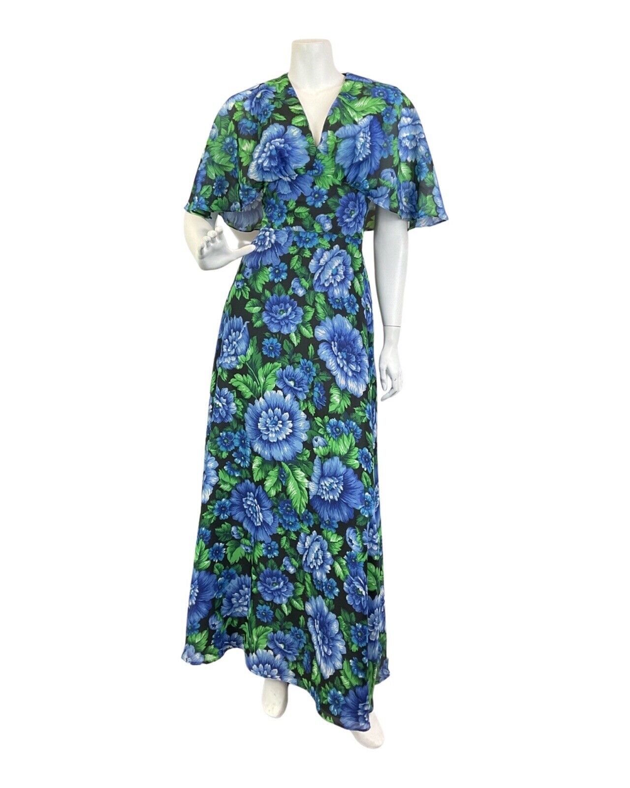 VINTAGE 60s 70s BLUE GREEN BLACK FLORAL CAPE SLEEVE SUMMER MAXI DRESS 10 12