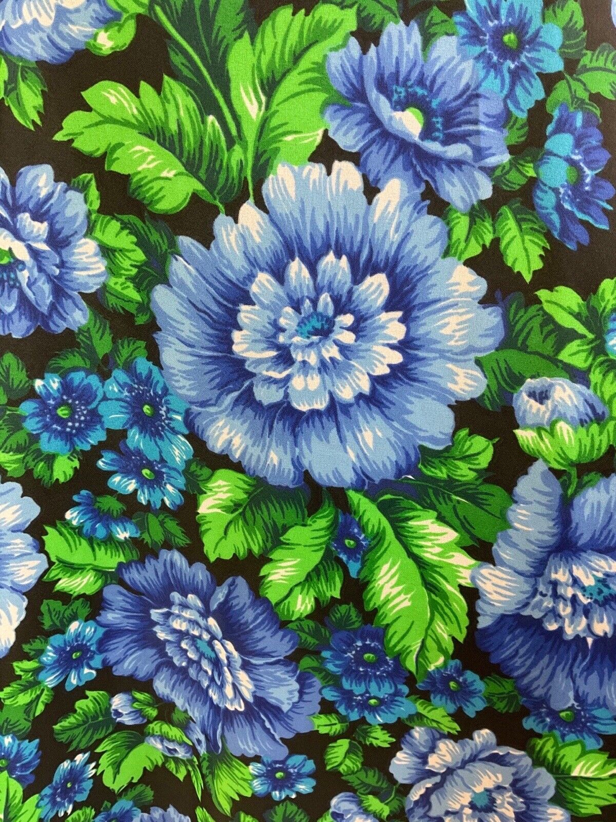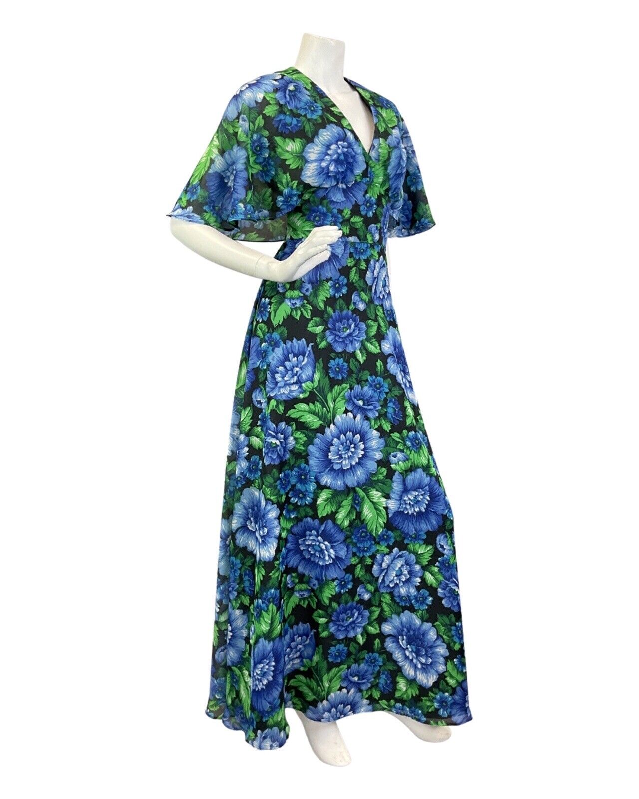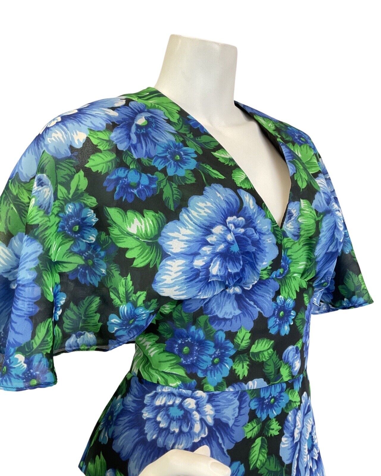 VINTAGE 60s 70s BLUE GREEN BLACK FLORAL CAPE SLEEVE SUMMER MAXI DRESS 10 12