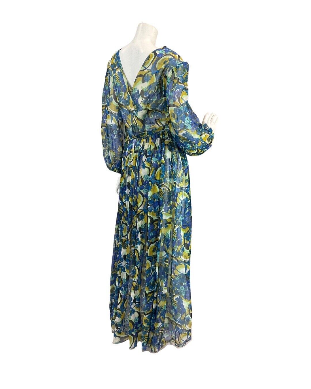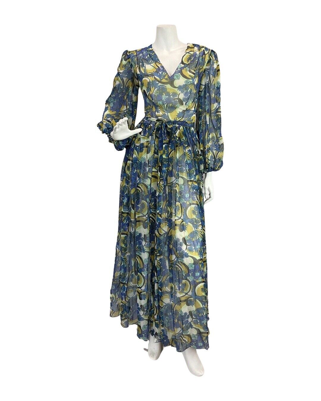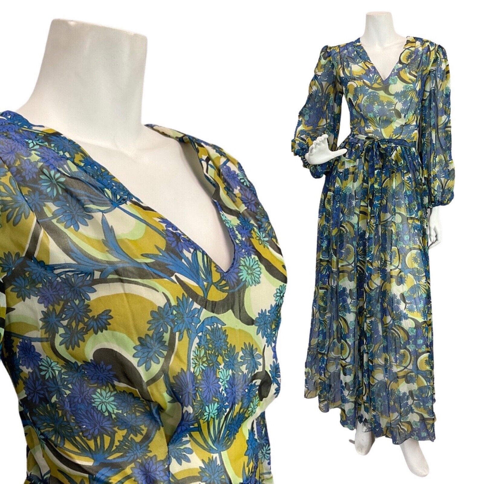 VINTAGE 60s 70s BLUE GREEN GOLD PSYCHEDELIC FLORAL SWIRL SHEER MAXI DRESS 8 10