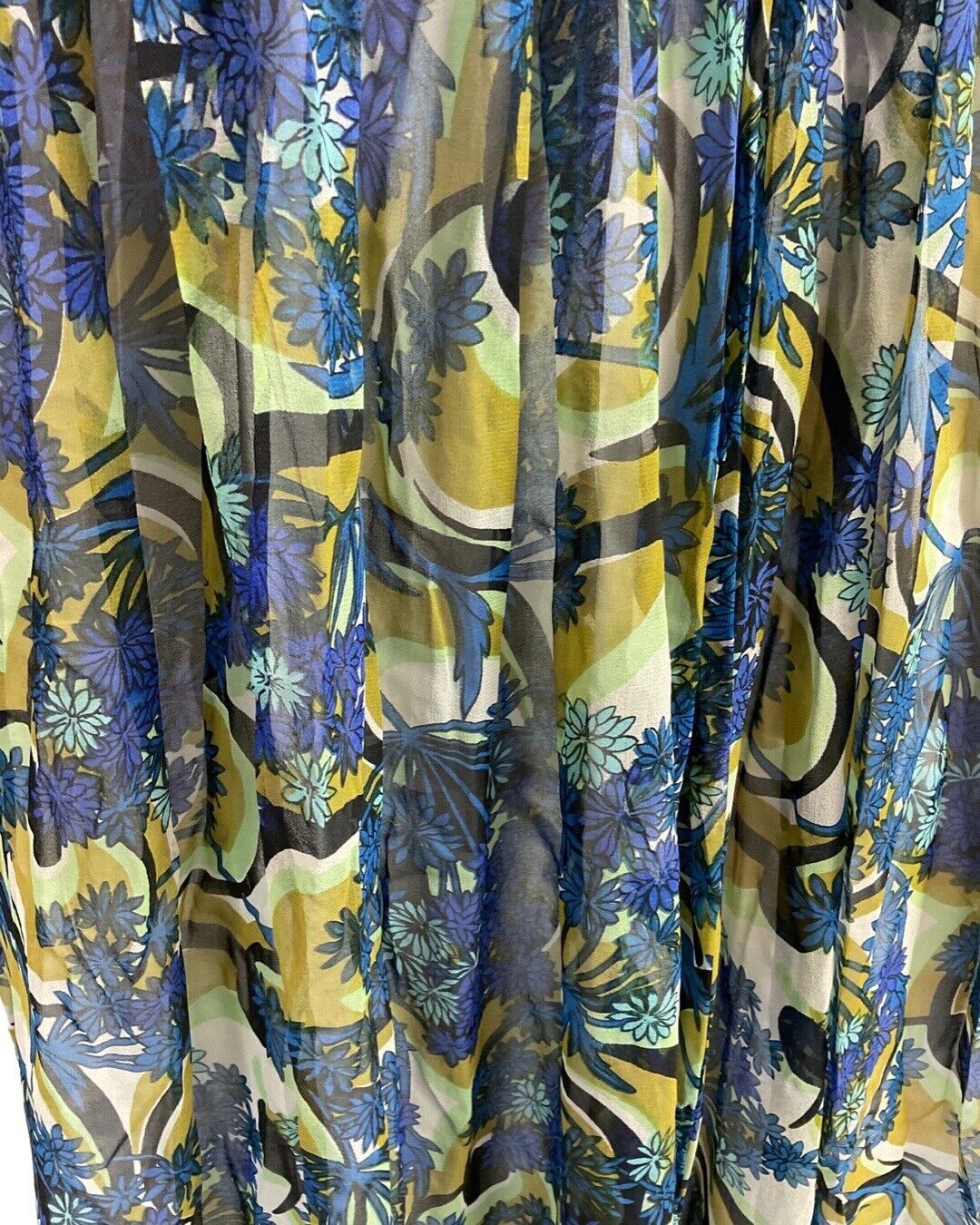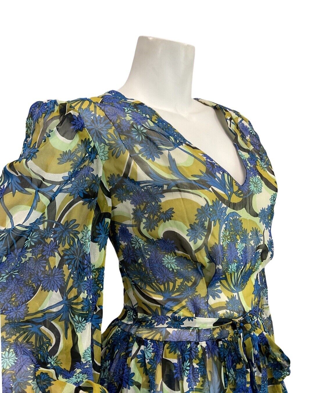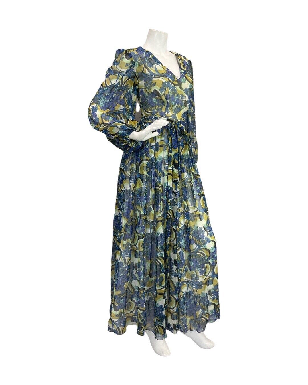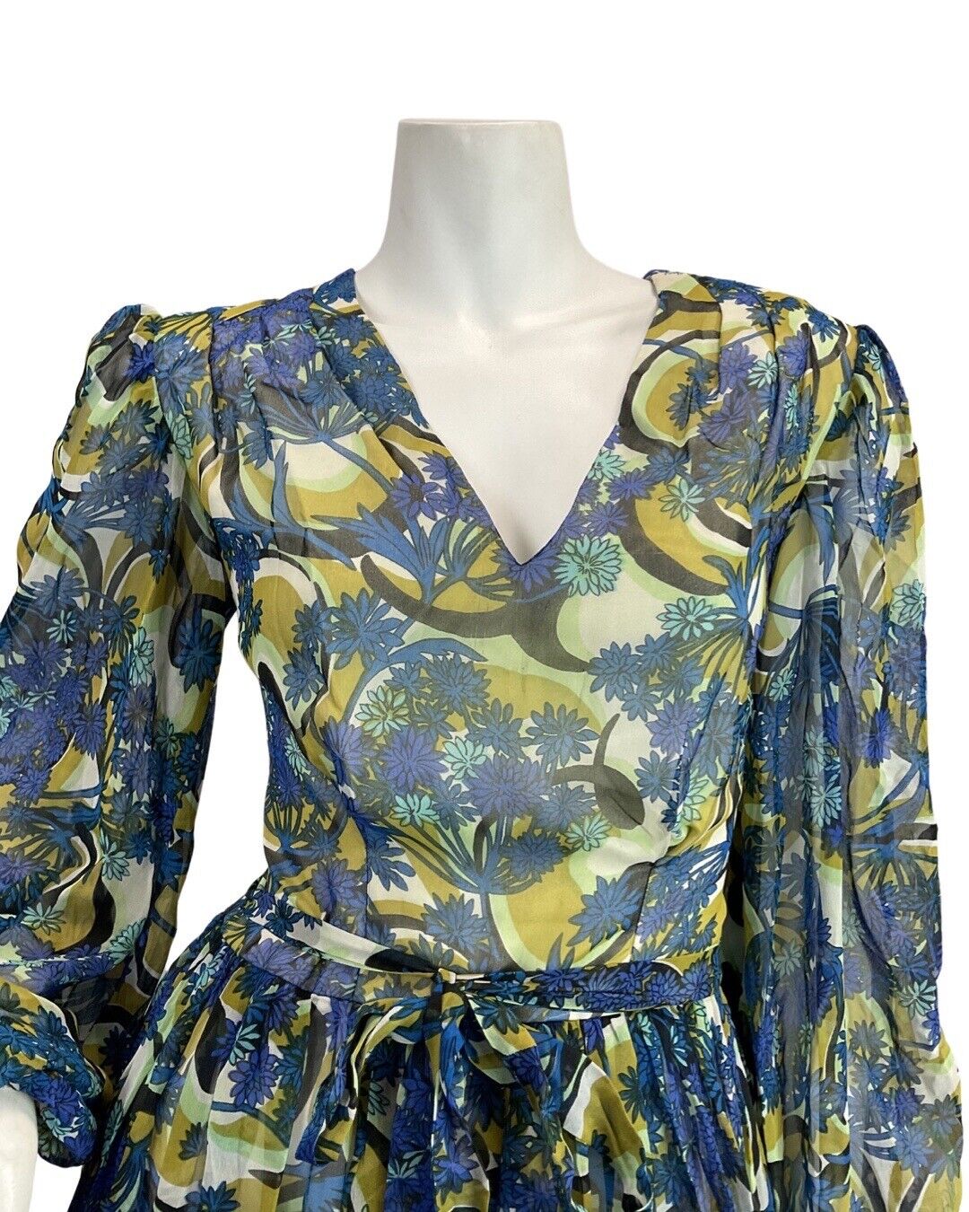 VINTAGE 60s 70s BLUE GREEN GOLD PSYCHEDELIC FLORAL SWIRL SHEER MAXI DRESS 8 10