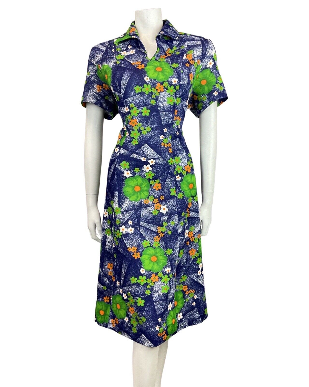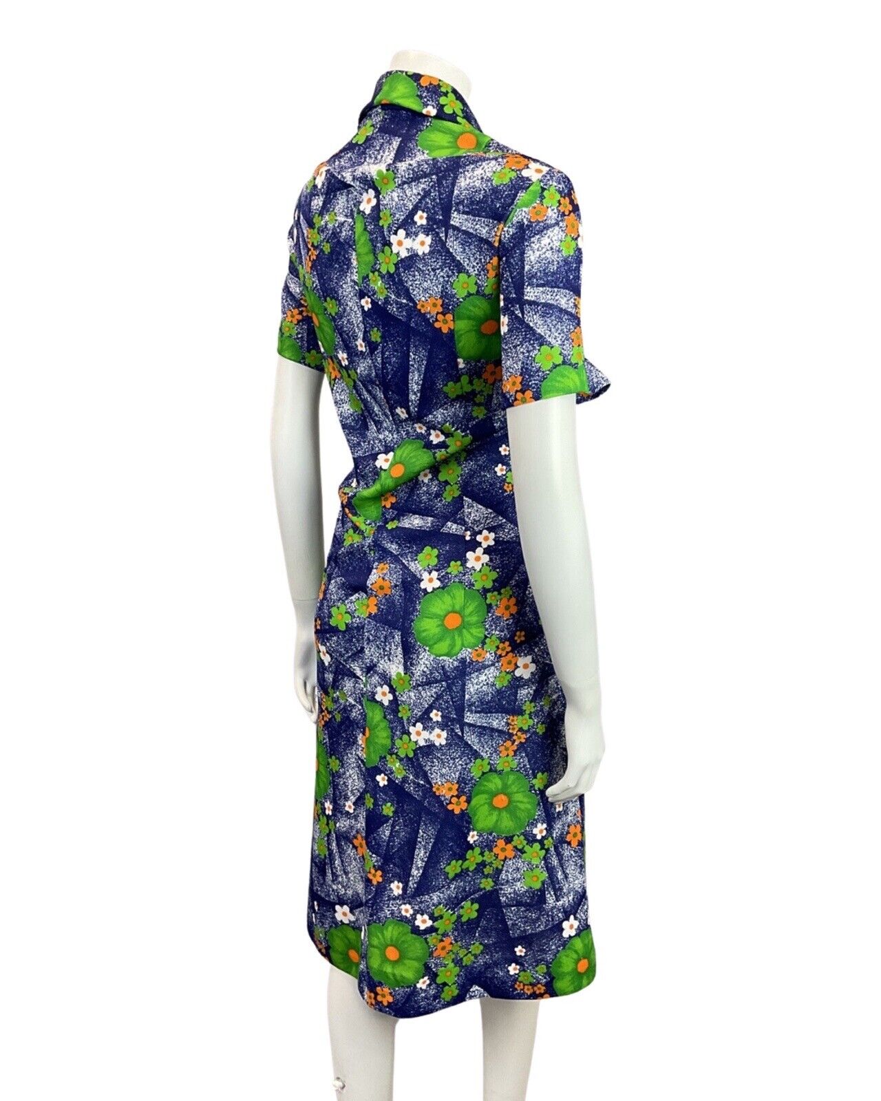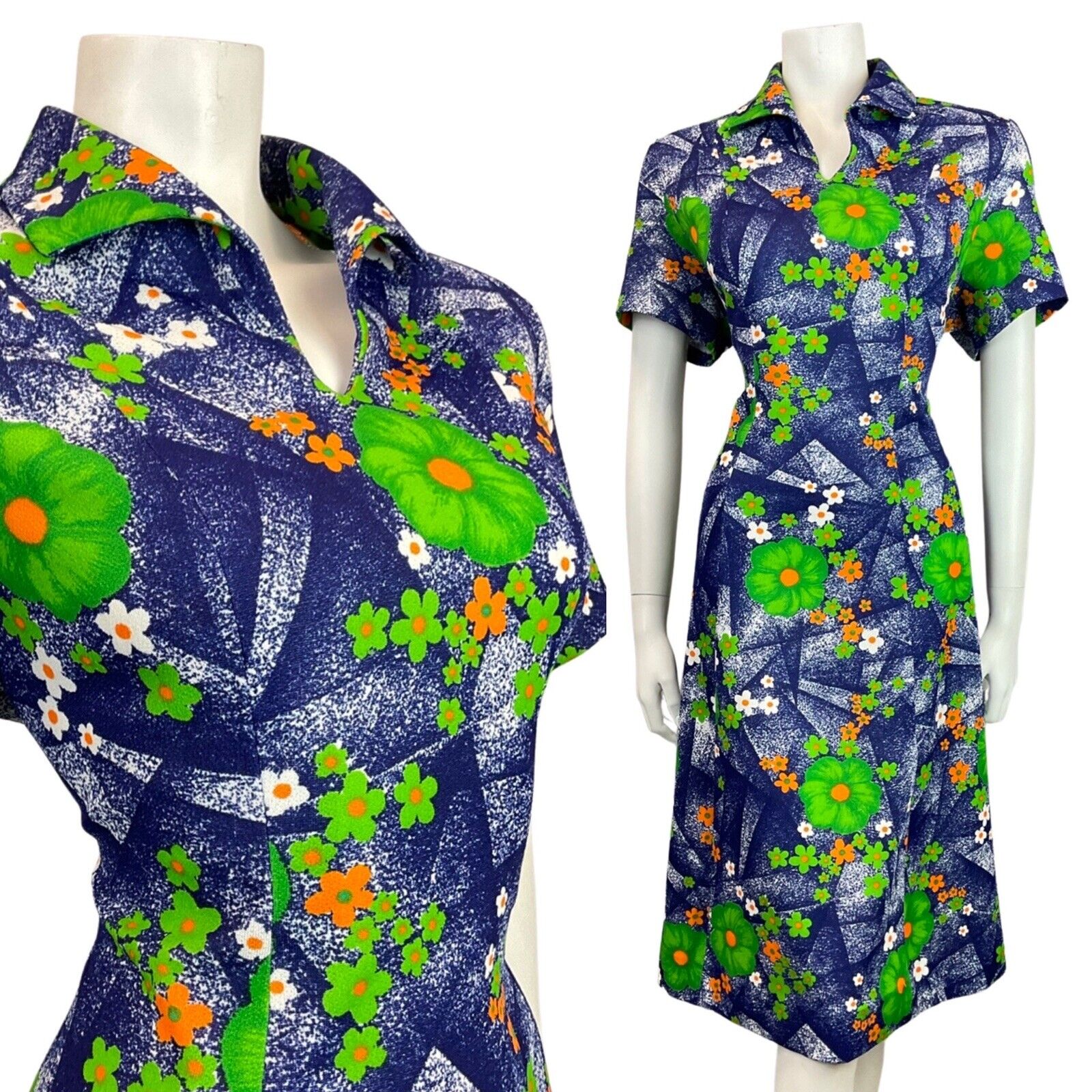 VINTAGE 60s 70s BLUE GREEN ORANGE FLORAL DAISY WING COLLAR MOD SHIRT DRESS 16