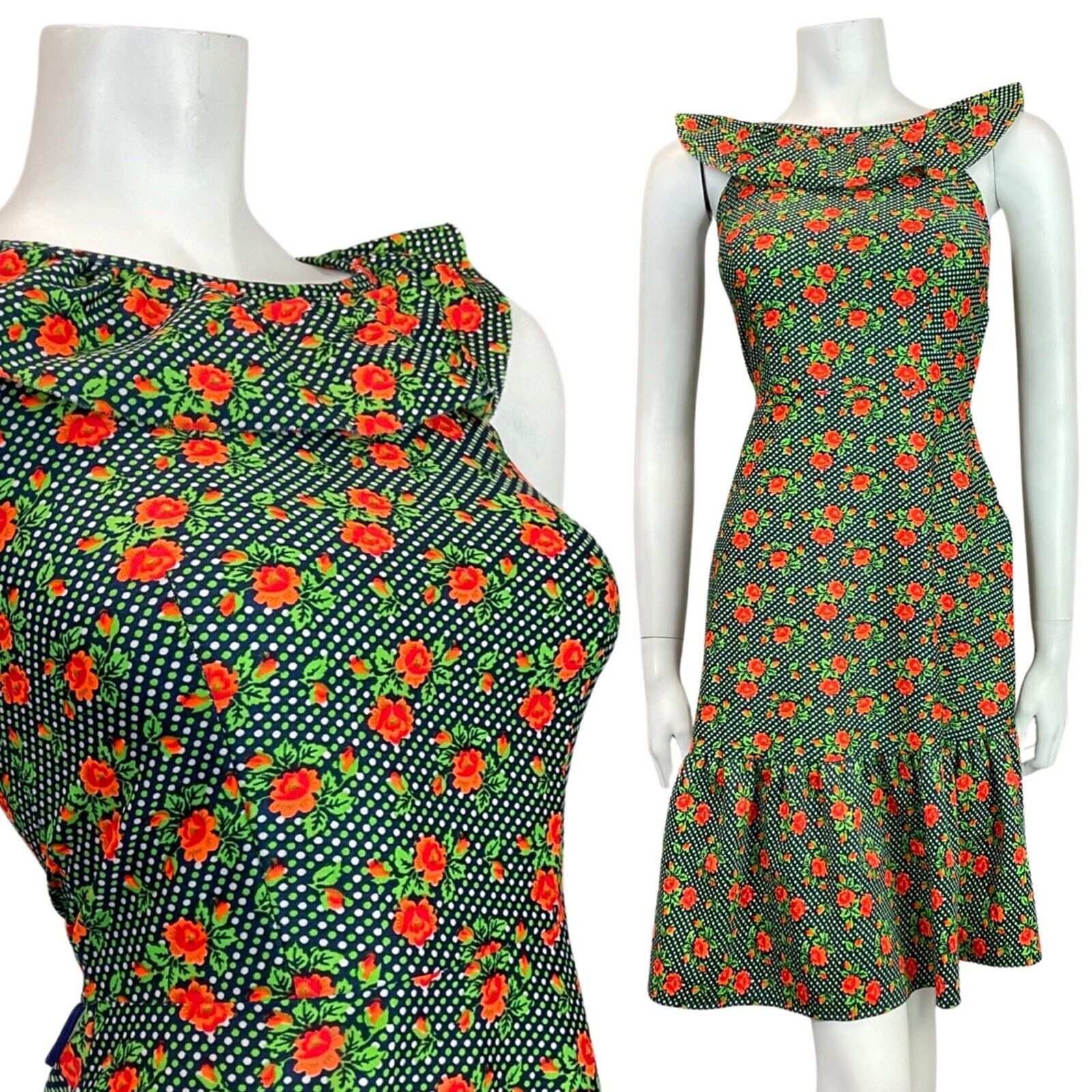 VINTAGE 60s 70s BLUE GREEN ORANGE POLKA-DOT FLORAL ROSE RUFFLE SUMMER DRESS 4