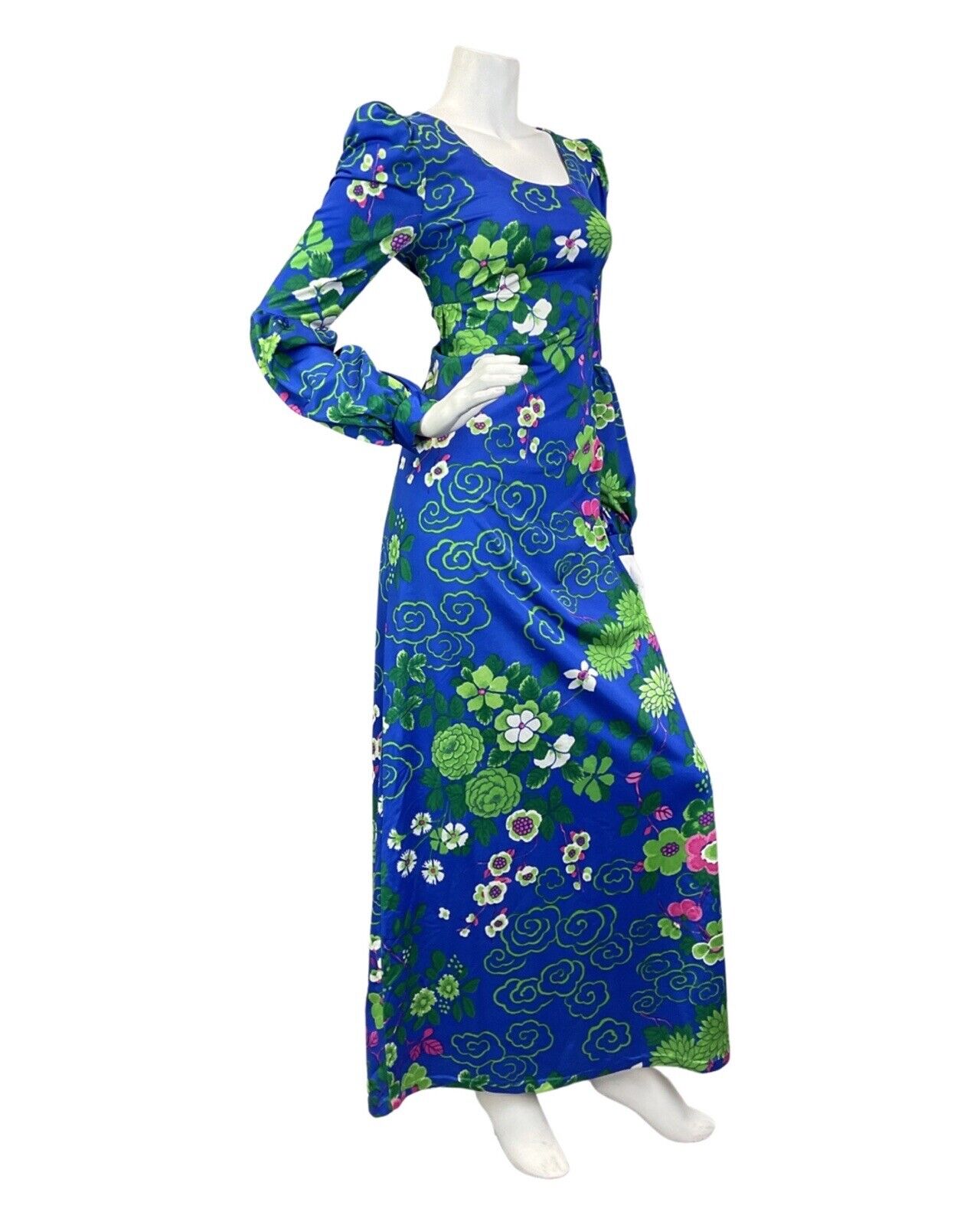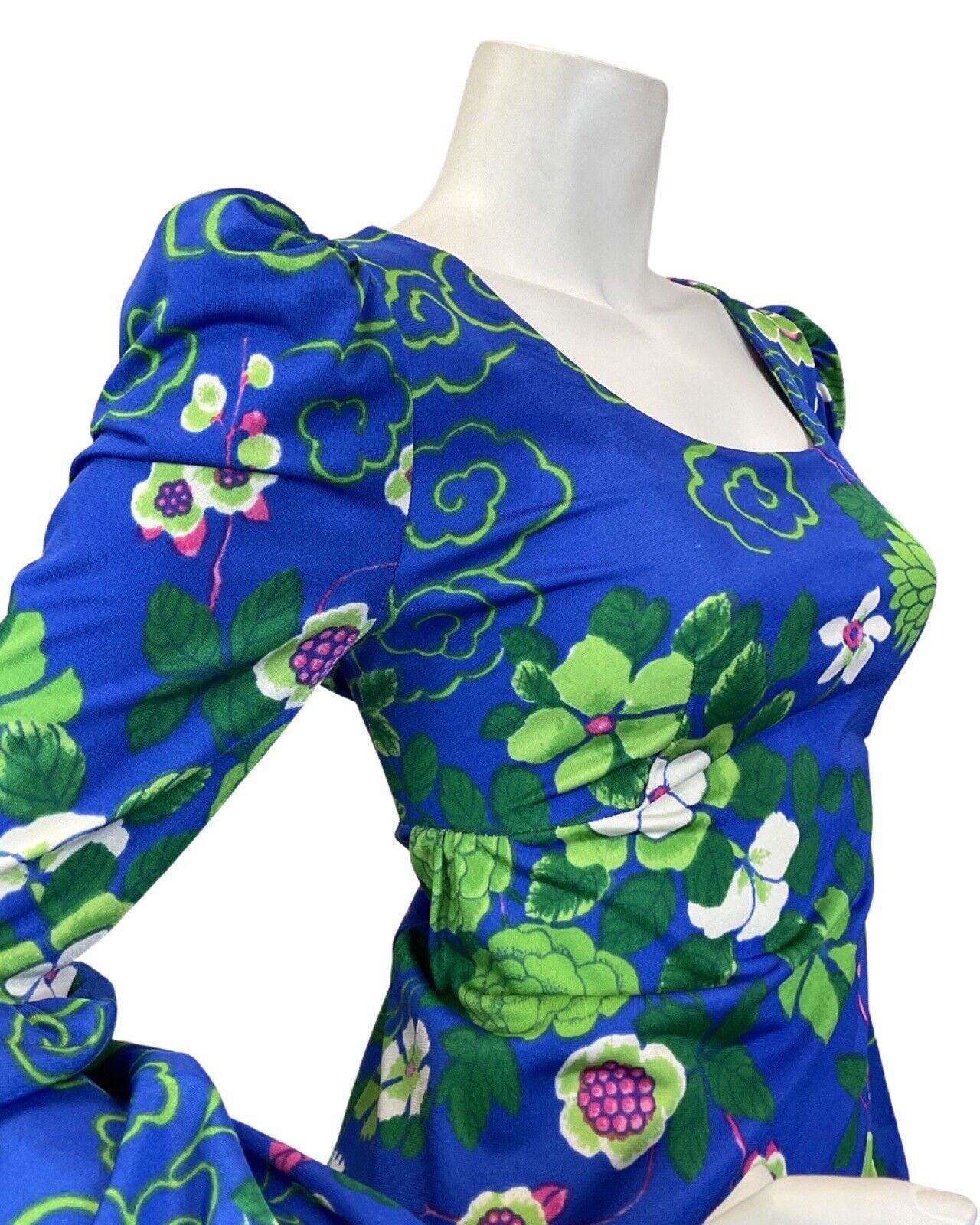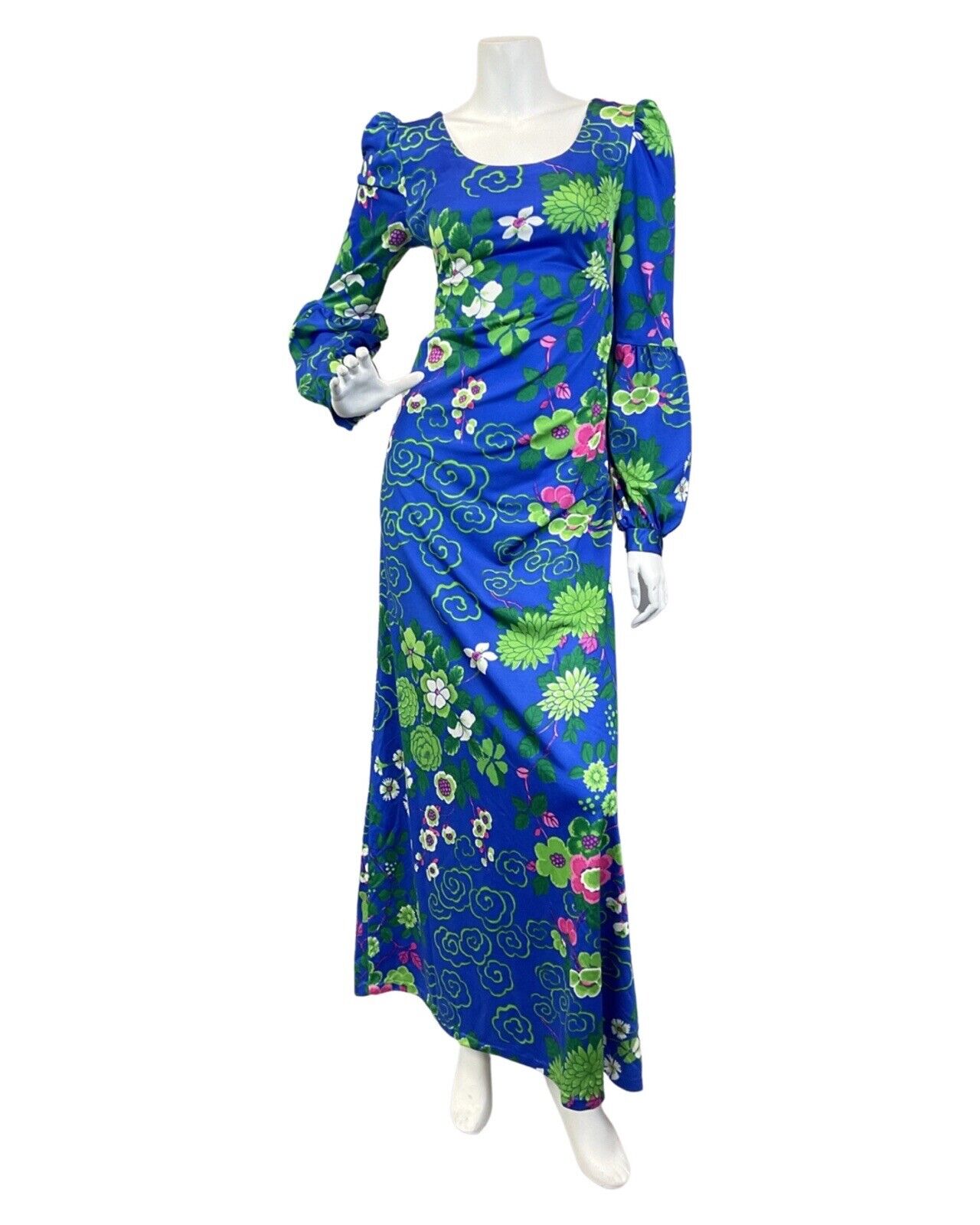 VINTAGE 60s 70s BLUE GREEN PINK PSYCHEDELIC FLORAL JULIET SLEEVE MAXI DRESS 8 10