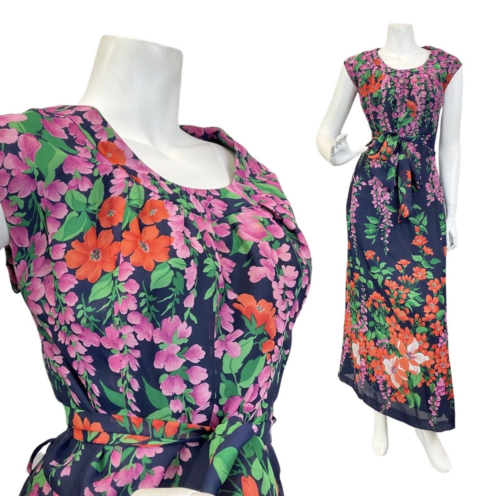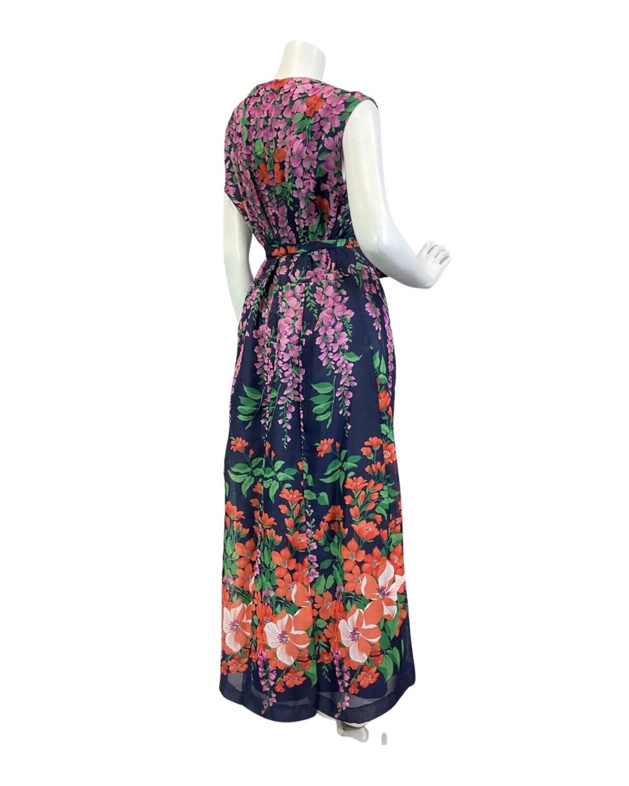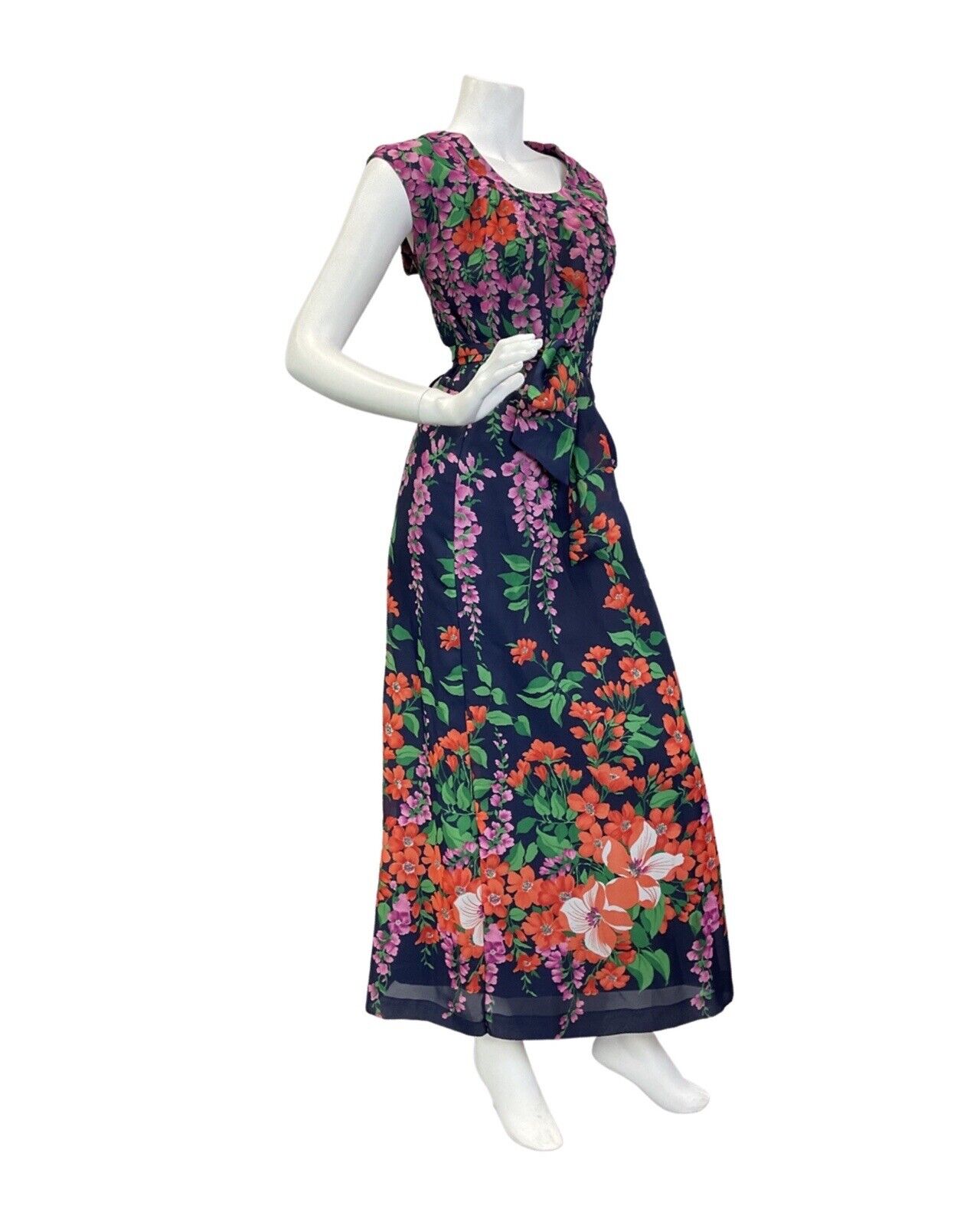 VINTAGE 60s 70s BLUE GREEN RED FLORAL WISTERIA SLEEVELESS MAXI DRESS 18
