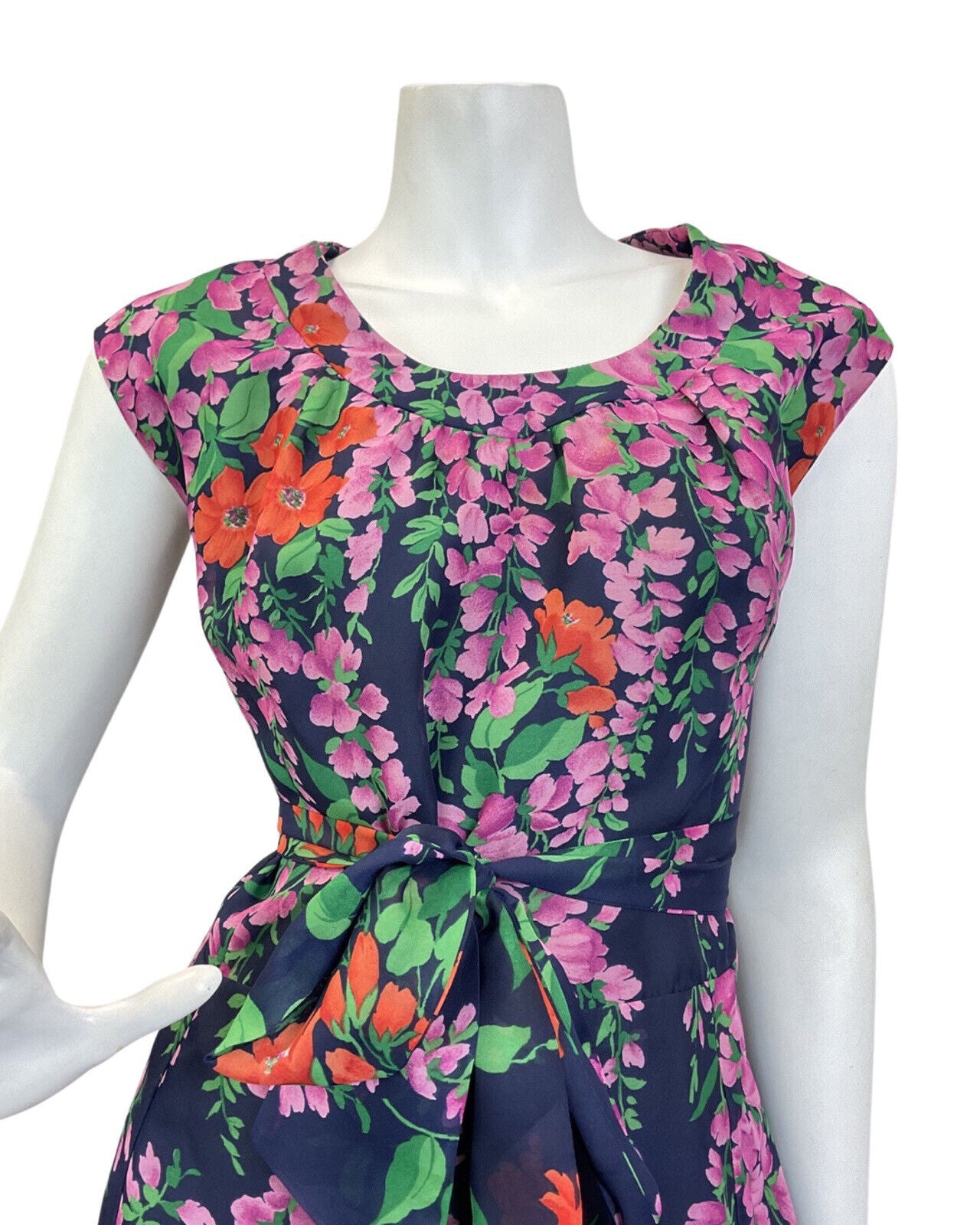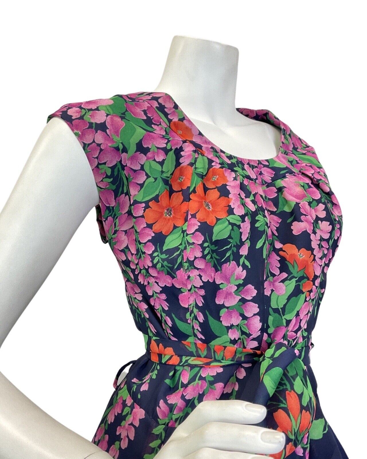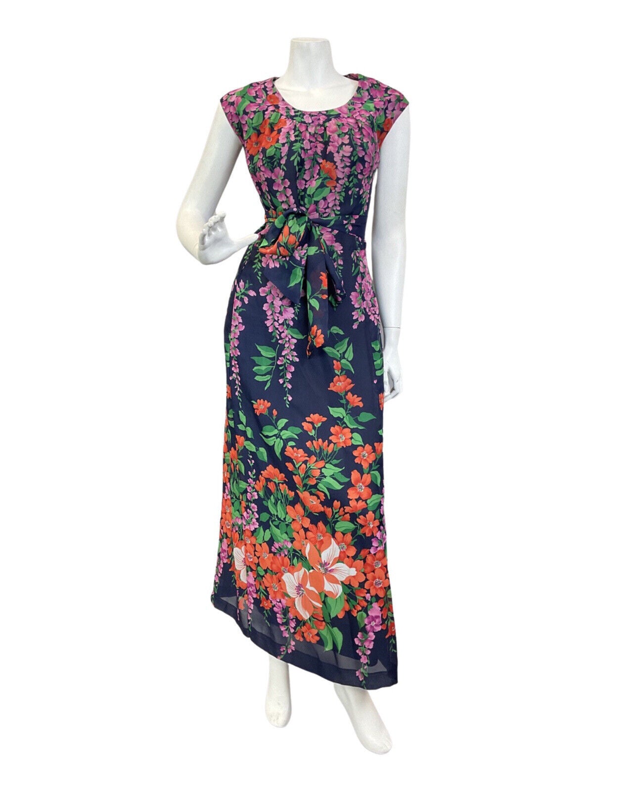 VINTAGE 60s 70s BLUE GREEN RED FLORAL WISTERIA SLEEVELESS MAXI DRESS 18