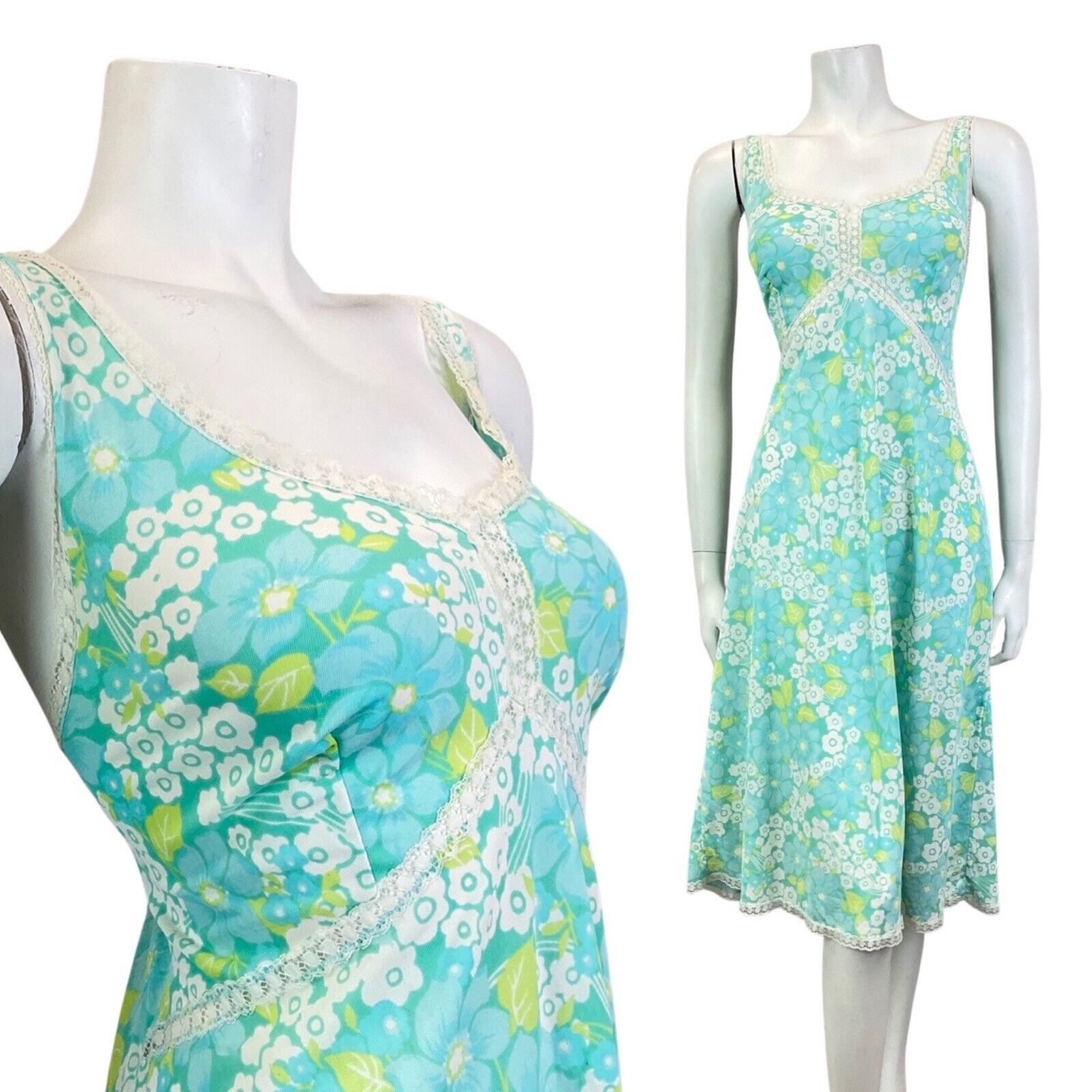 VINTAGE 60s 70s BLUE GREEN WHITE DAISY FLOWER LACE SUMMER NIGHT SLIP DRESS 14 16