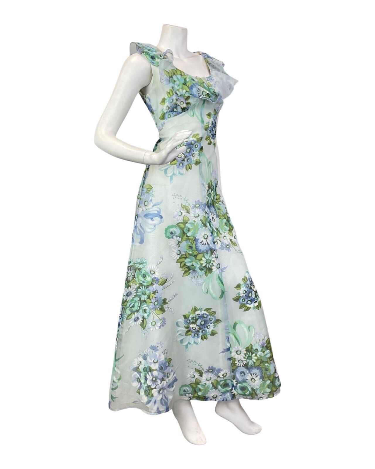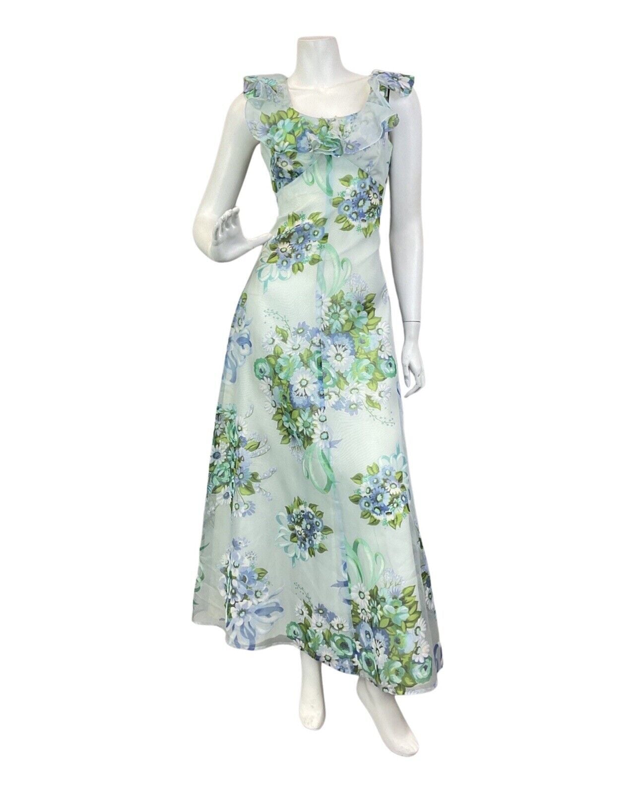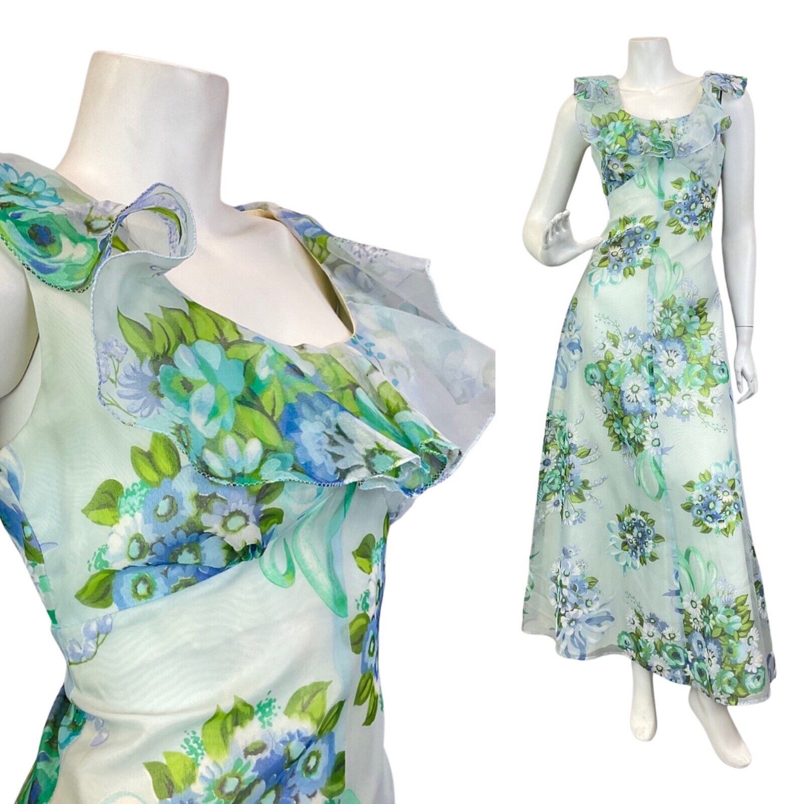 VINTAGE 60s 70s BLUE GREEN WHITE FLORAL BOUQUET RUFFLED SUMMER MAXI DRESS 8 10