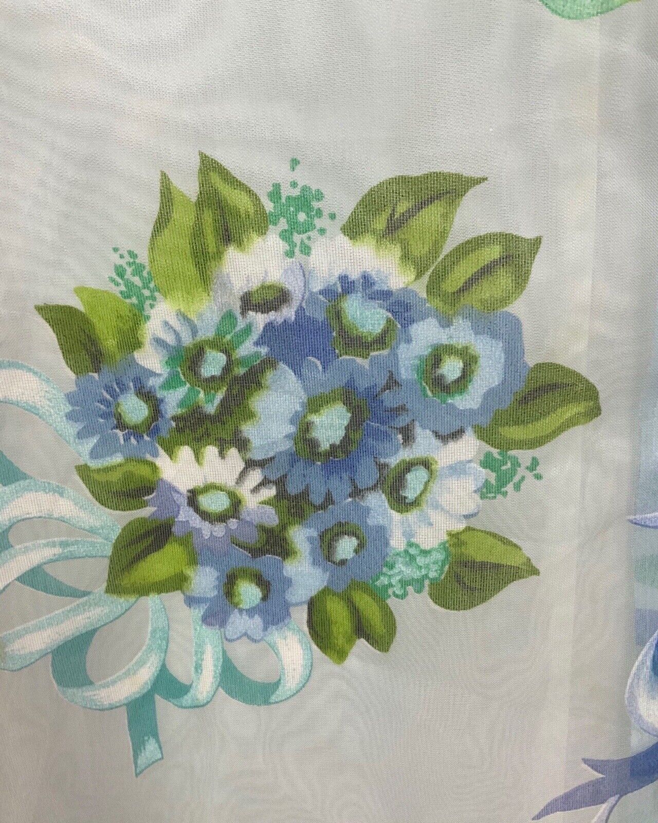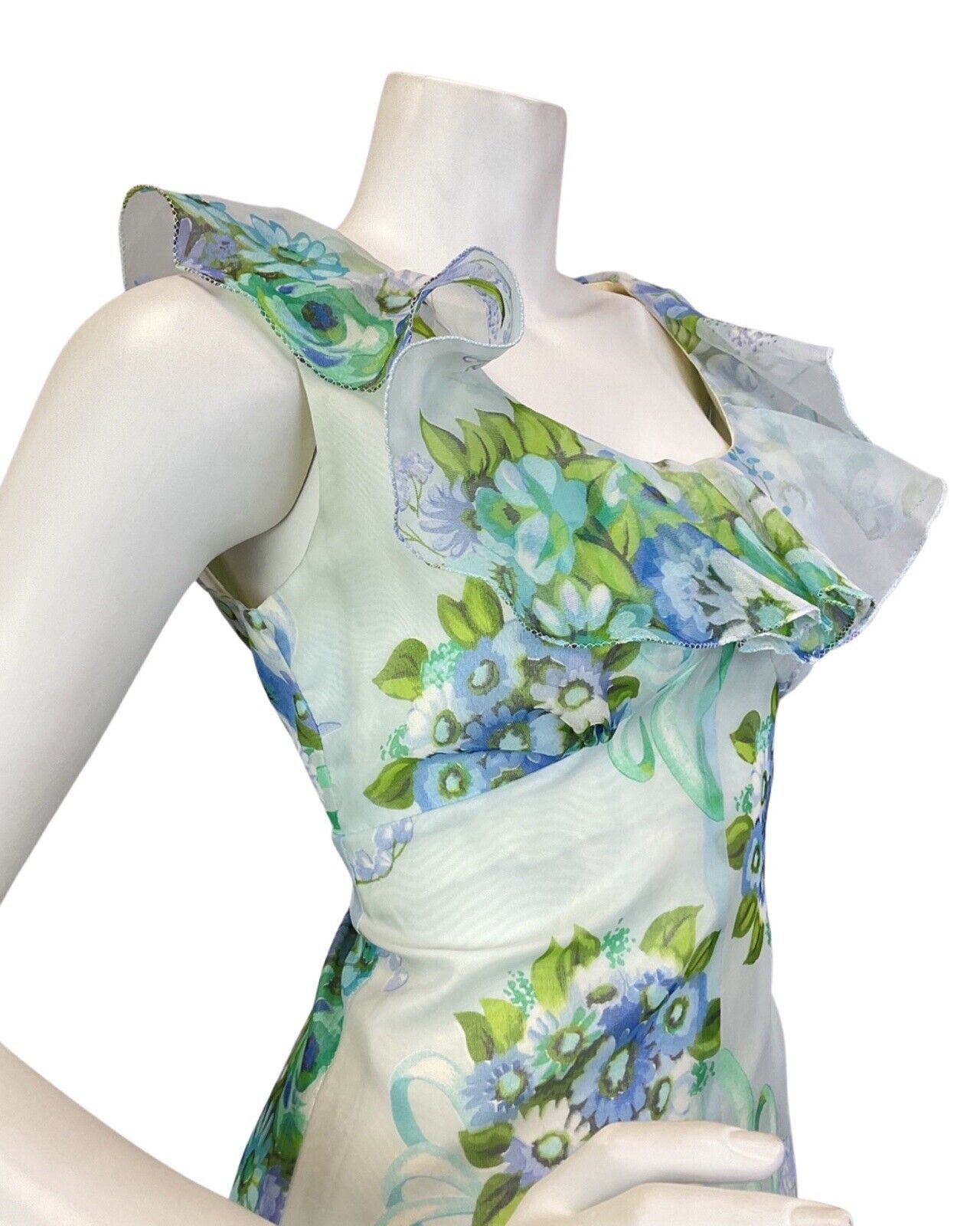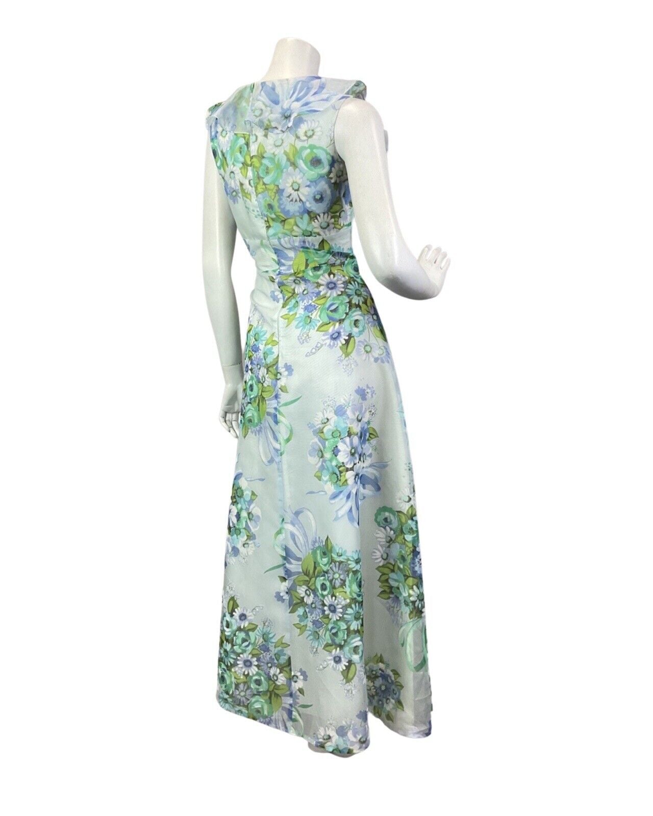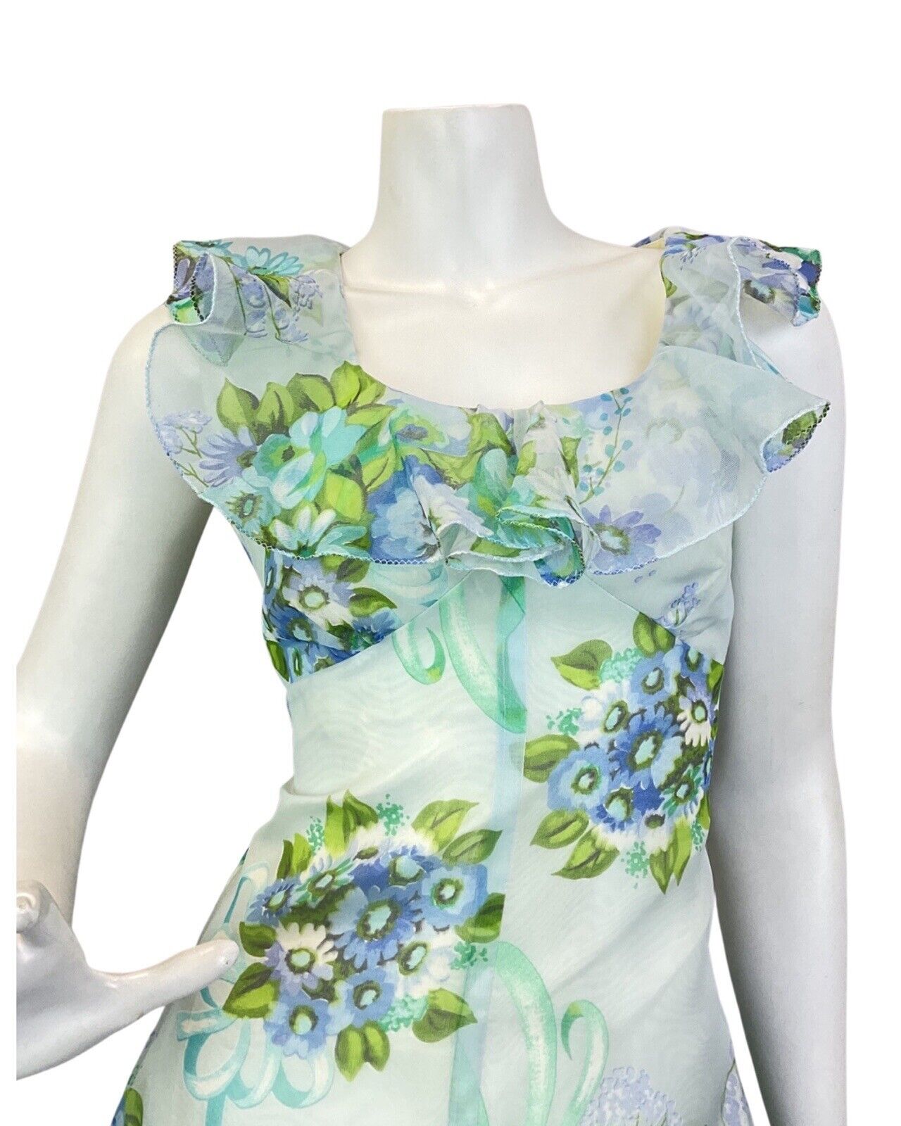 VINTAGE 60s 70s BLUE GREEN WHITE FLORAL BOUQUET RUFFLED SUMMER MAXI DRESS 8 10