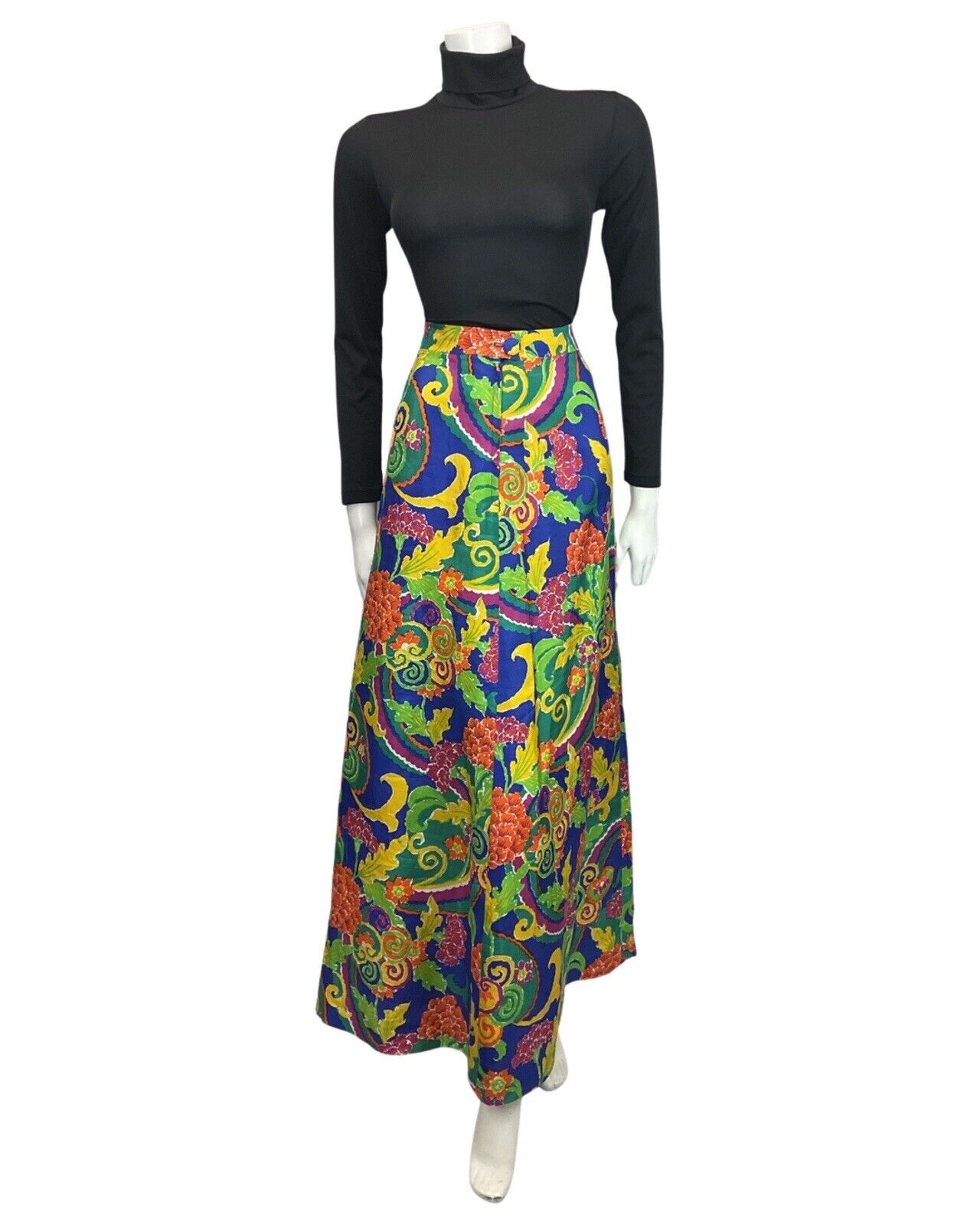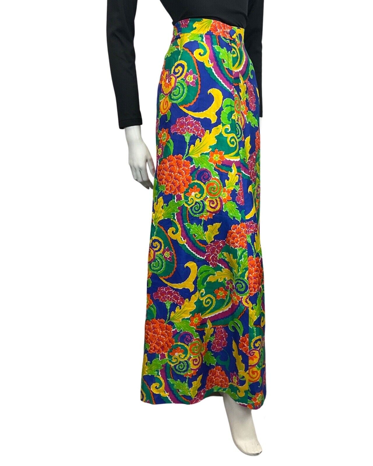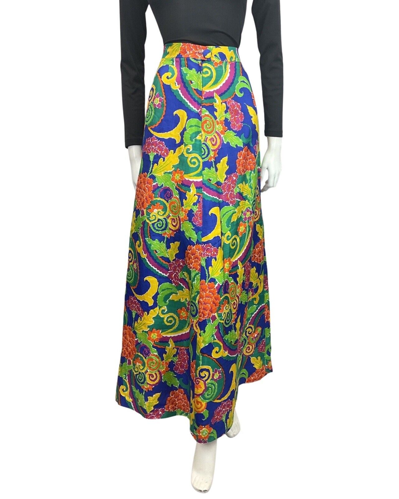 VINTAGE 60s 70s BLUE GREEN YELLOW PSYCHEDELIC FLORAL SWIRL MOD MAXI SKIRT 10