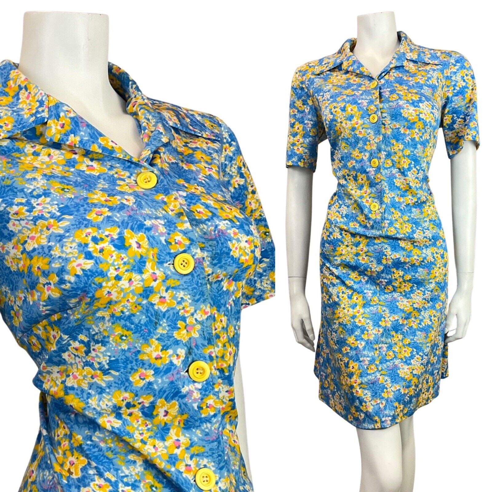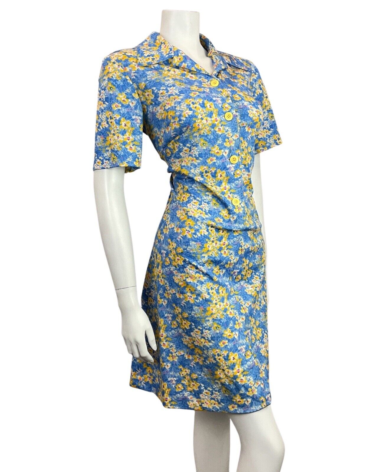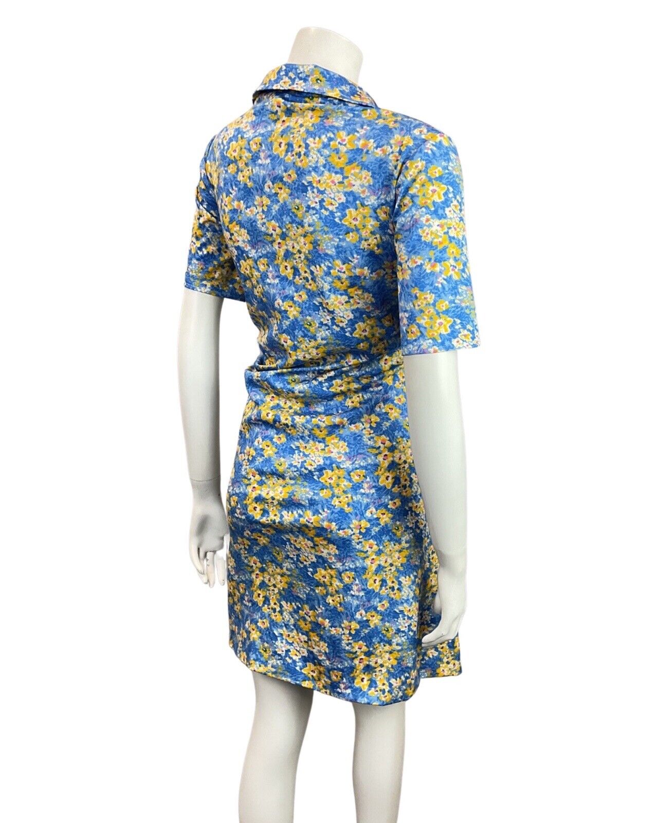 VINTAGE 60s 70s BLUE NAVY YELLOW PSYCHEDELIC FLORAL MOD DAGGER SHIRT DRESS 16