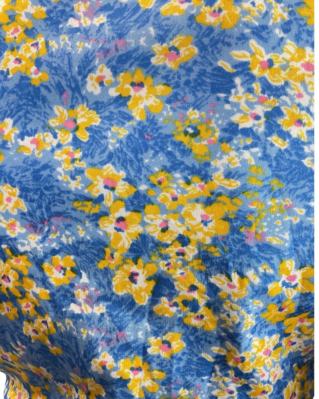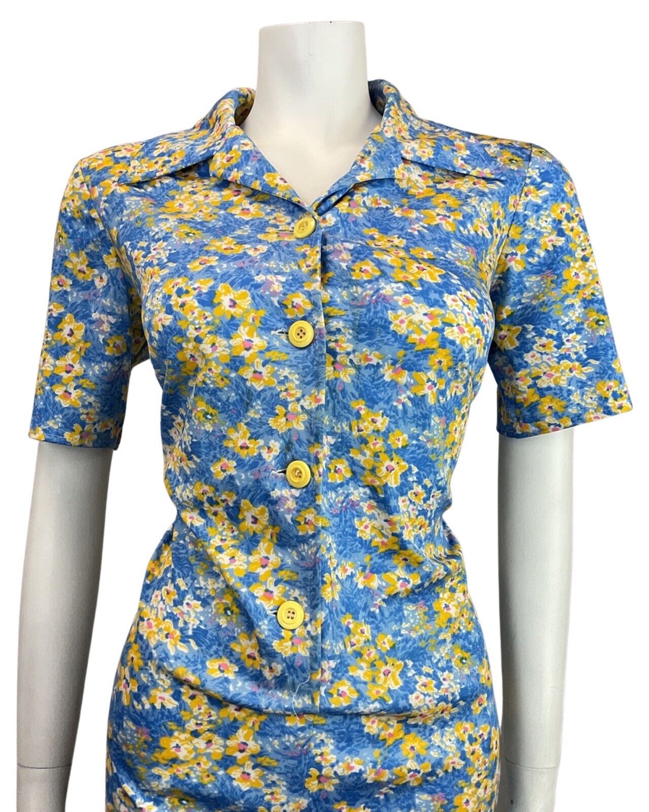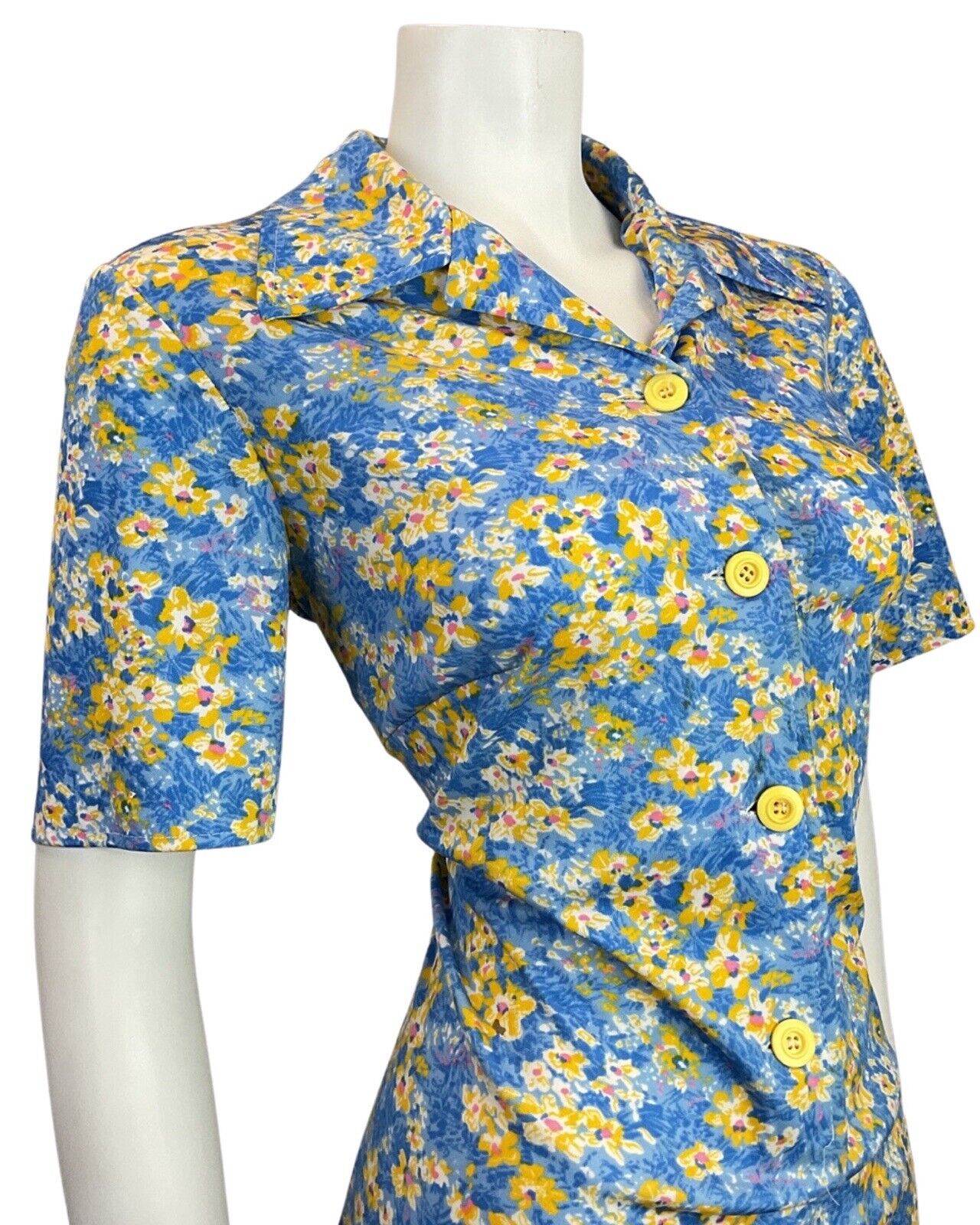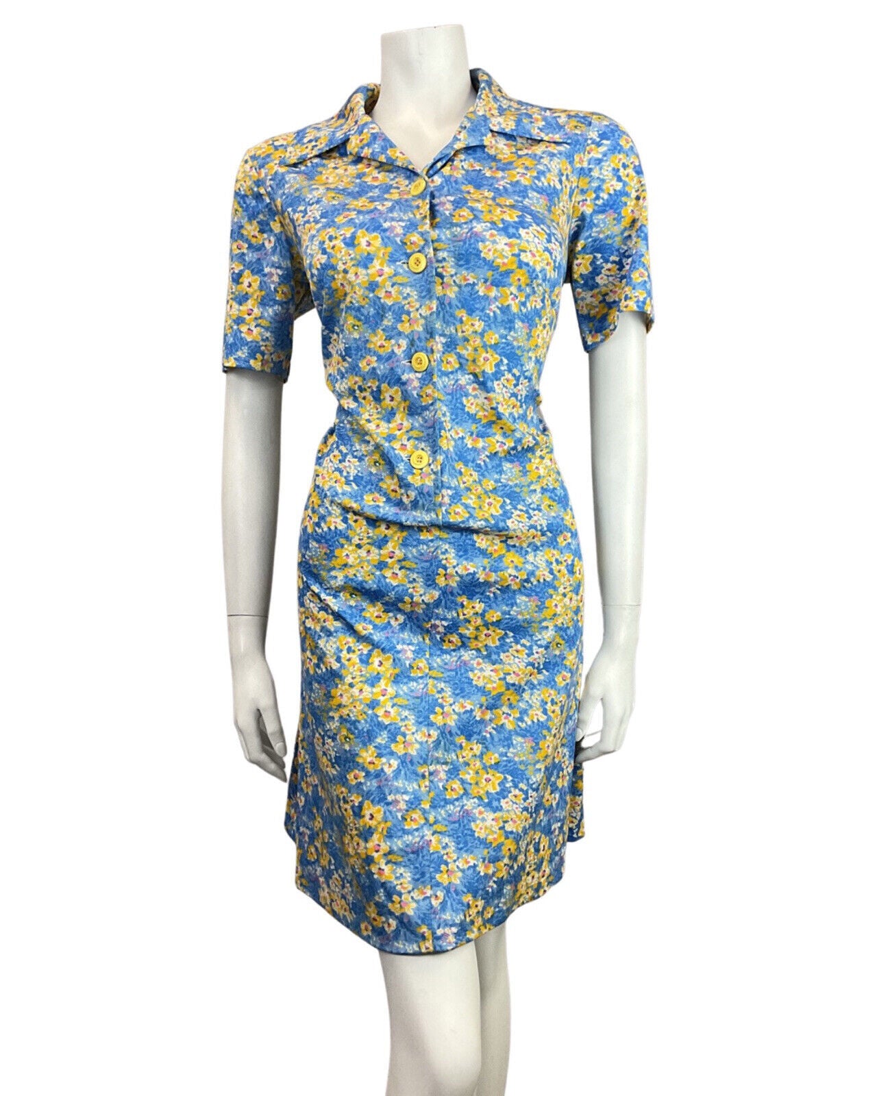 VINTAGE 60s 70s BLUE NAVY YELLOW PSYCHEDELIC FLORAL MOD DAGGER SHIRT DRESS 16