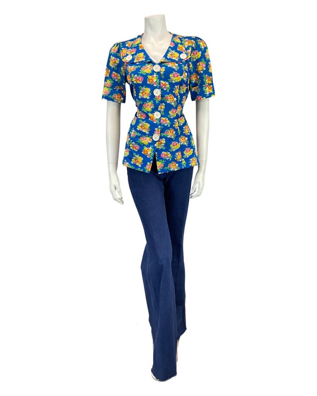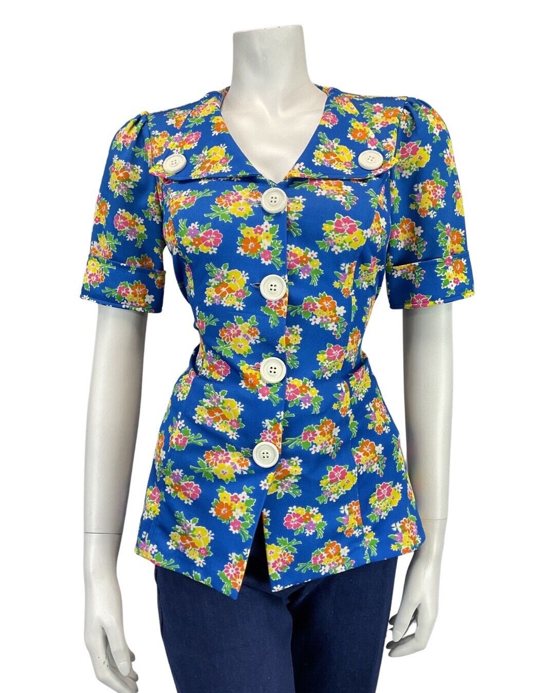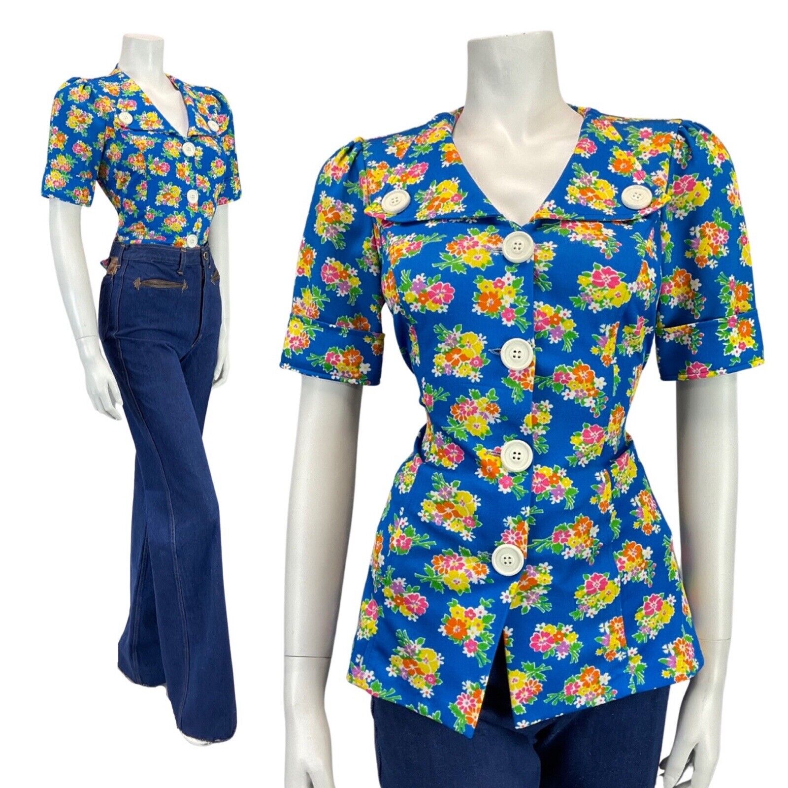 VINTAGE 60s 70s BLUE ORANGE GREEN FLOWER BOUQUET MOD SHIRT BLOUSE 14