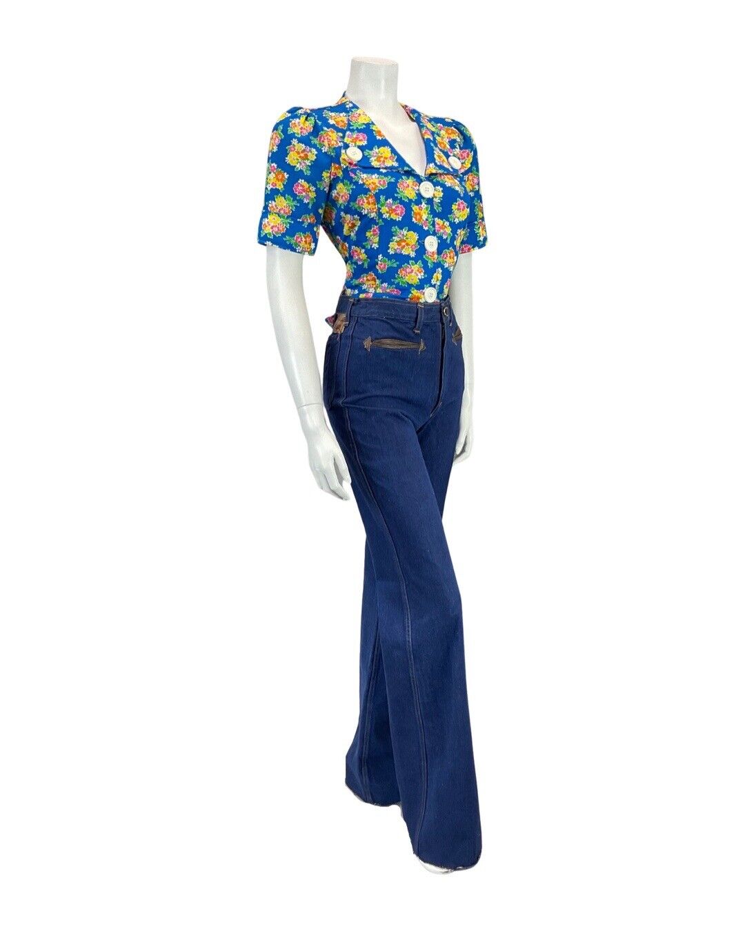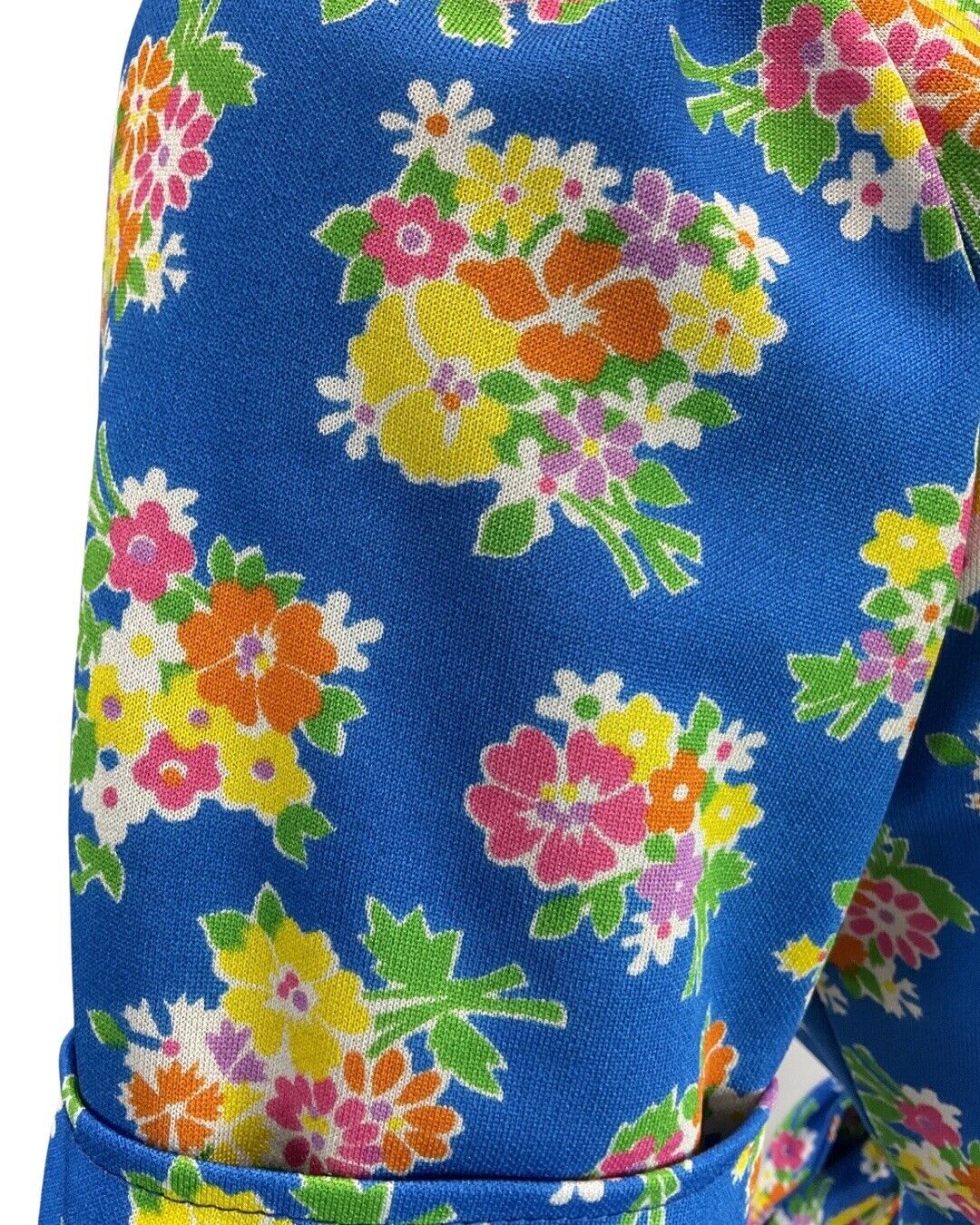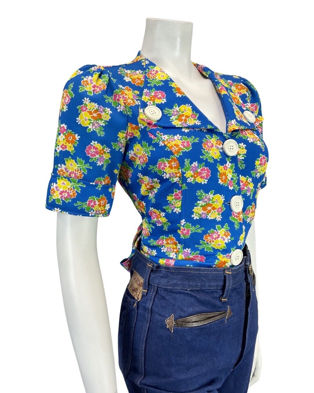 VINTAGE 60s 70s BLUE ORANGE GREEN FLOWER BOUQUET MOD SHIRT BLOUSE 14