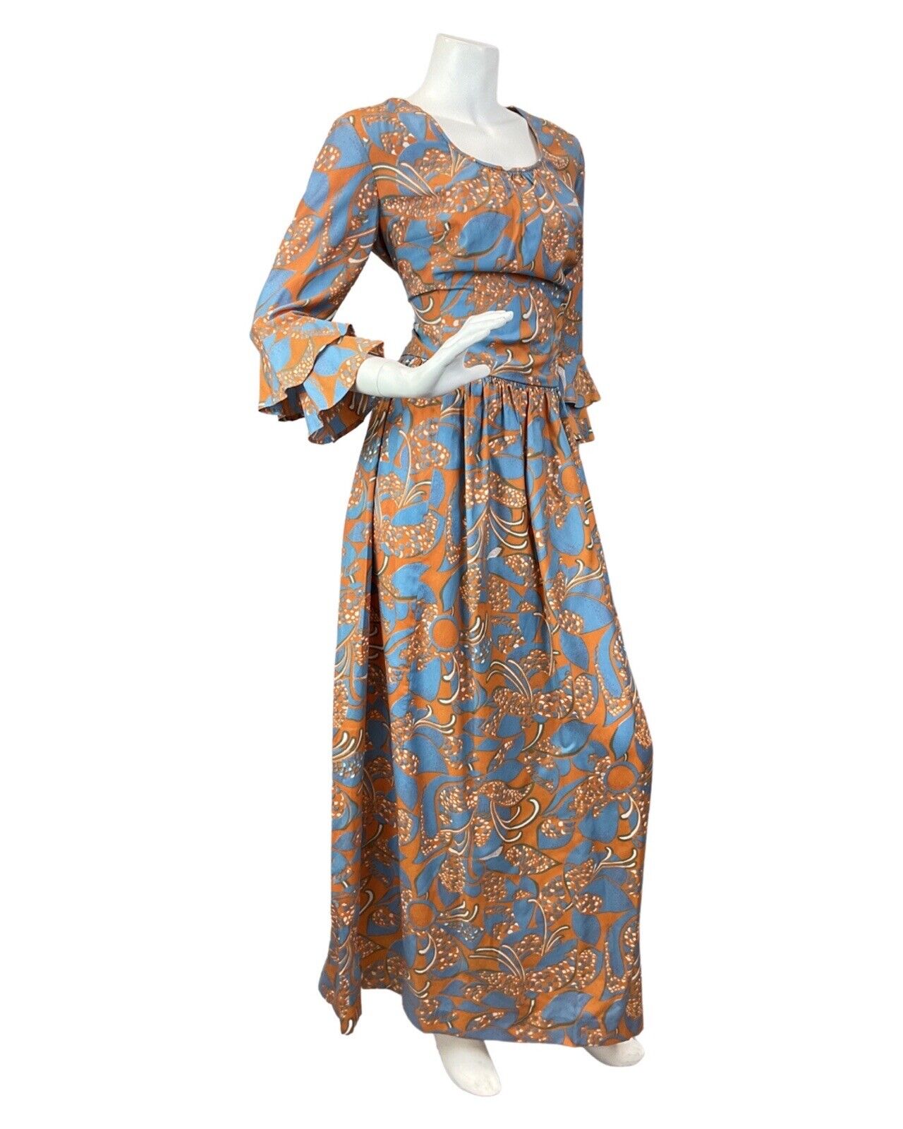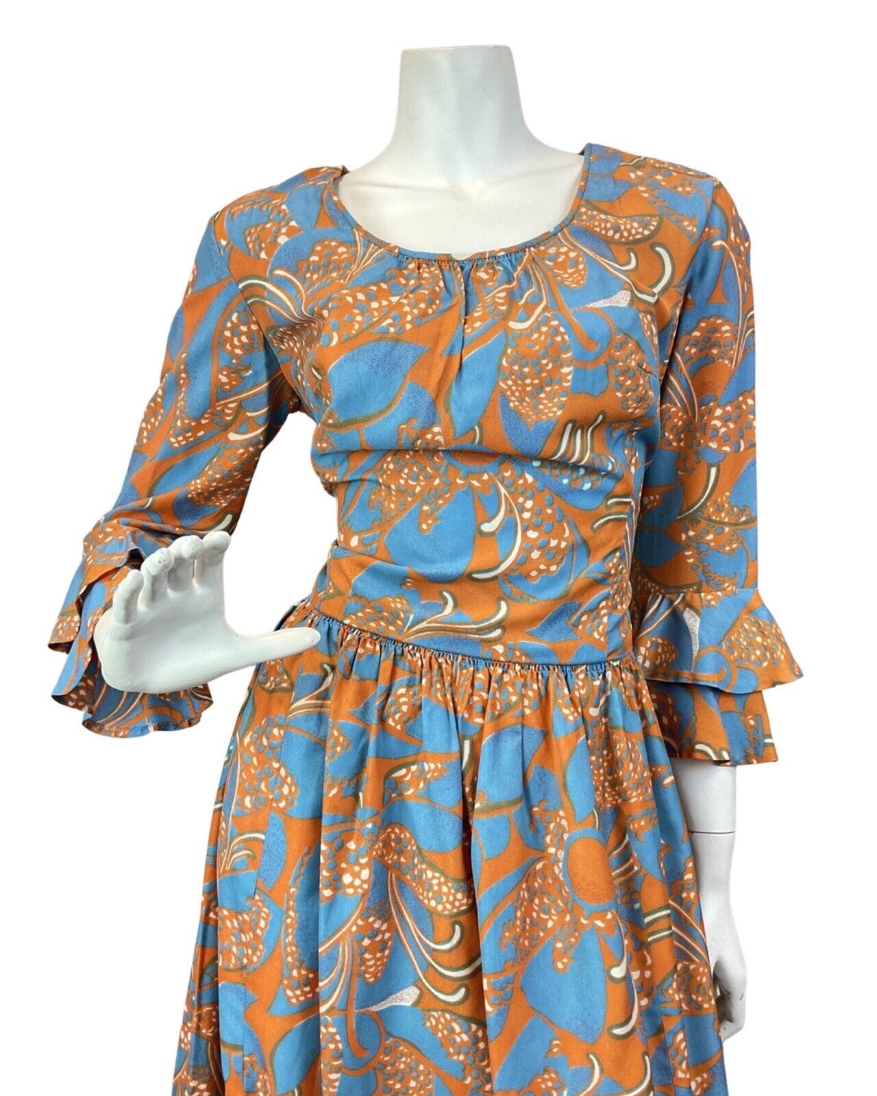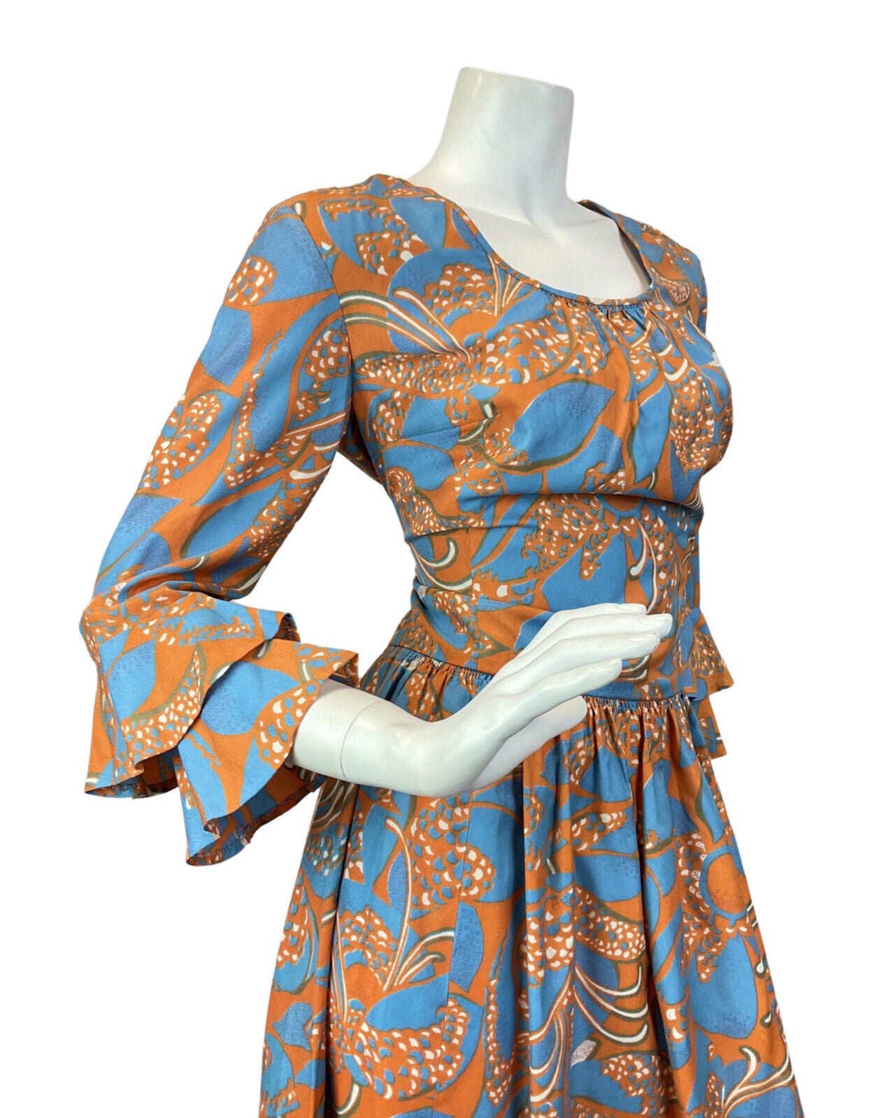 VINTAGE 60s 70s BLUE ORANGE PSYCHEDELIC FLORAL FLOUNCE SLEEVE MOD MAXI DRESS 12