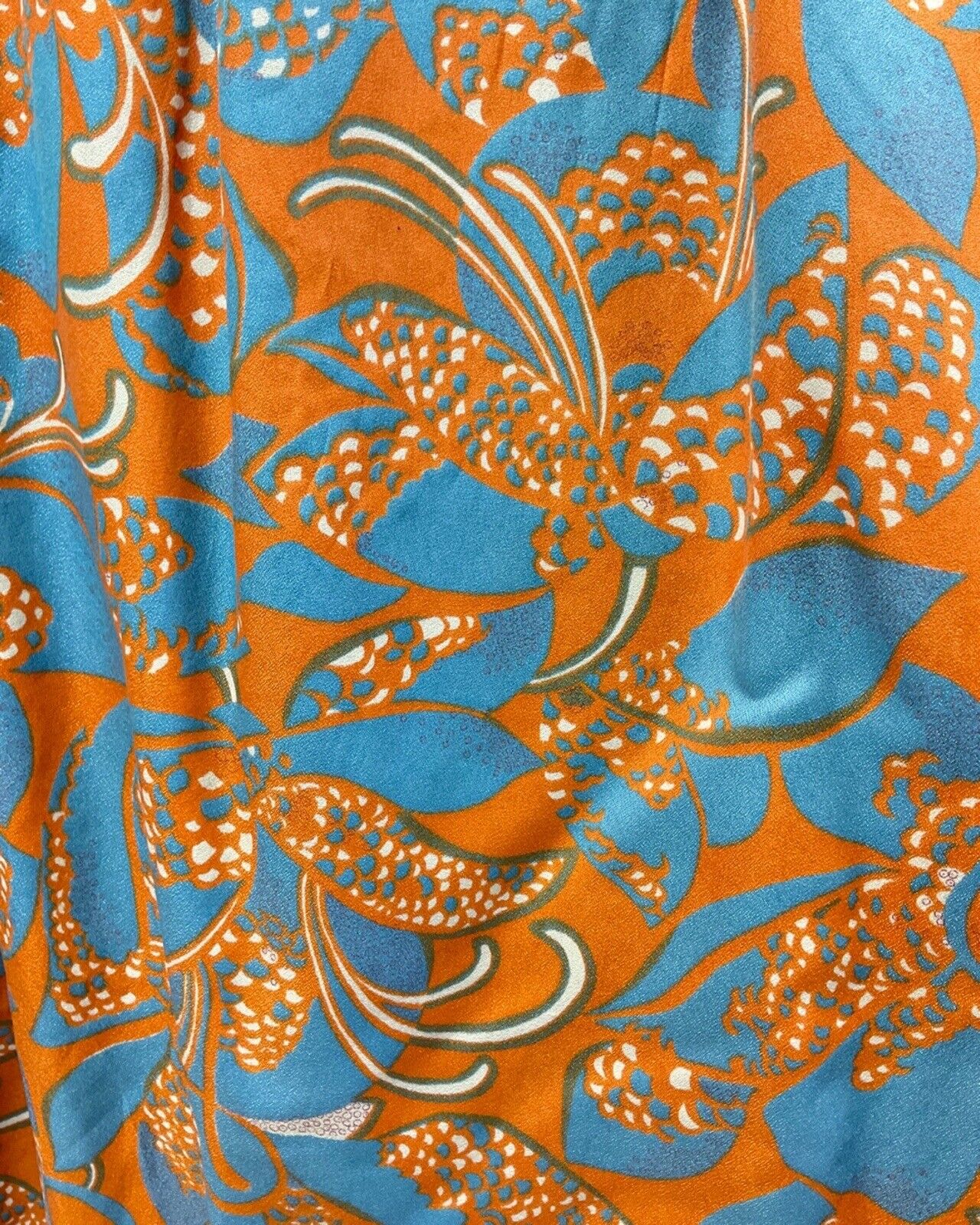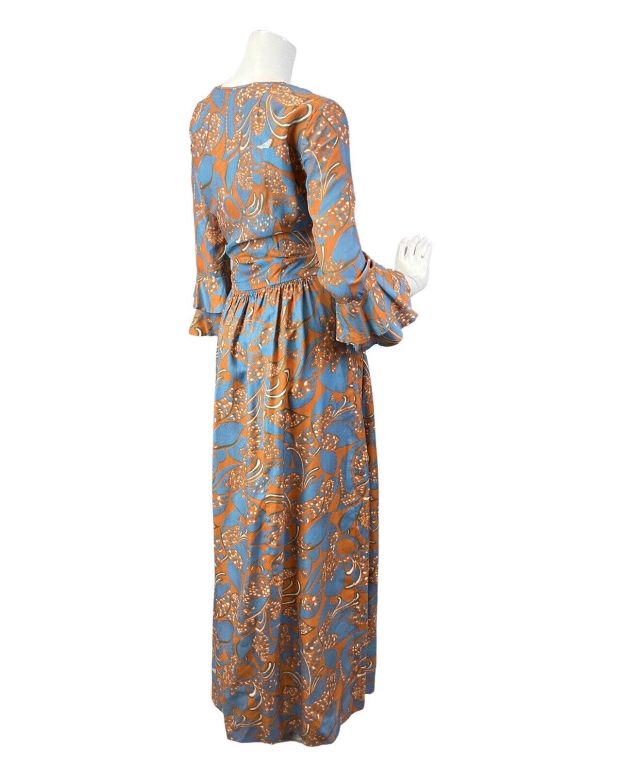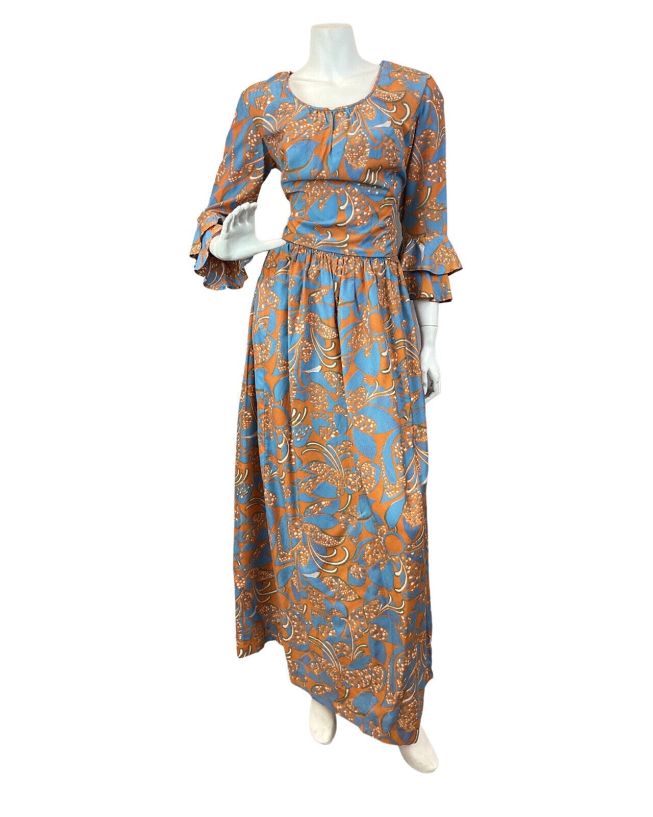 VINTAGE 60s 70s BLUE ORANGE PSYCHEDELIC FLORAL FLOUNCE SLEEVE MOD MAXI DRESS 12