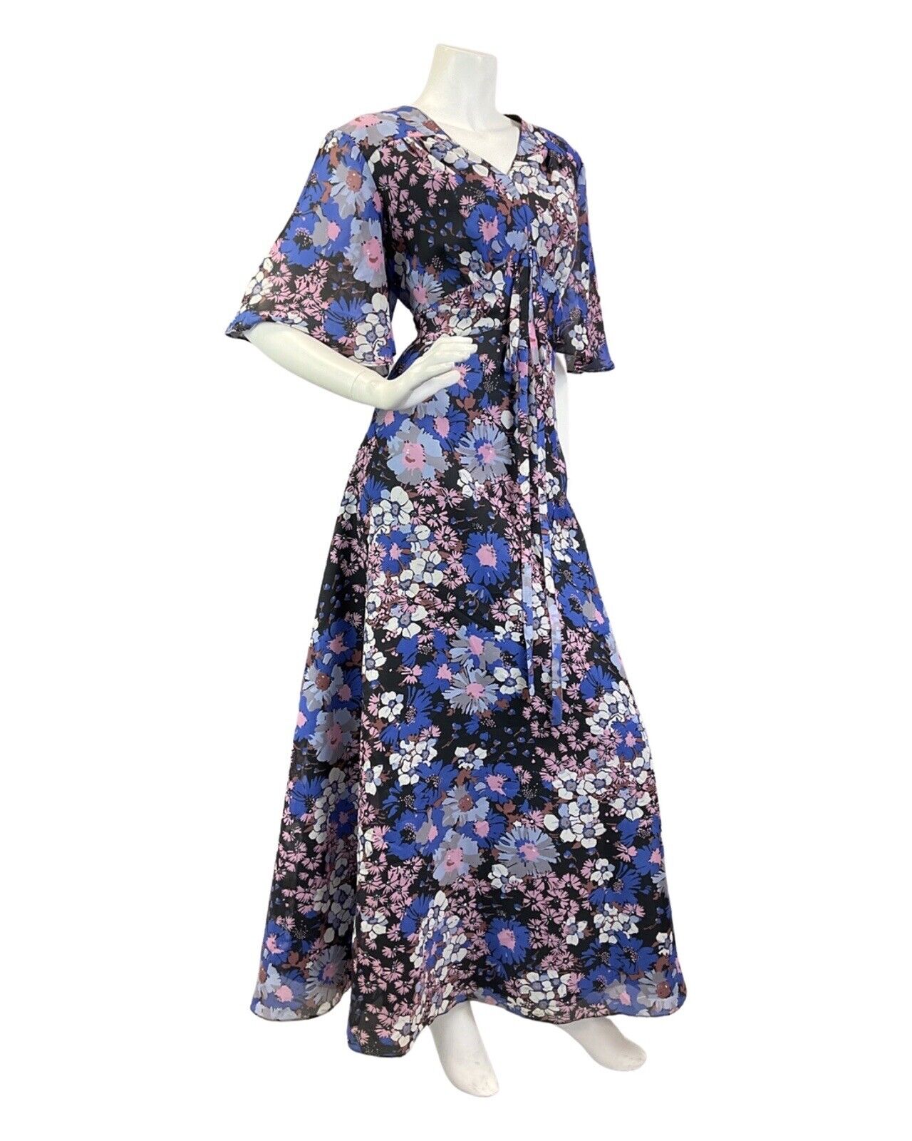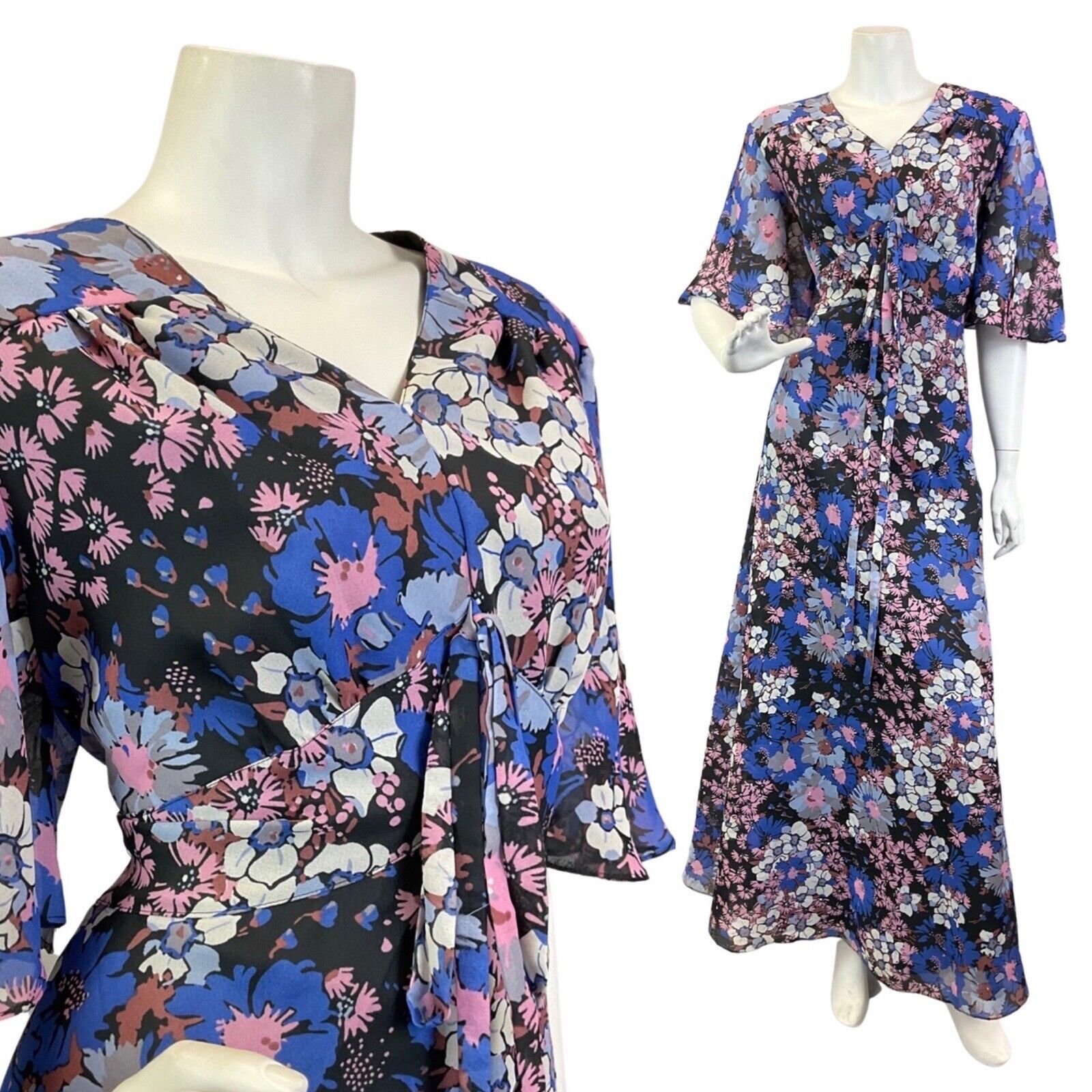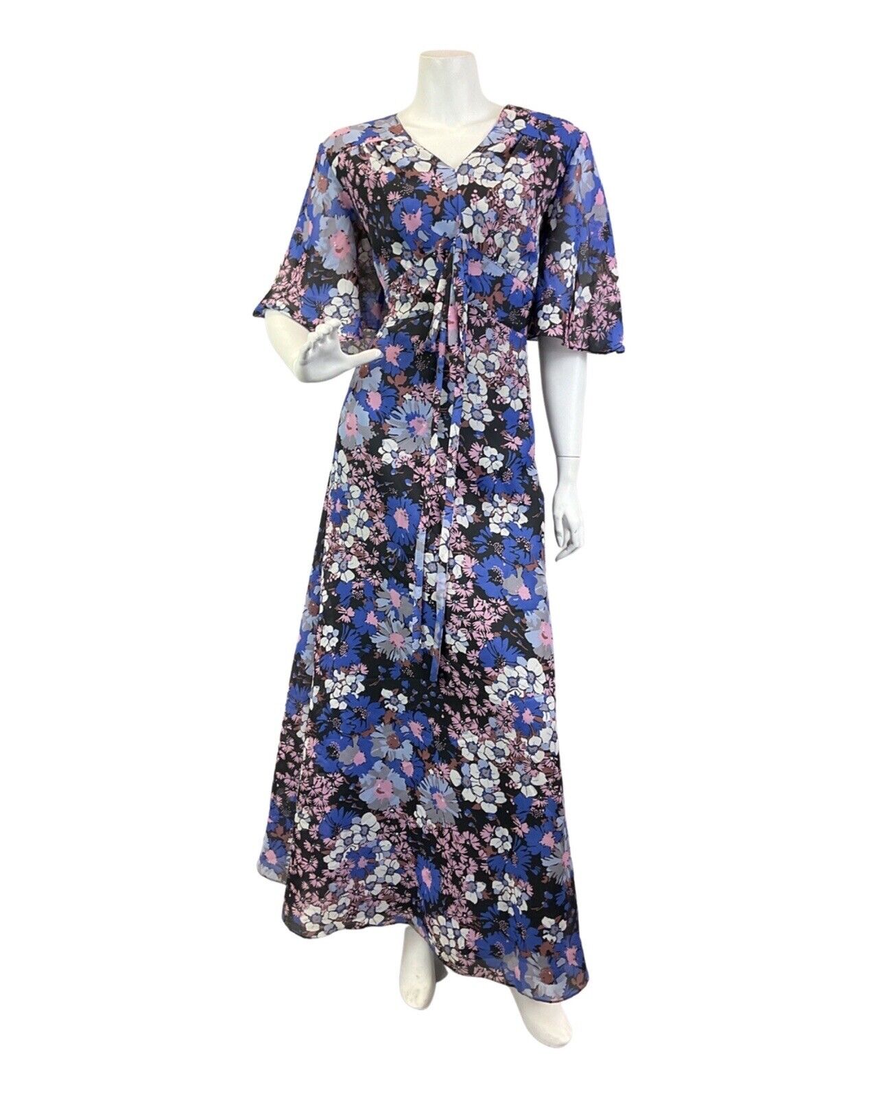 VINTAGE 60s 70s BLUE PINK BLACK FLORAL CAPE SLEEVE SUMMER MAXI DRESS 16 18